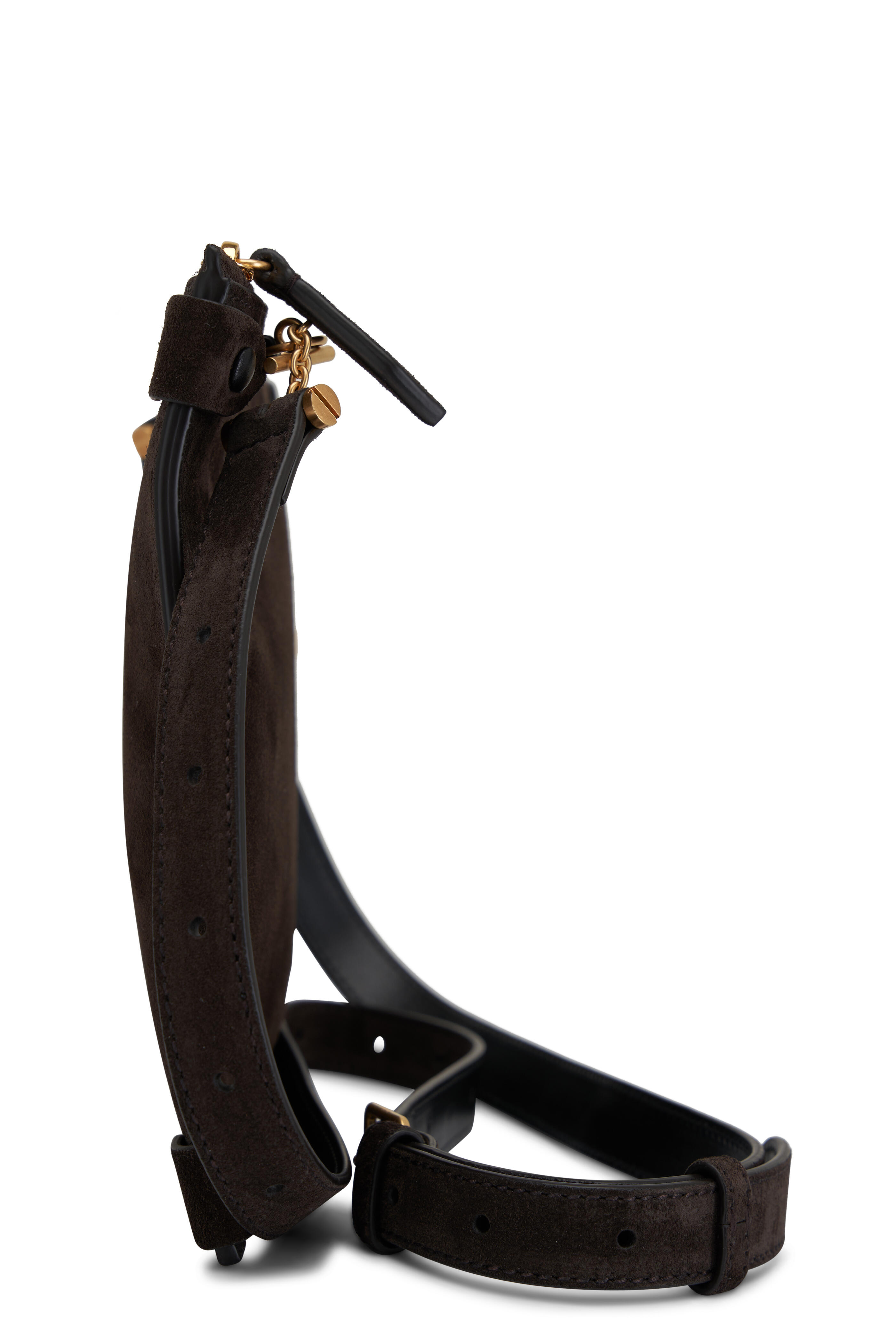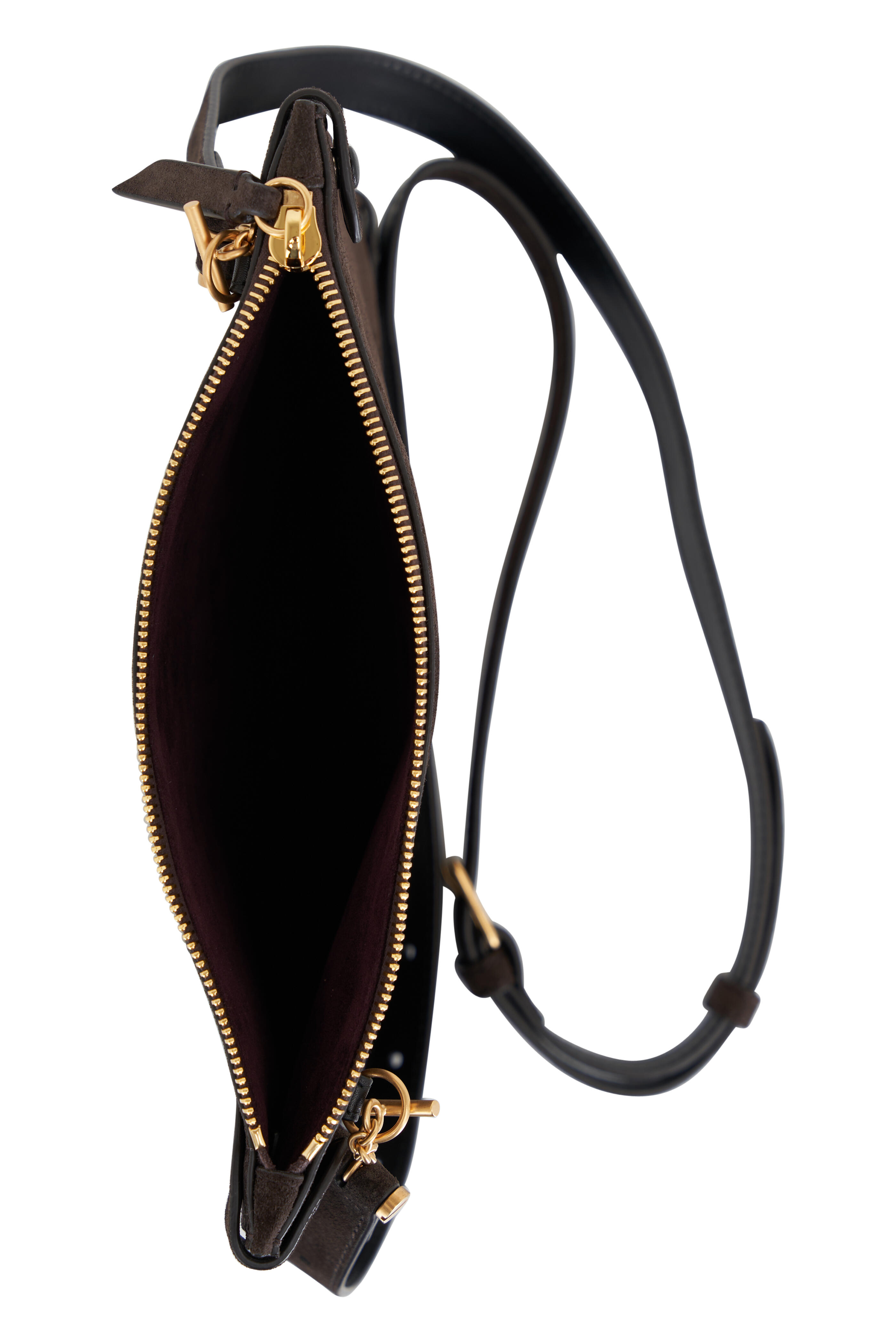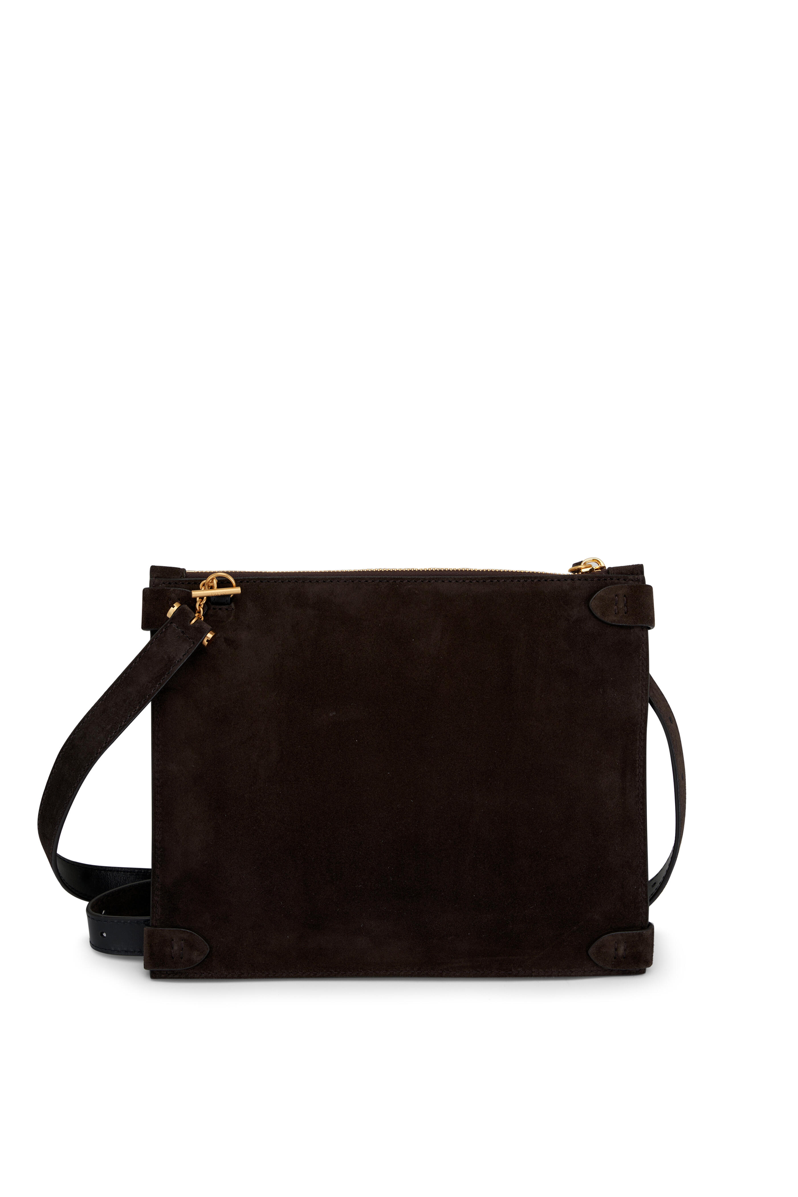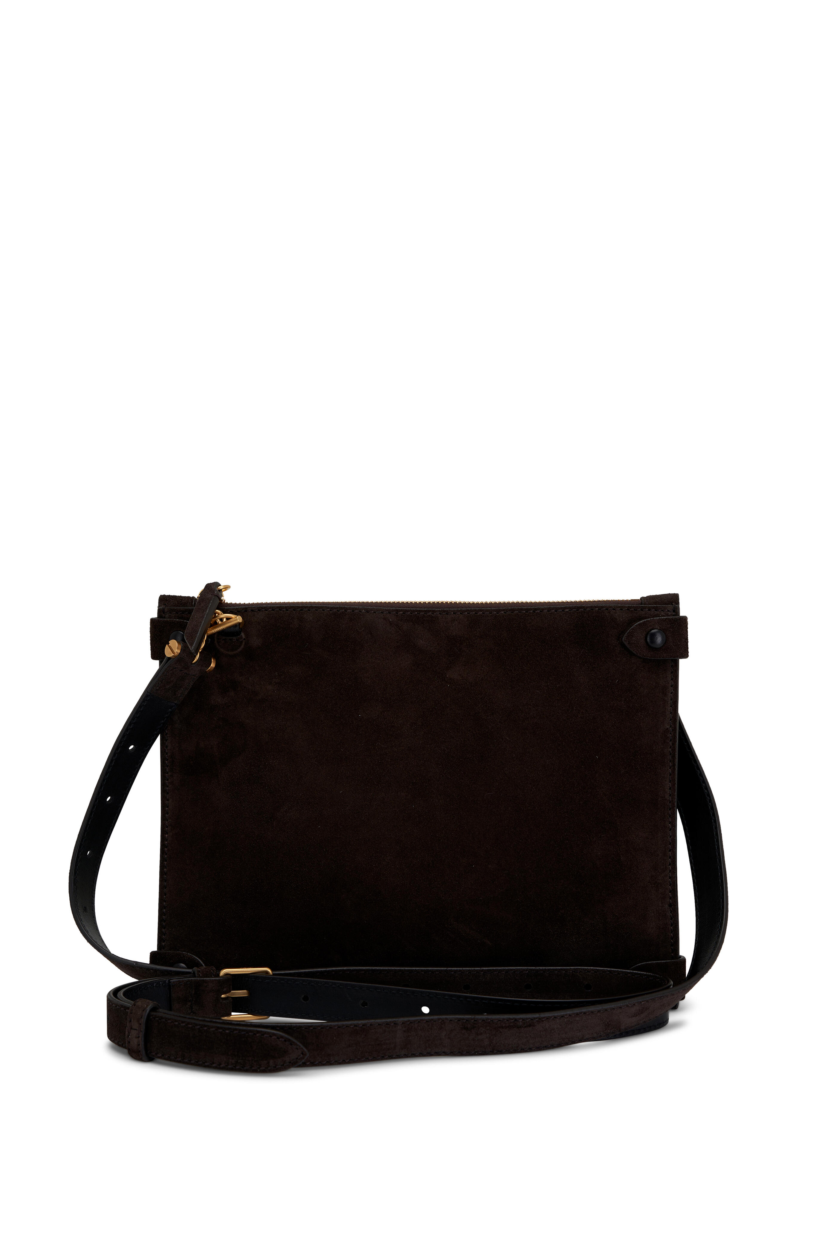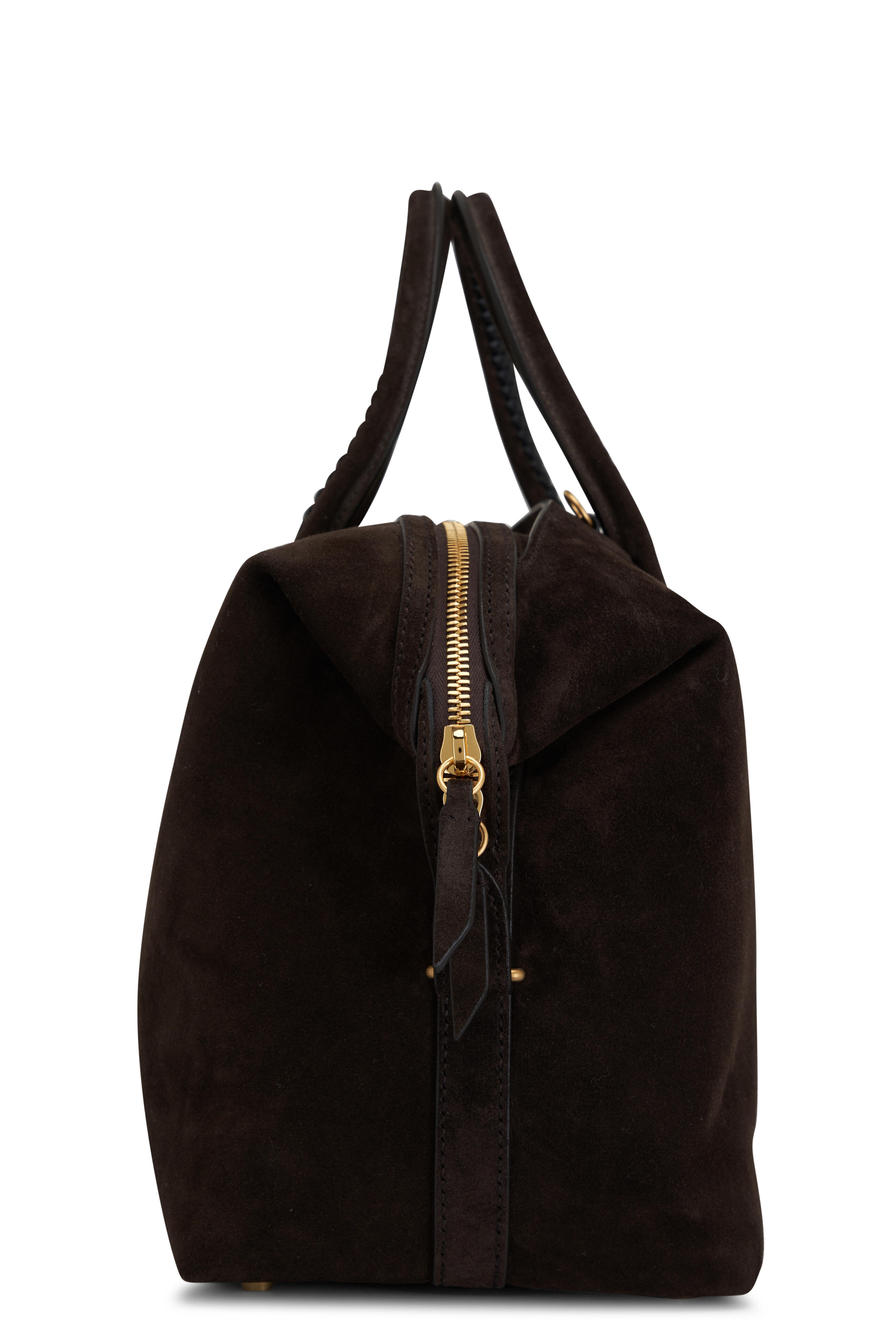 Italian suede. Hand braided leather handles; detachable and adjustable crossbody strap. Exterior hidden magnetic pocket. Interior zip pocket and snap pockets. Snap-out interior zippered pouch that converts to a crossbody bag. Fits up to a 13" laptop. Made in Italy. Width 14.6". Depth 6.5". Height 10.4" expanded / 8.2" collapsed. Handle Drop 5.5". Compatible with the Stowaway (sold separately).