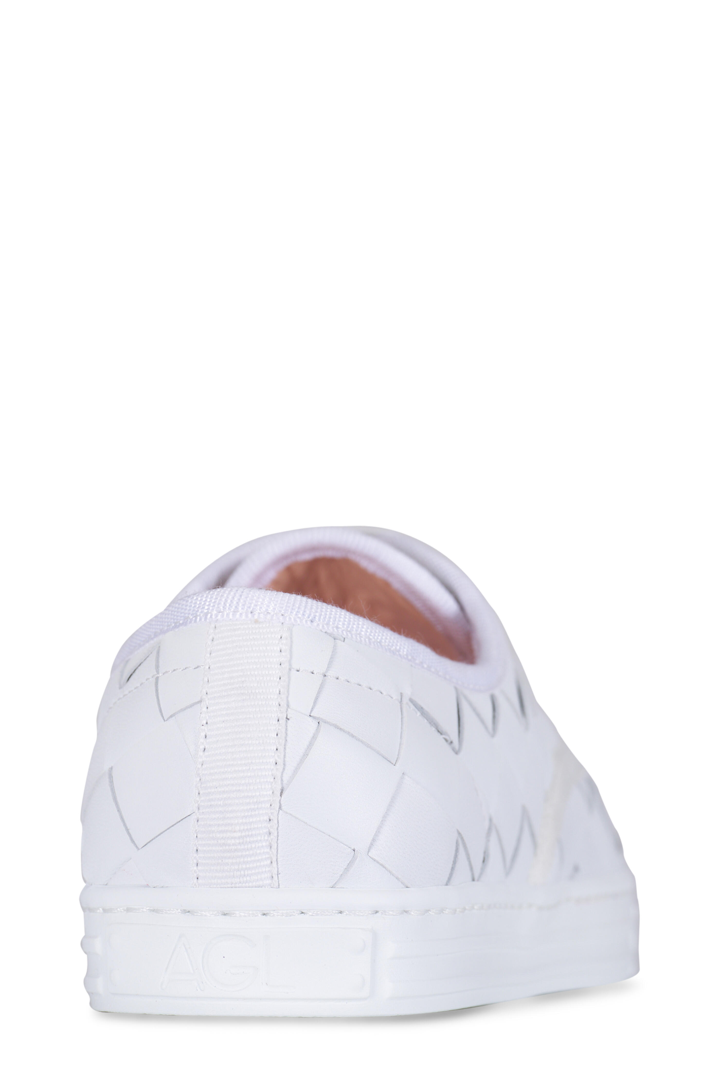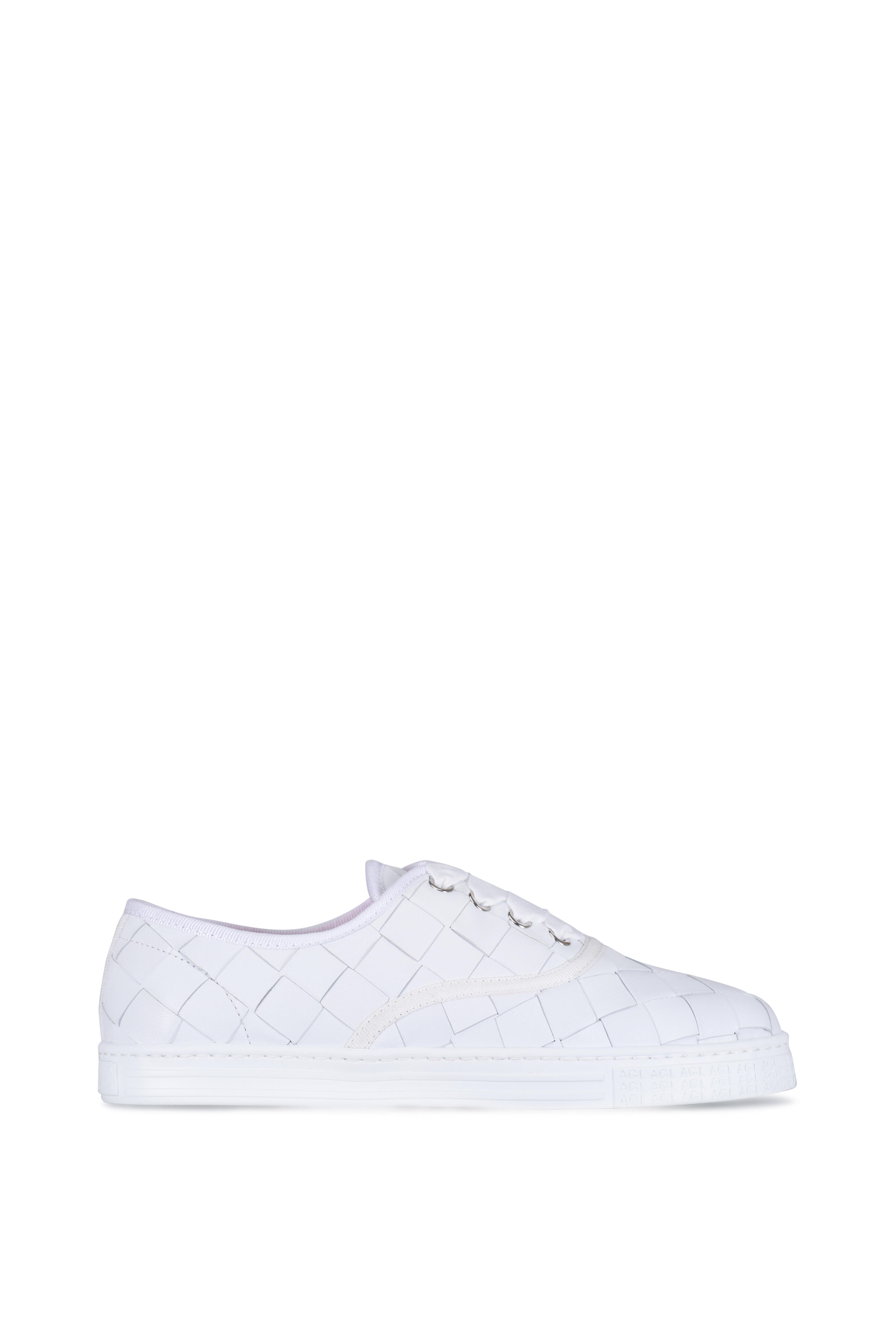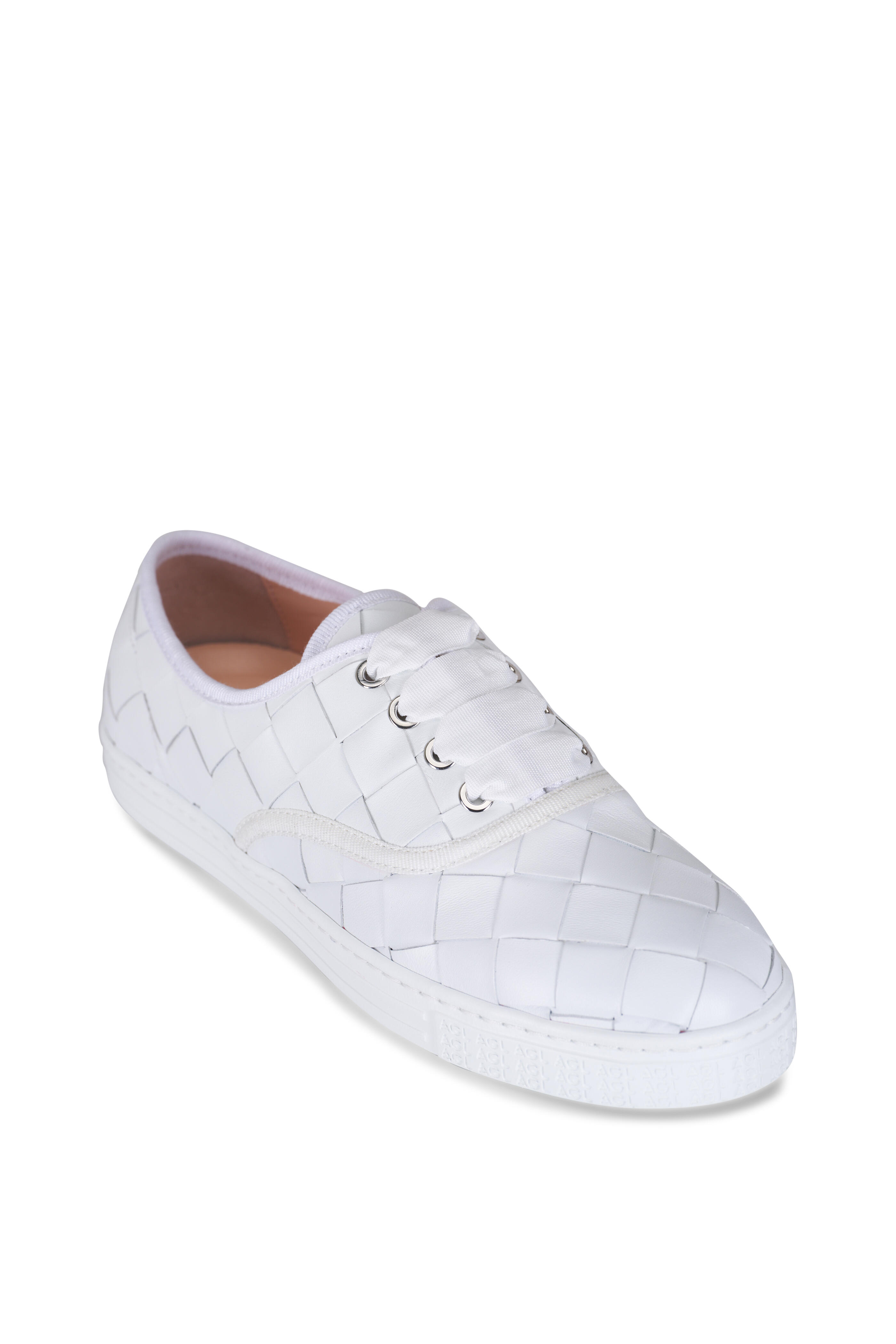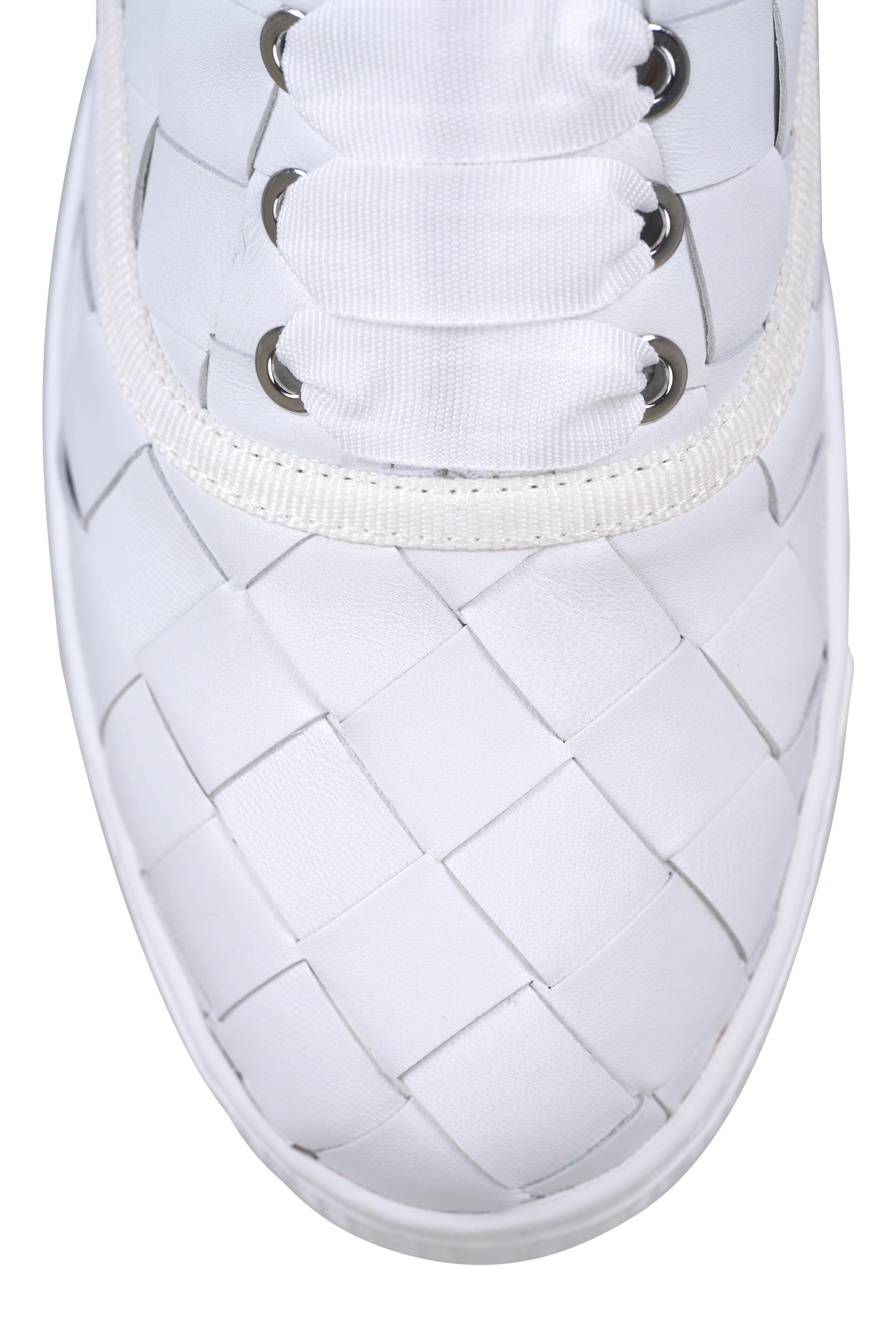 Woven leather upper. Round toe. Lace up closure. Cushioned insole; leather lining. Rubber sole. Made in Italy.
