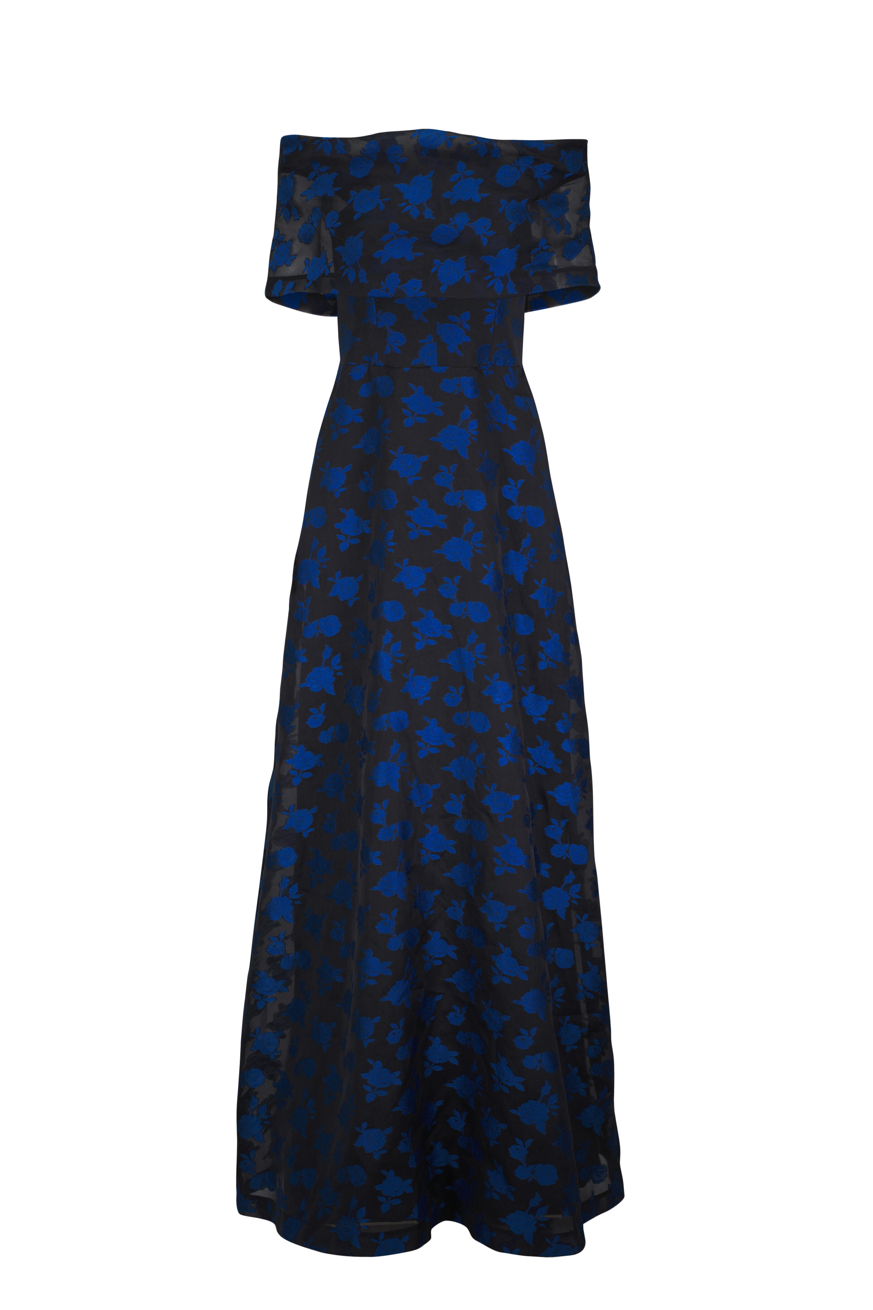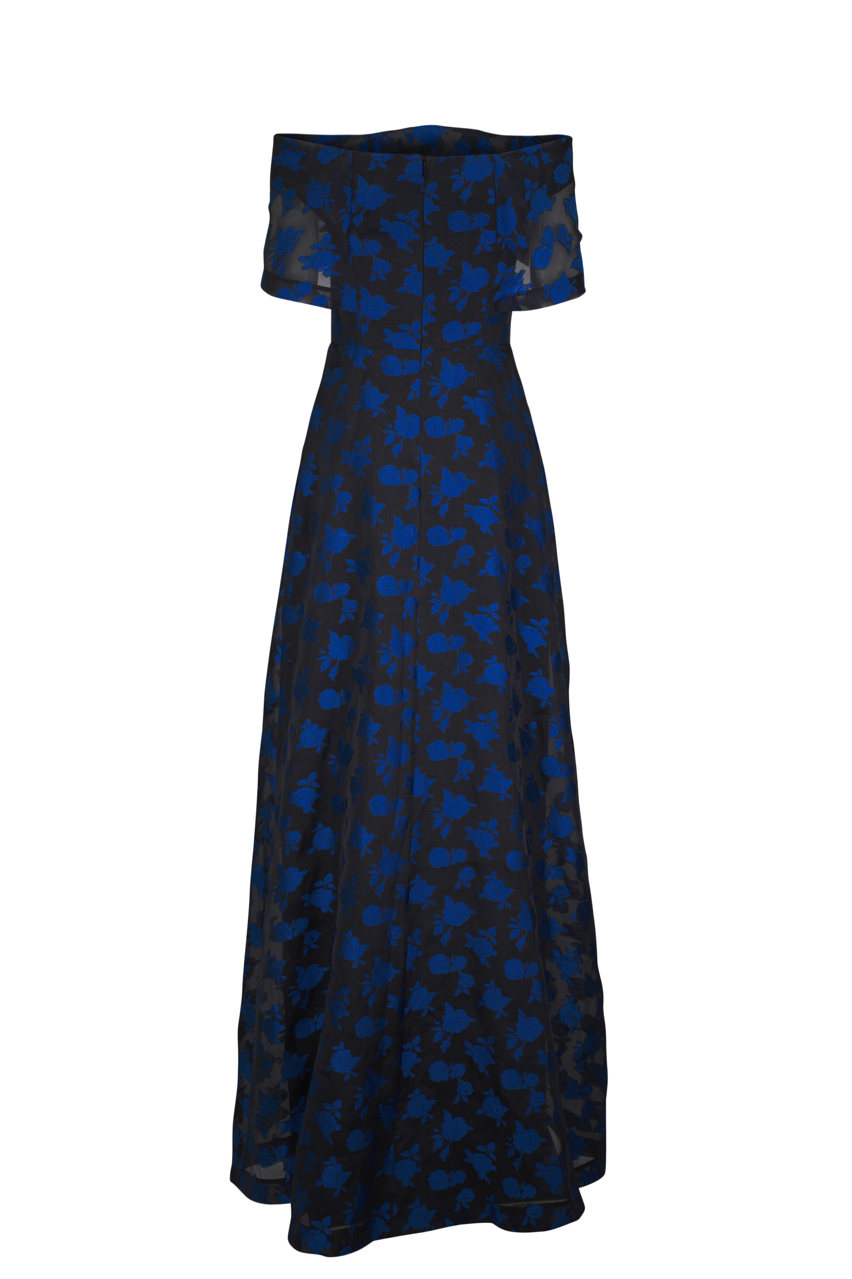 Off the shoulder. Concealed back zip. Capelet sleeve overlay. Made in the USA. About 62" shoulder to hem. 80% silk, 20% polyester; Lined. Dry clean.