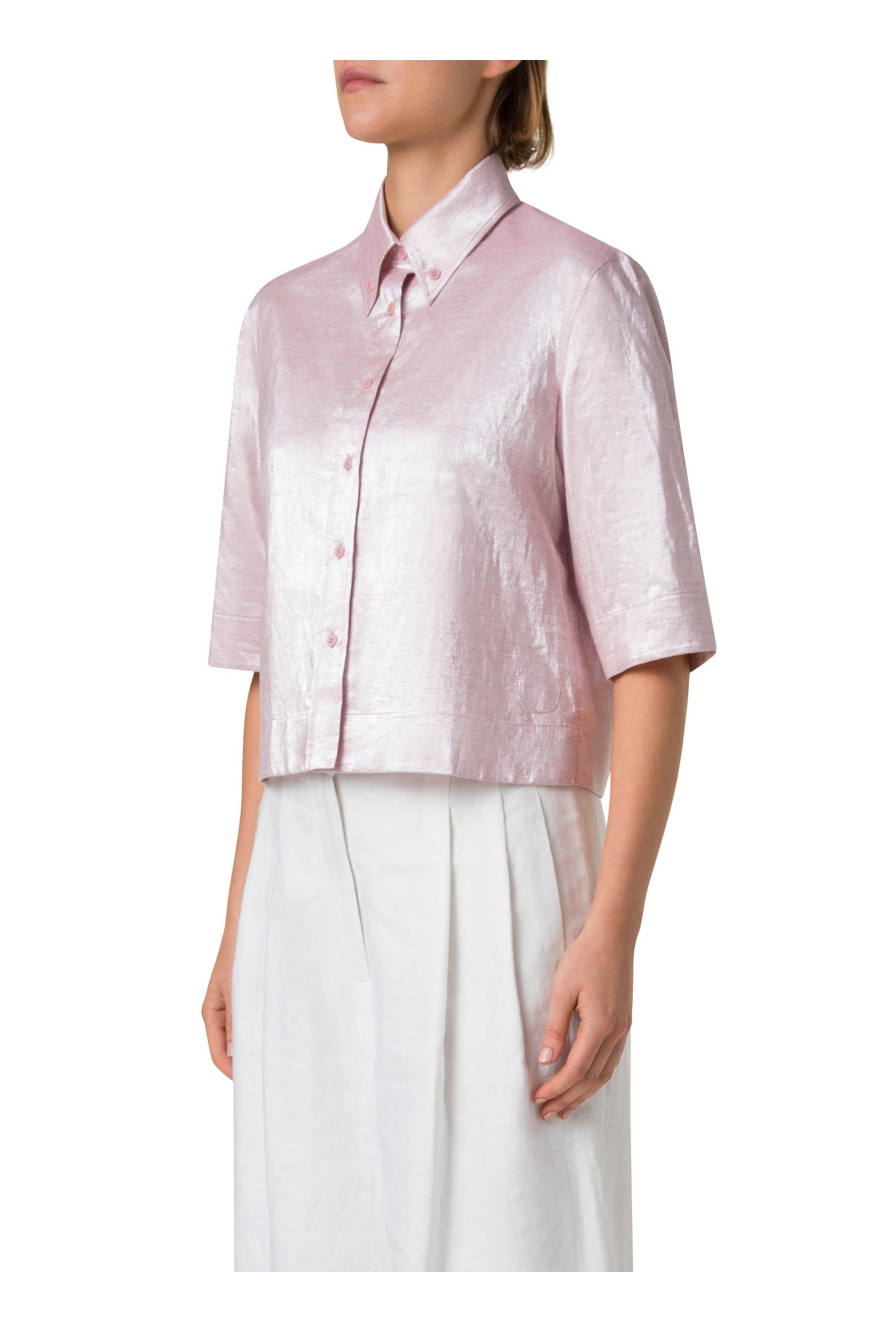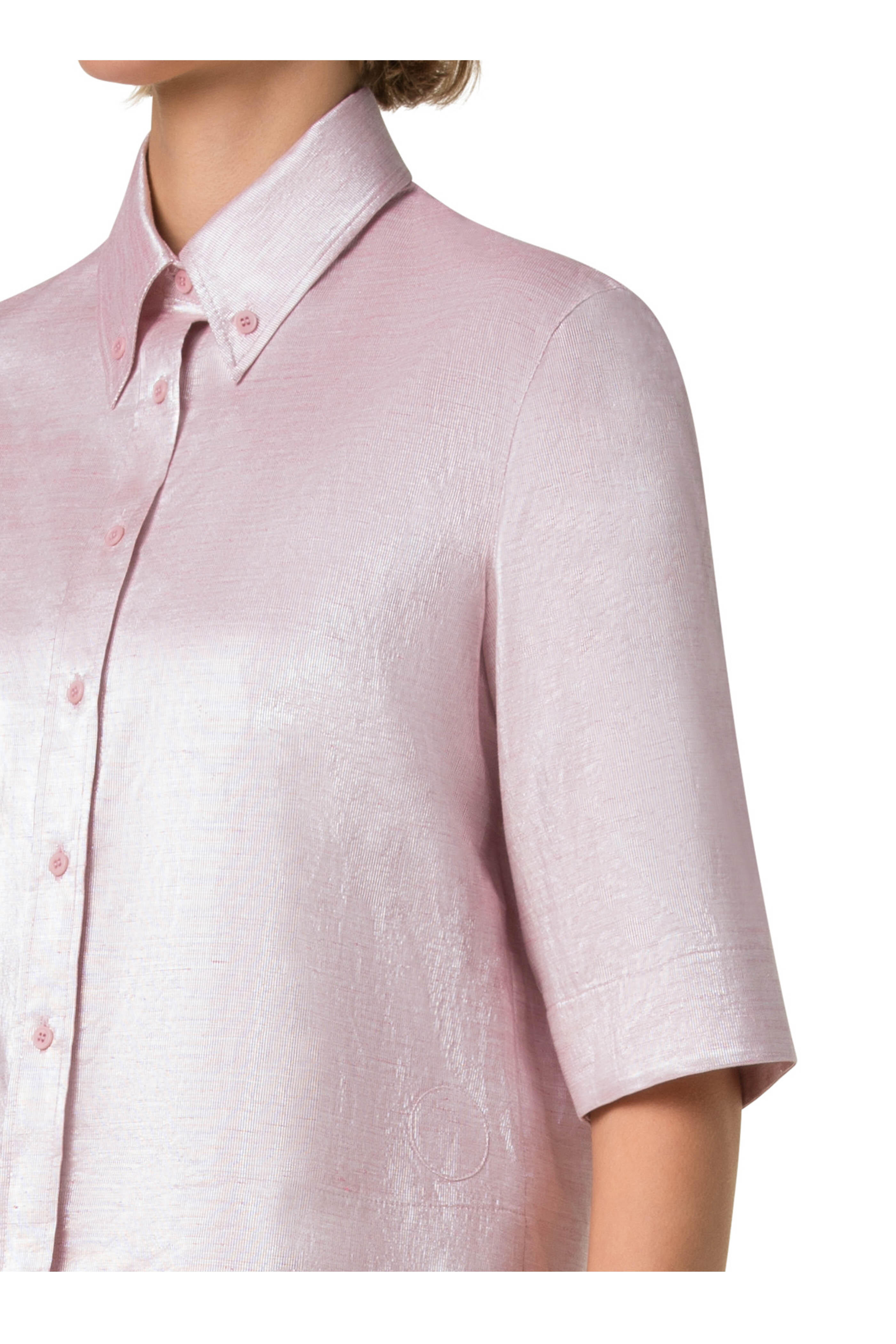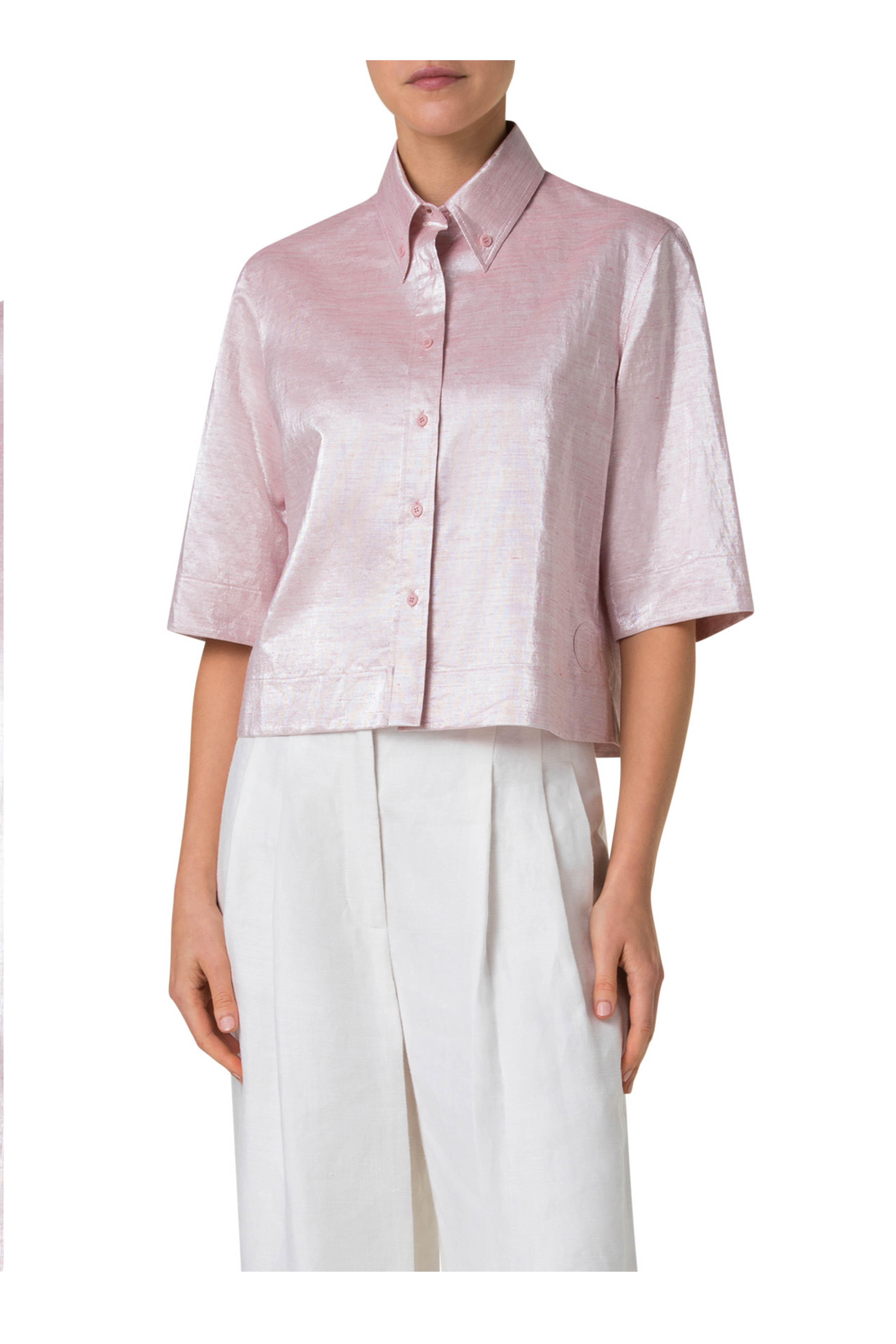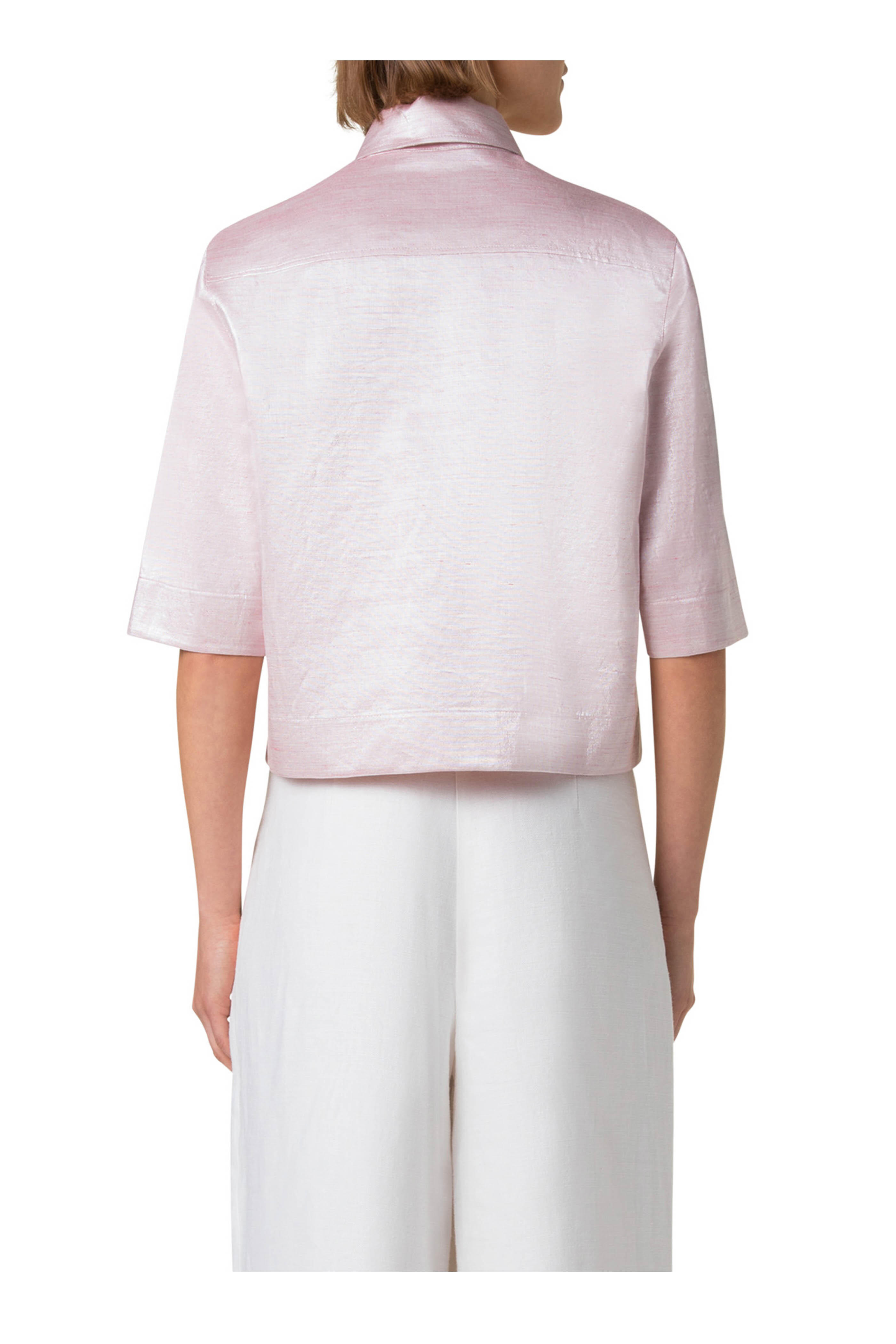Pointed button collar. Front button placket. Elbow length sleeves. Imported. 46% cotton, 43% linen, 11% metallic fibers. Dry clean.