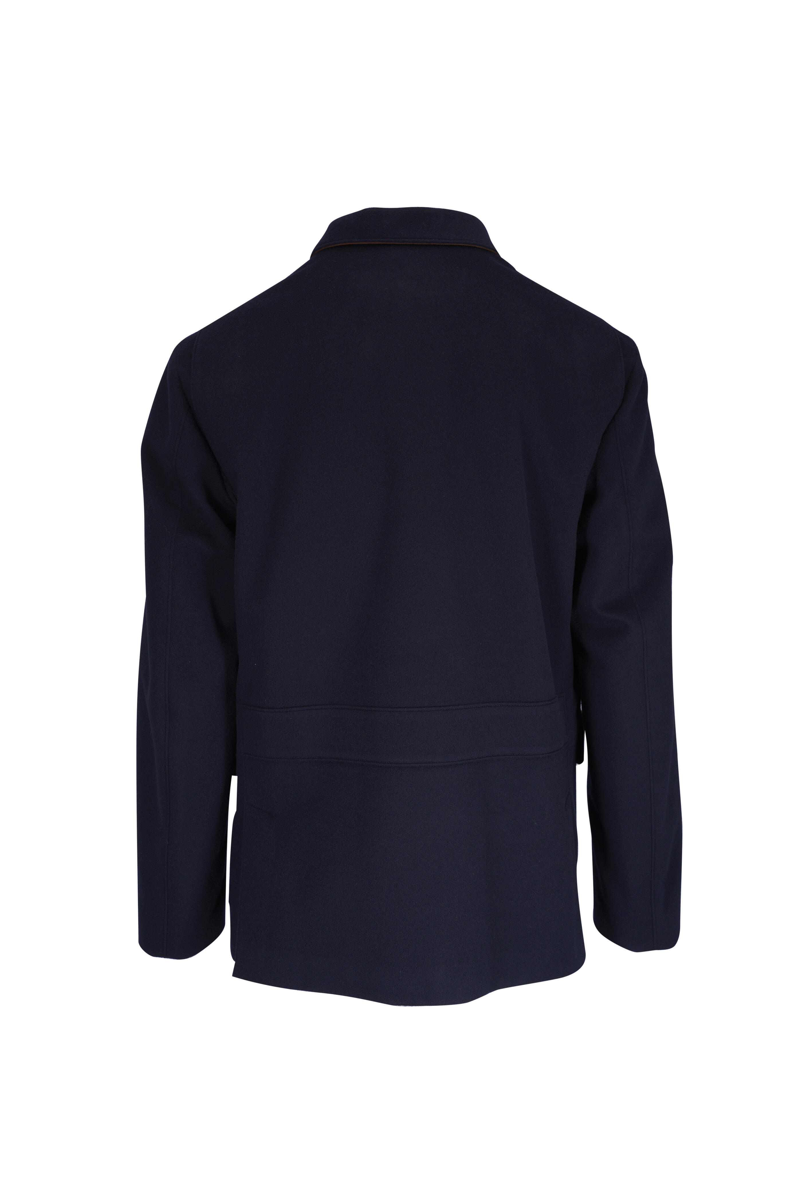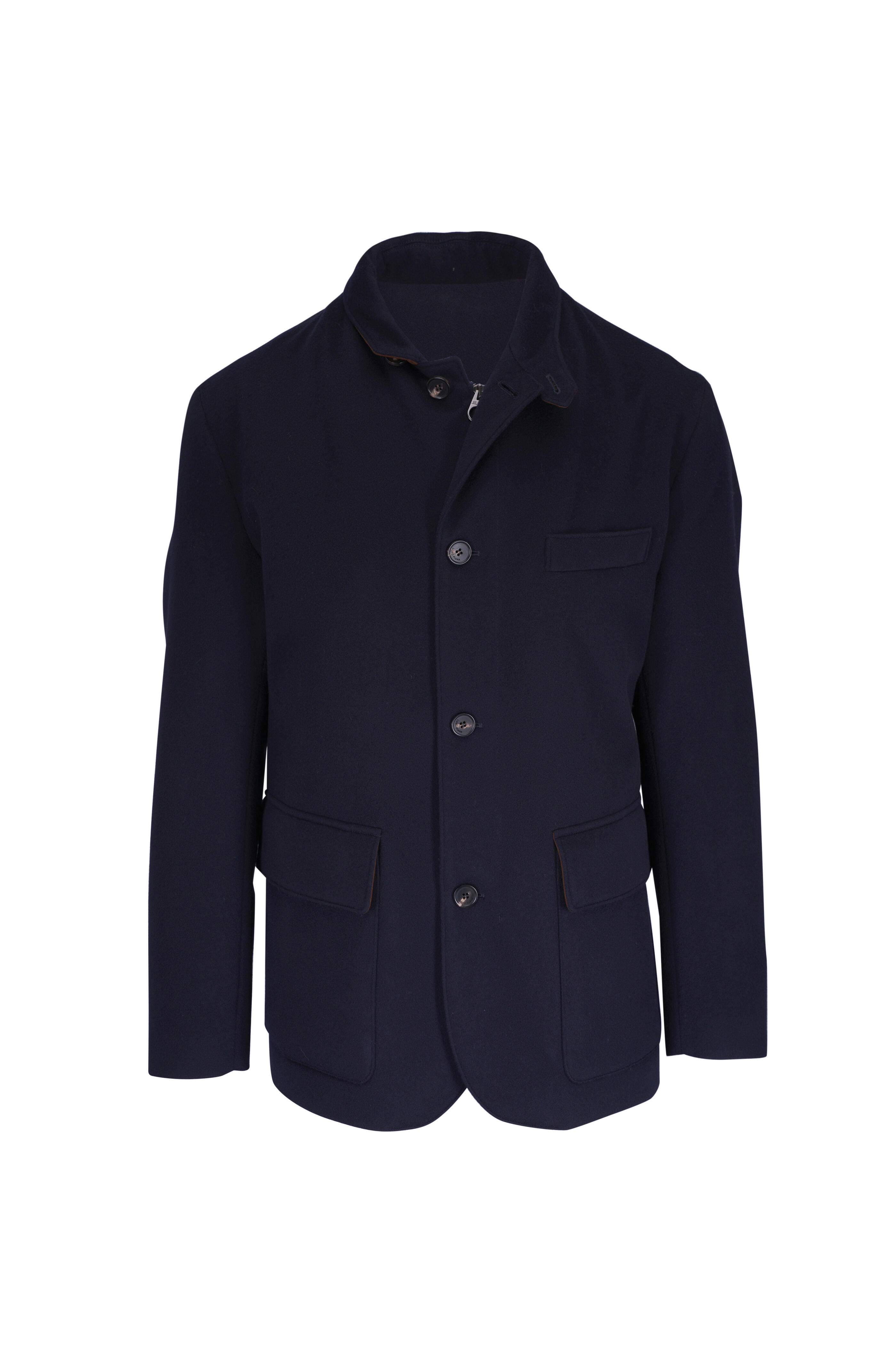 Stand collar. Concealed two way zip placket; button placket. Chest welt pocket; lower flap pockets; internal slip pockets. Double back vents. Made in Italy. Shoulder to hem 31" (size 41 R). 100% cashmere; fully lined. Dry clean.