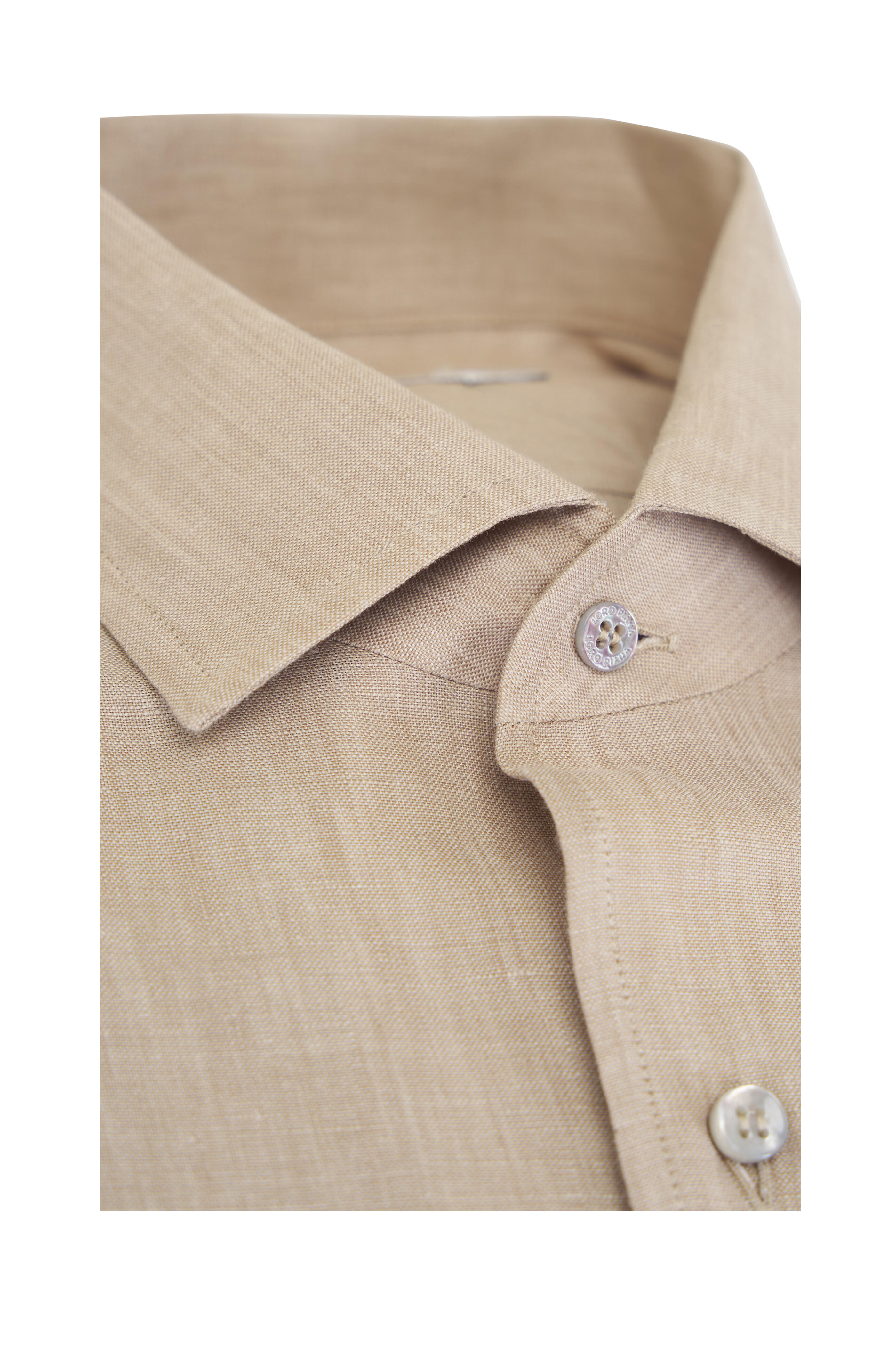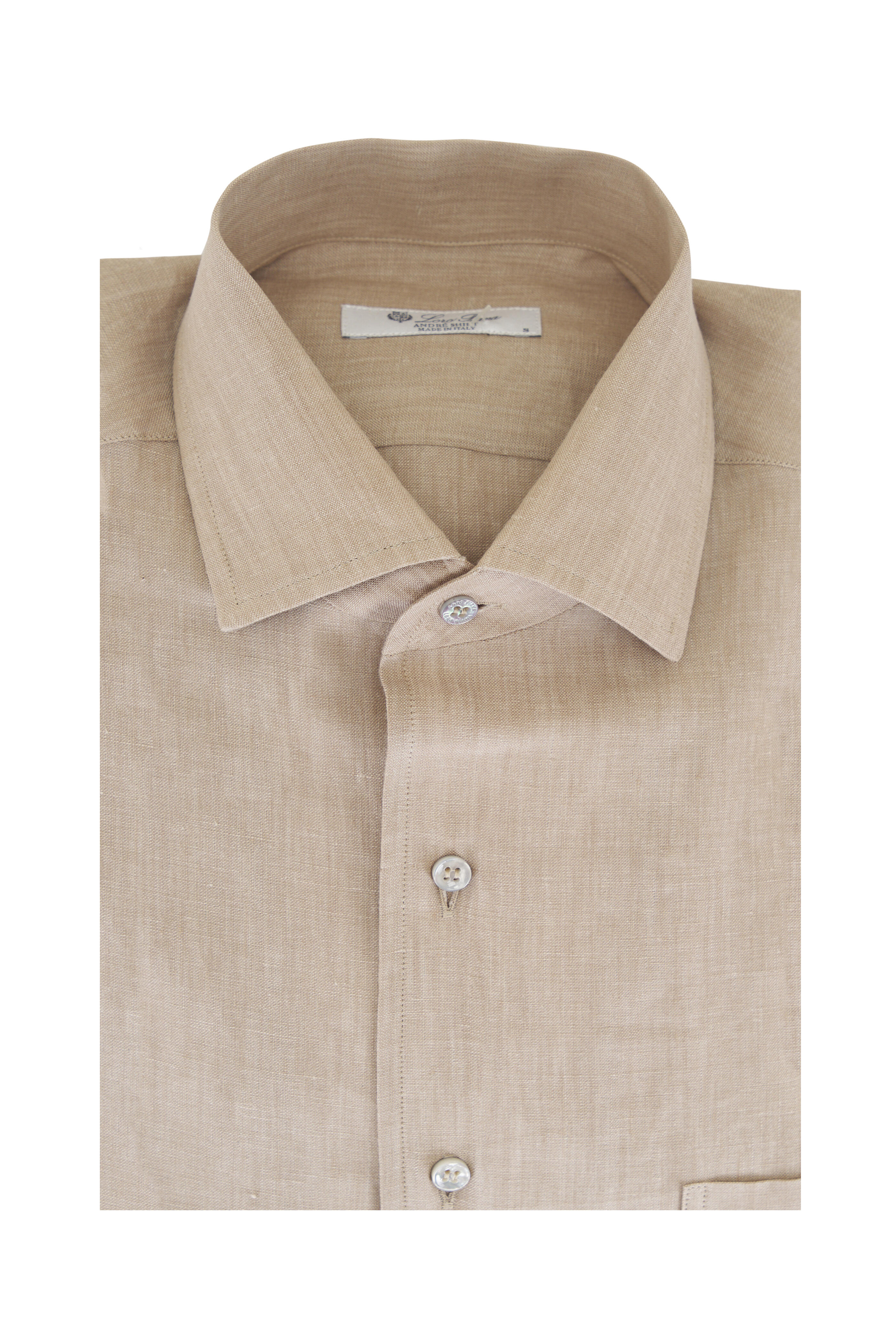 Spread collar. Adjustable button barrel cuffs. Chest patch pocket. Made in Italy. 100% linen. Dry clean.