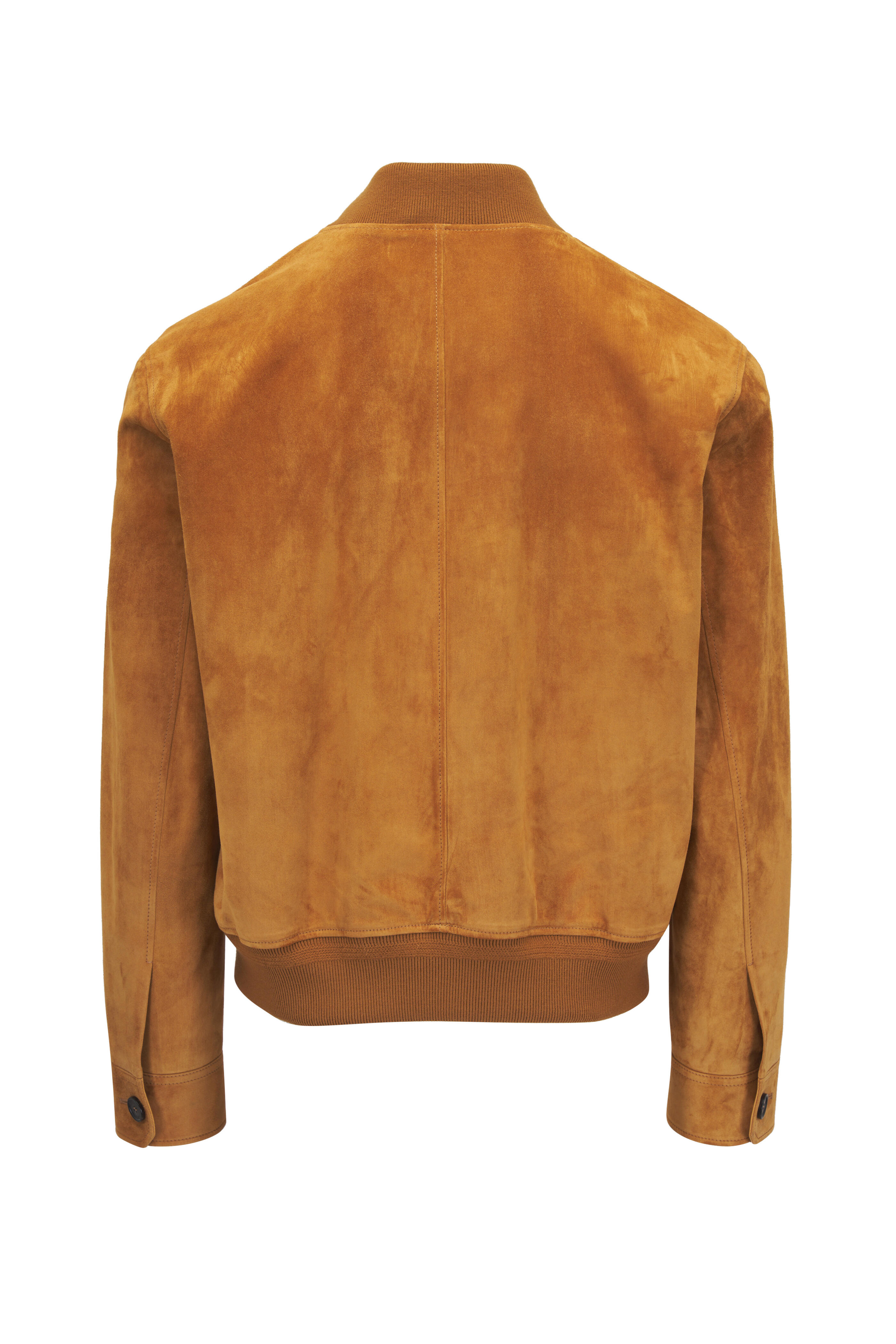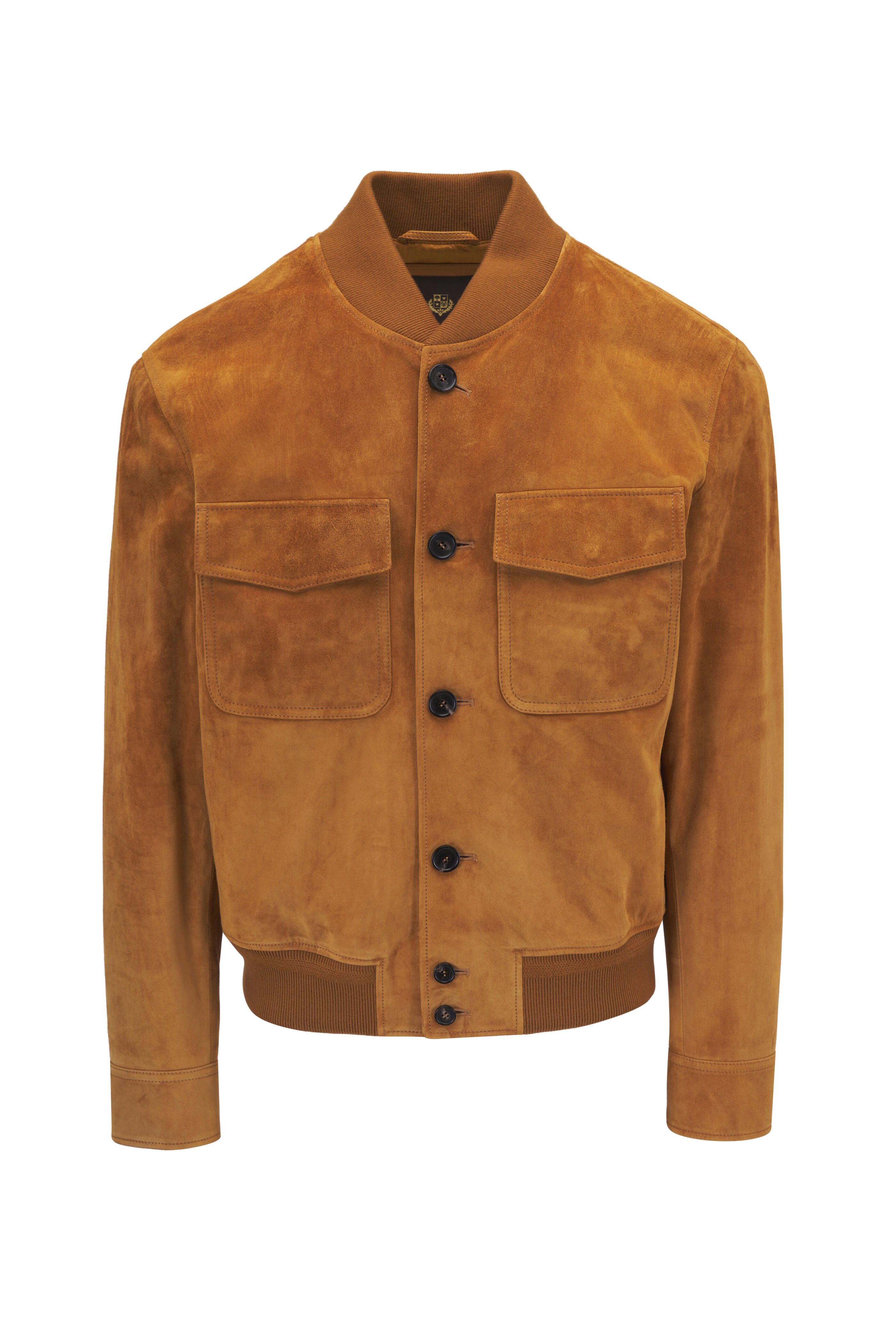 Specialist clean. Stand collar. Front button closure. Chest patch pockets. Single button barrel cuffs. Ribbed knit trim at collar and hem. Made in Italy. 100% suede; Lining: 100% linen.