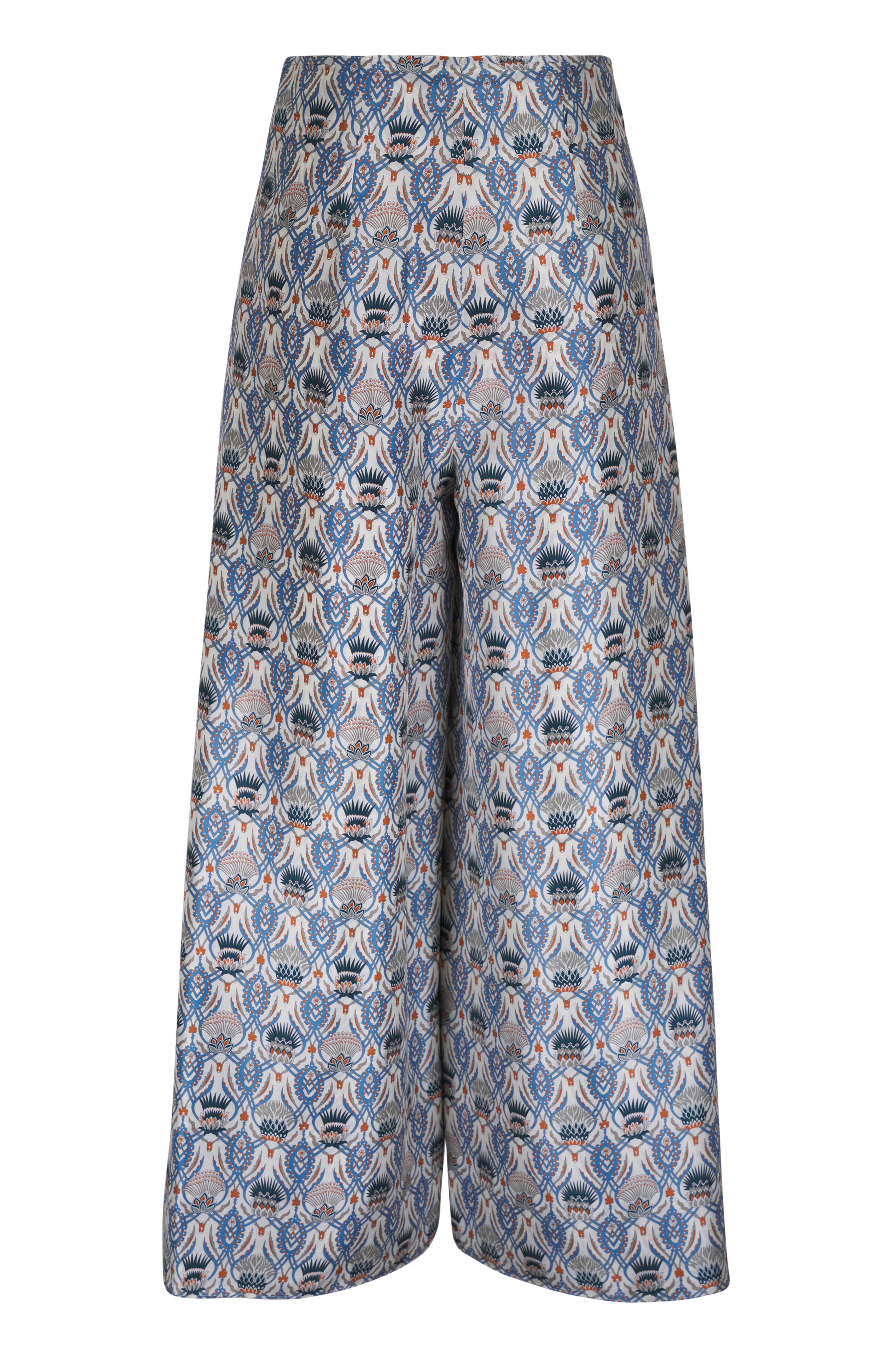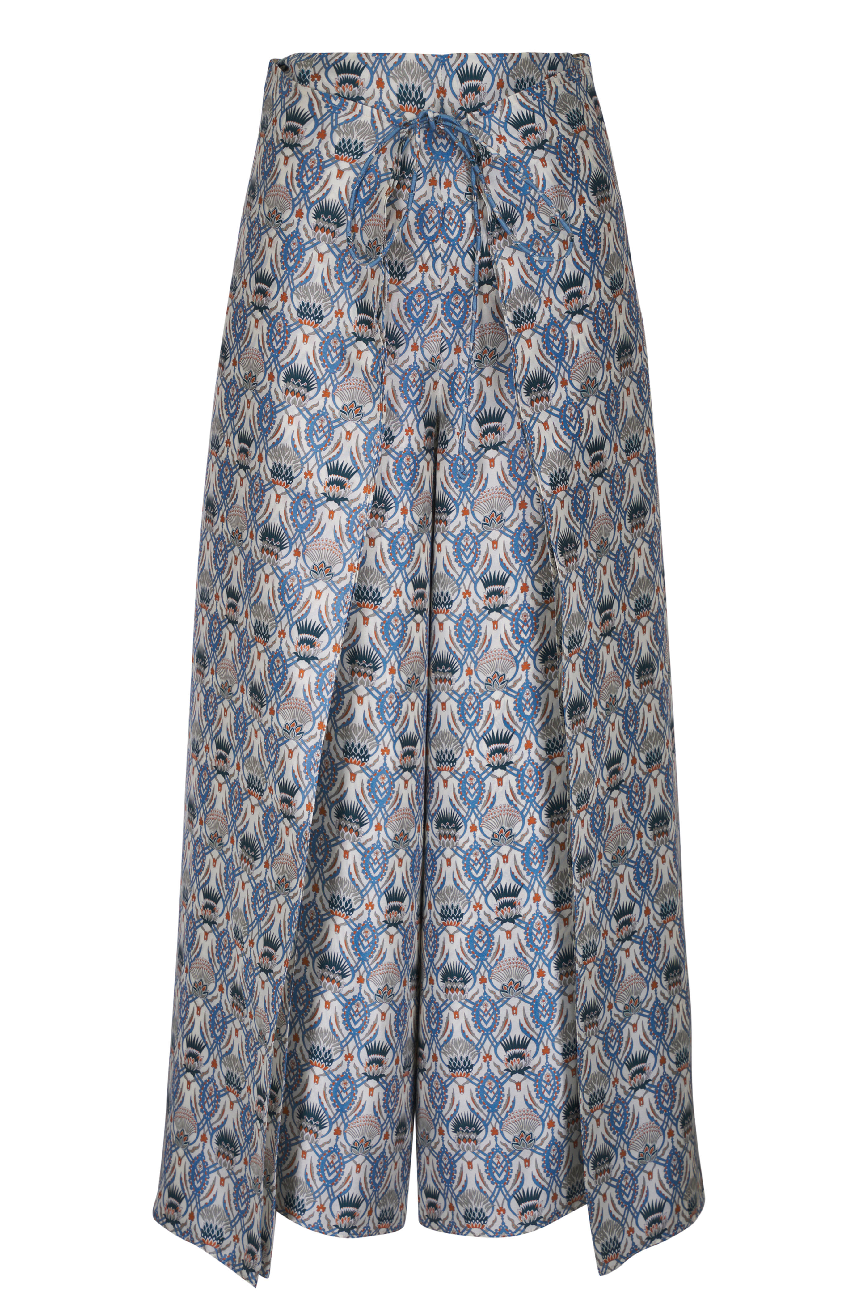 Concealed side zip closure. Wrap front with metal buttons and straps. Made in Italy. Color: Chalk/Deep Lagoon Water (T1N4). High-rise. Wide leg. 100% silk; unlined. Dry clean.