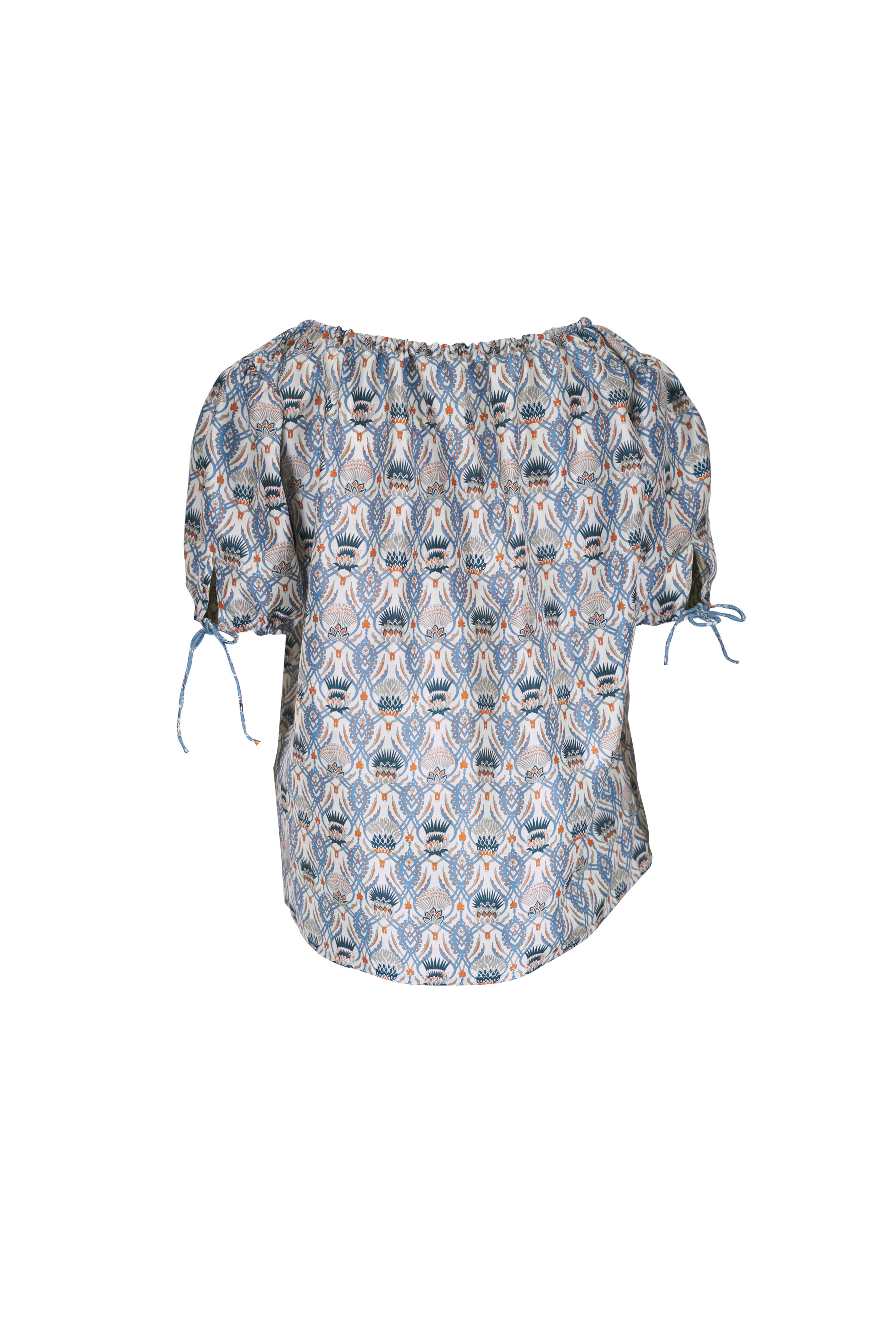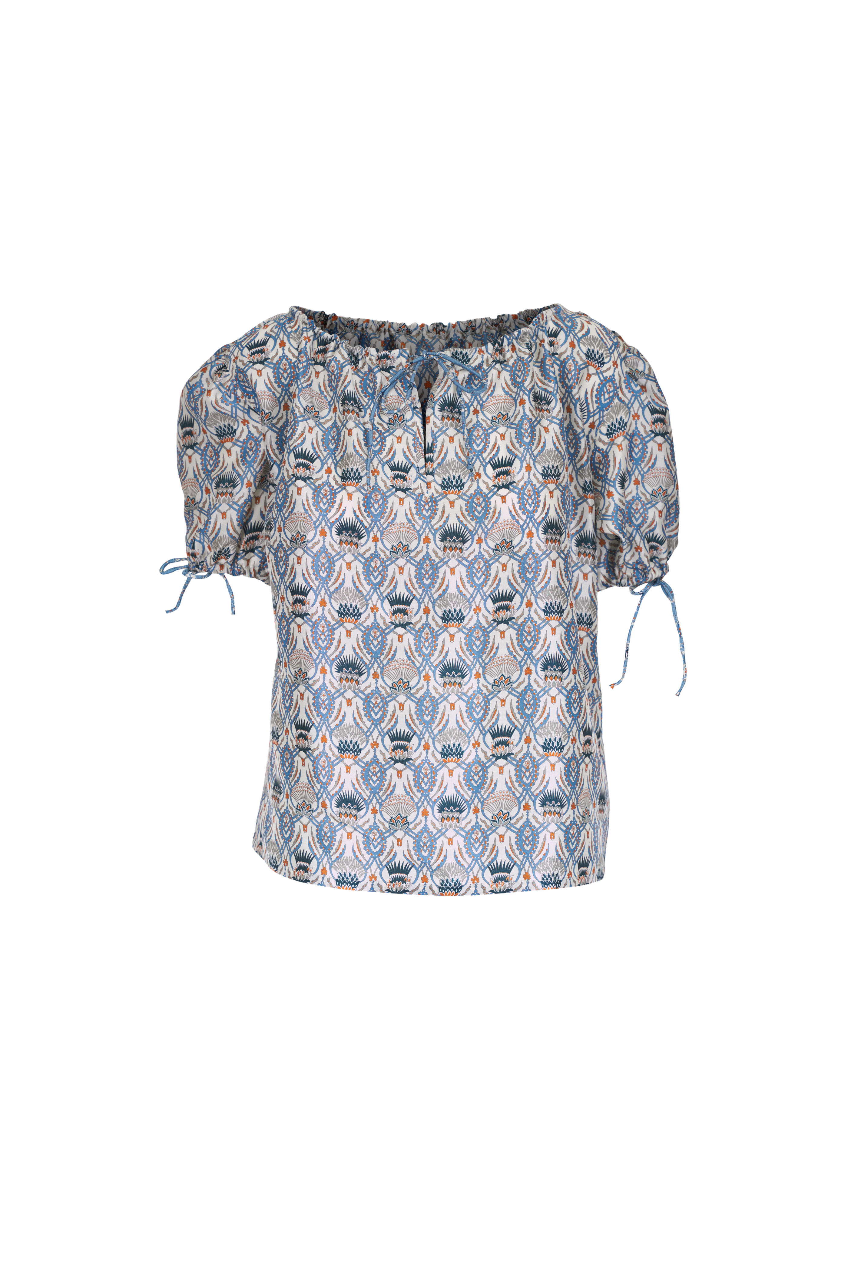 Front keyhole neckline. Self-tie; vented sleeves. Made in Italy. 100% silk. Dry clean.