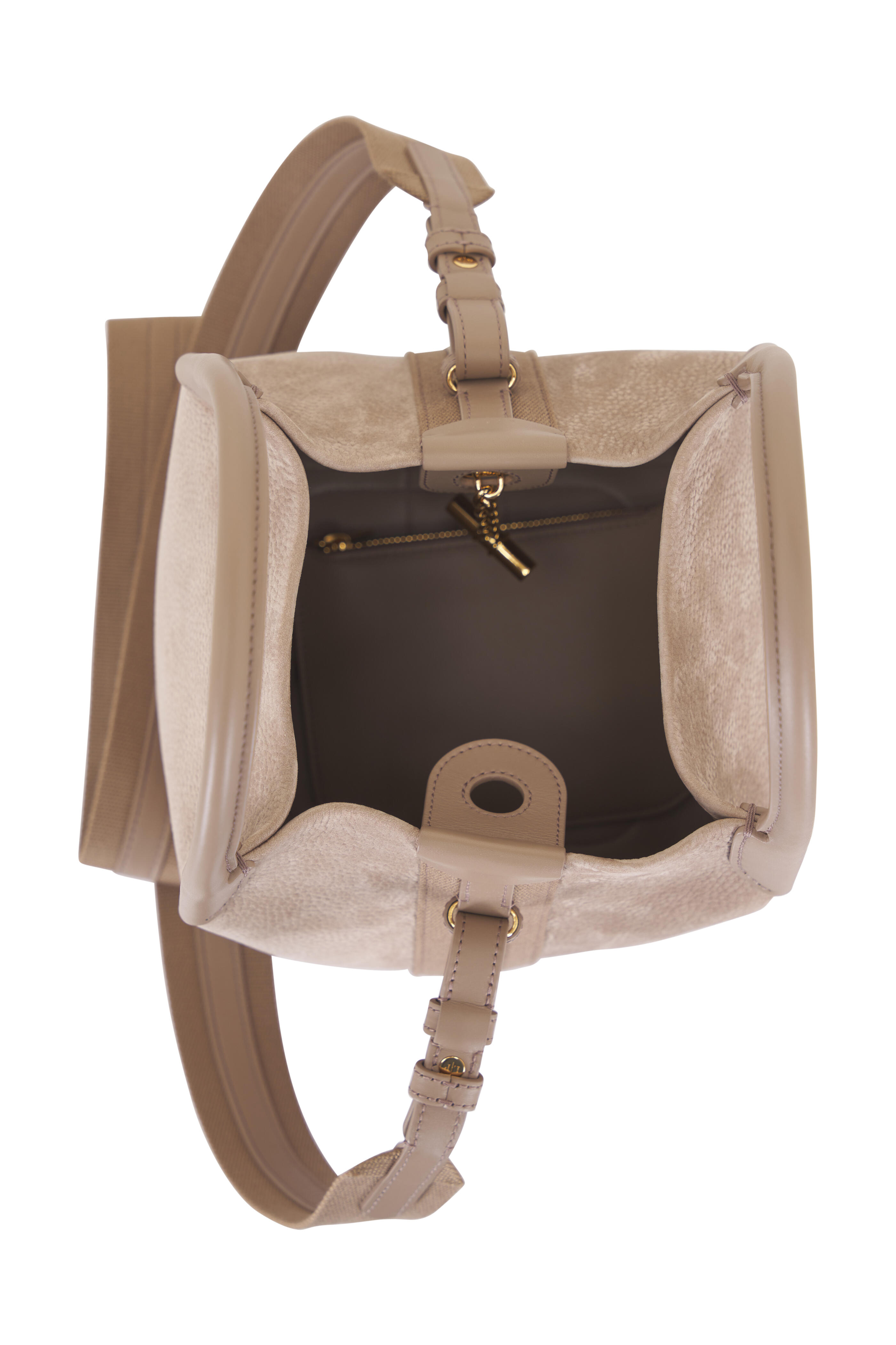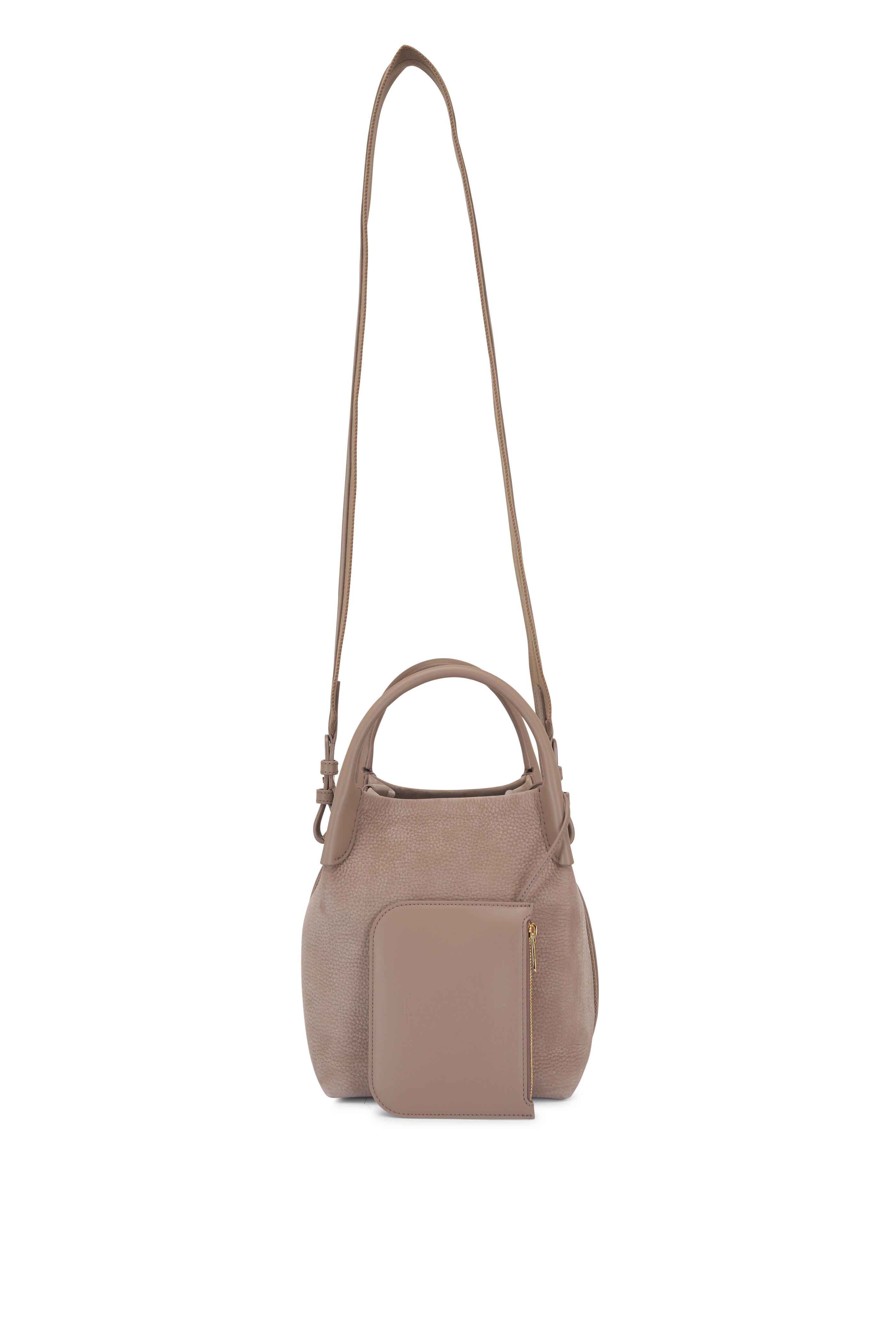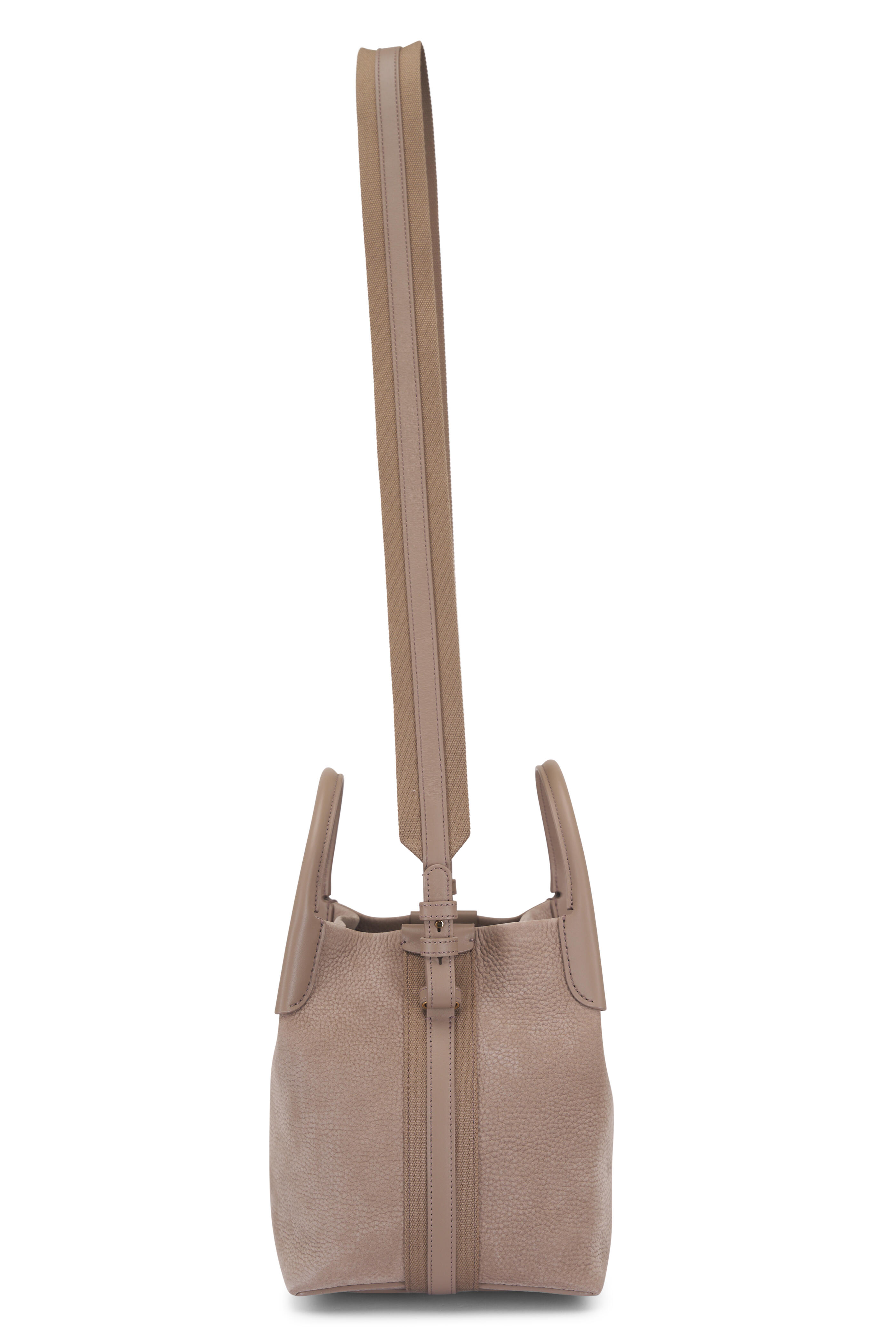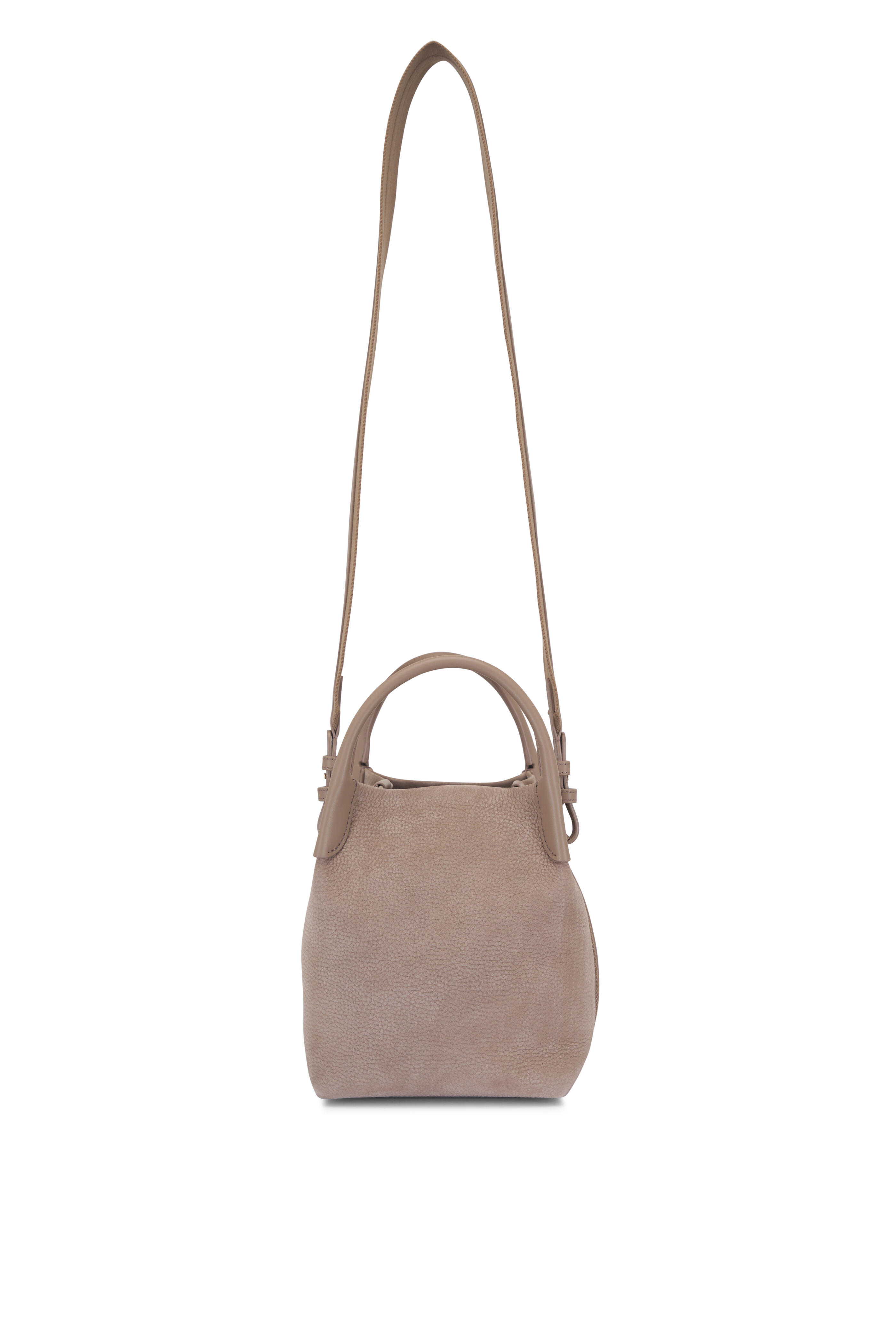 Nubuck leather. Adjustable removable shoulder strap. Single top handle. Top toggle closure. Removable inner leather pouch; attached to the bag with a toggle. Suede lining. Made in Italy. Size: Small 17 x 17 x 21 cm (6.7" x 6.7" x 8.3").