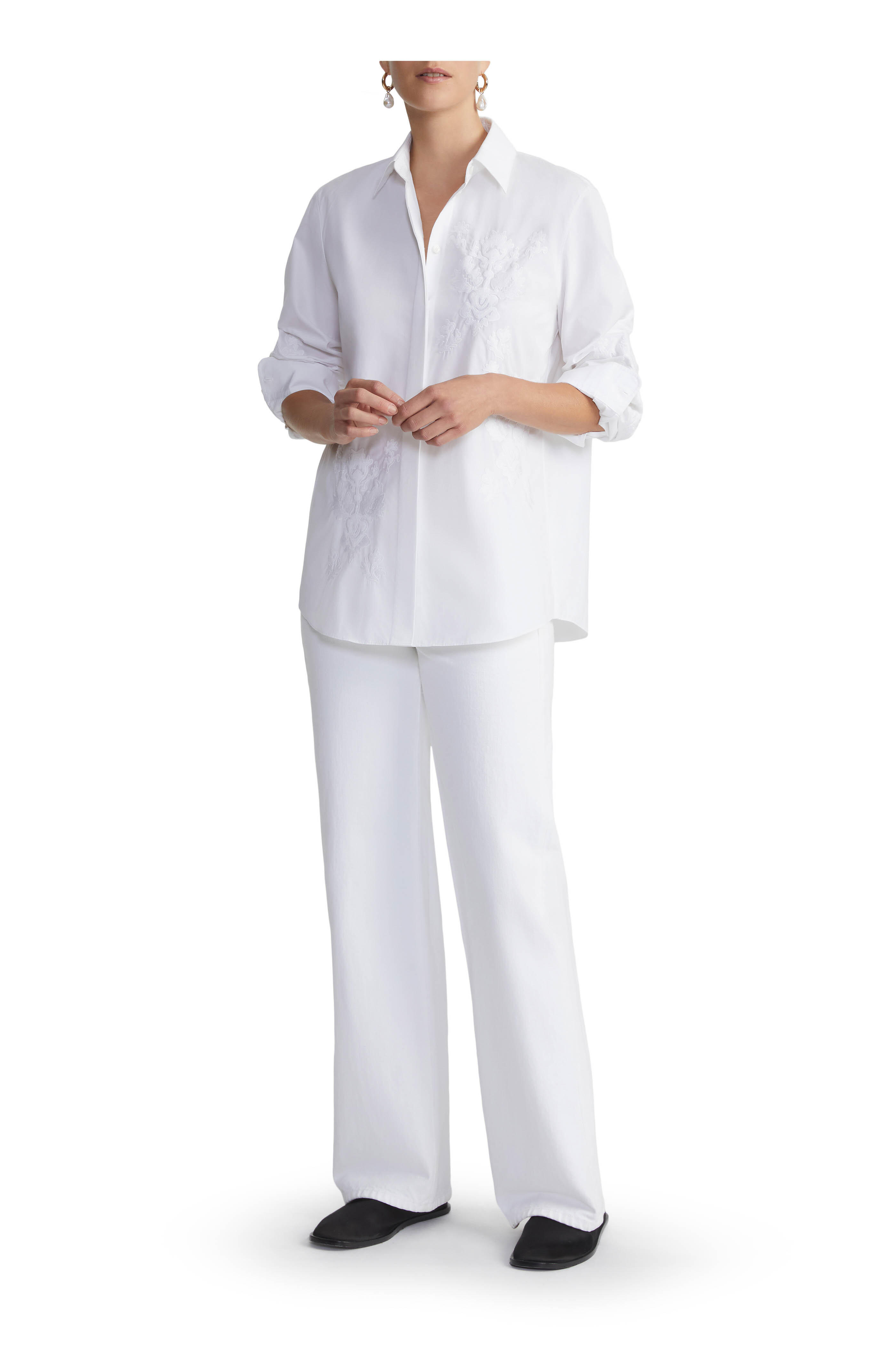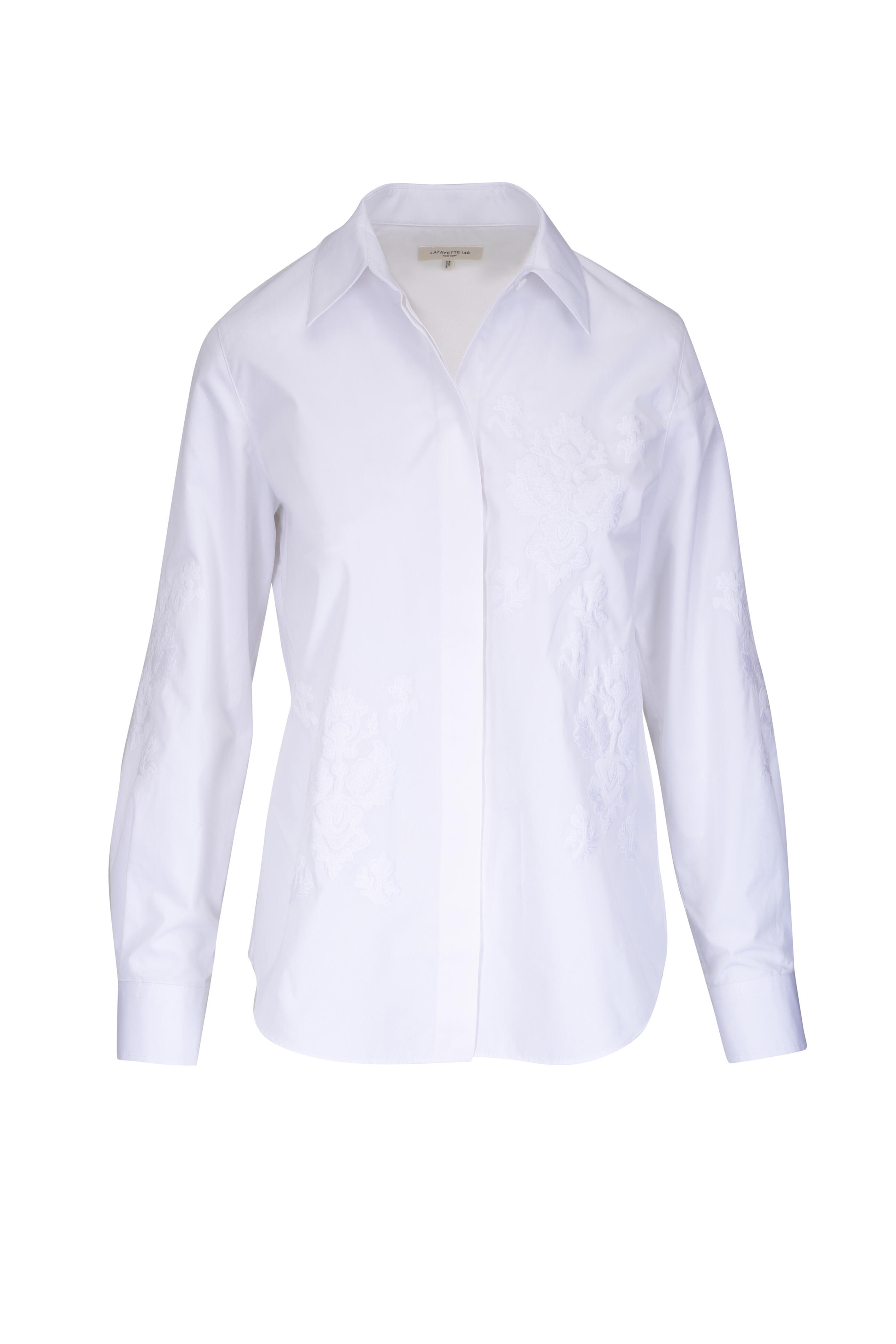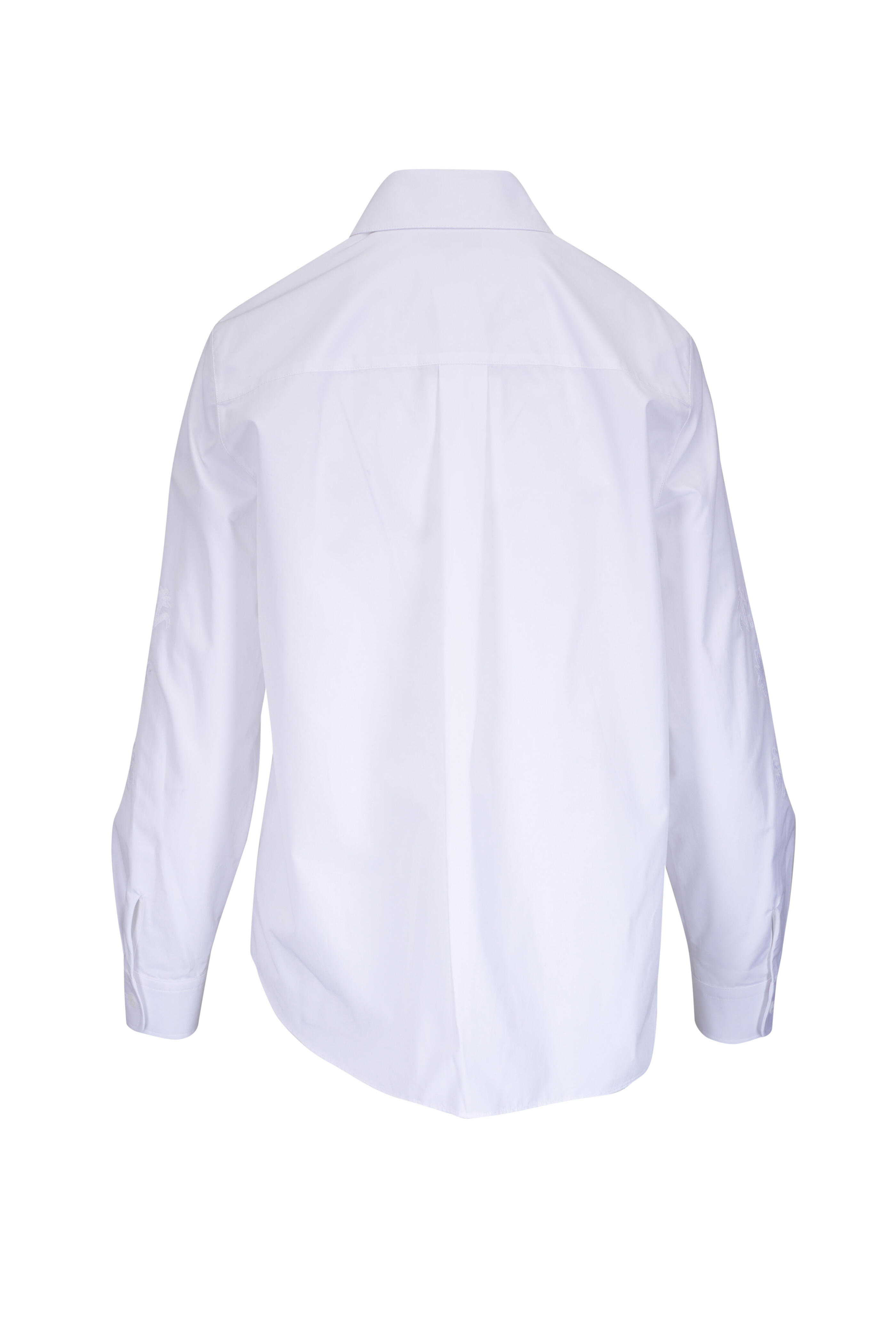 Spread collar. Concealed front button placket. Embroidery details at sleeve and front. Made in Italy. 100% cotton. Machine wash.