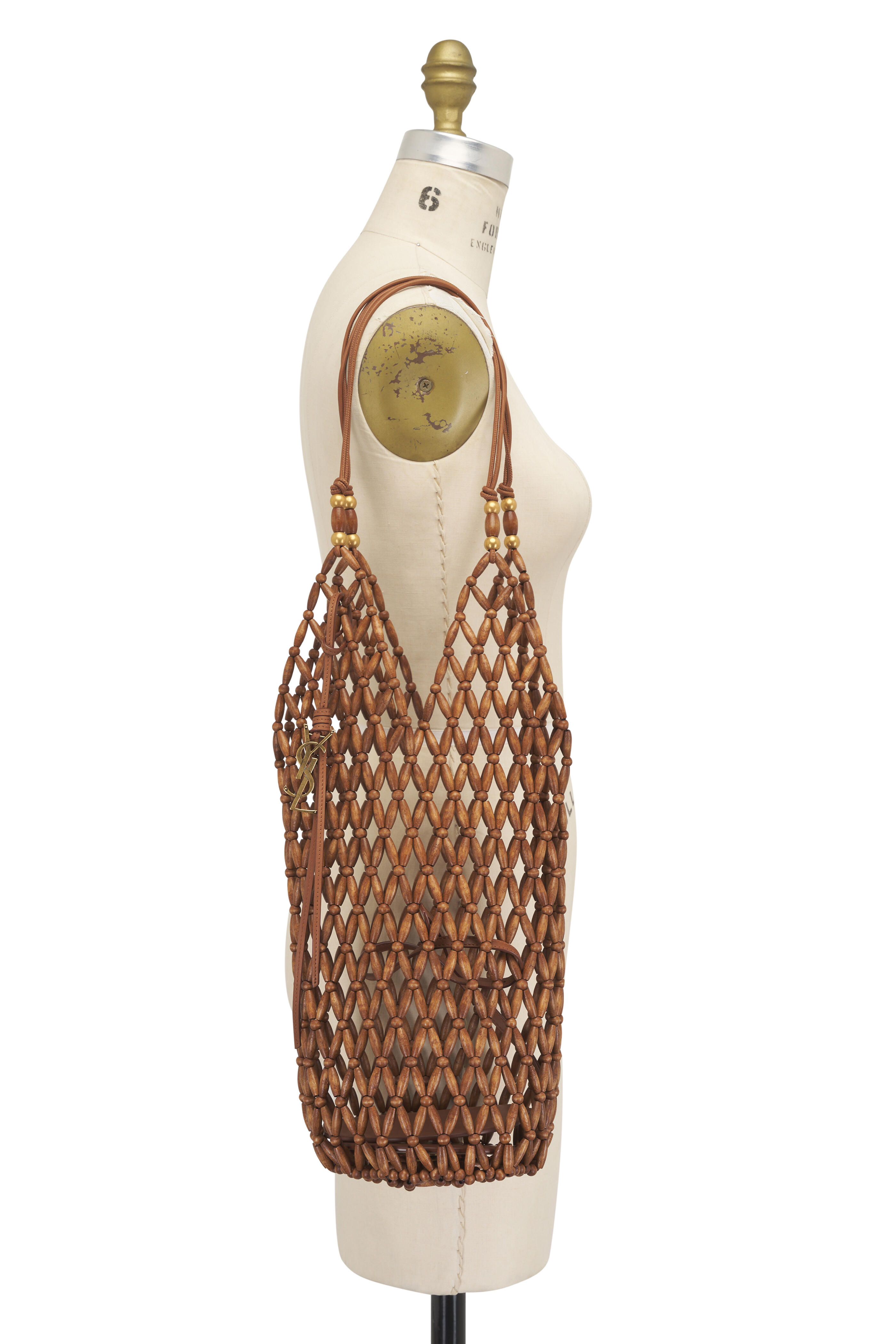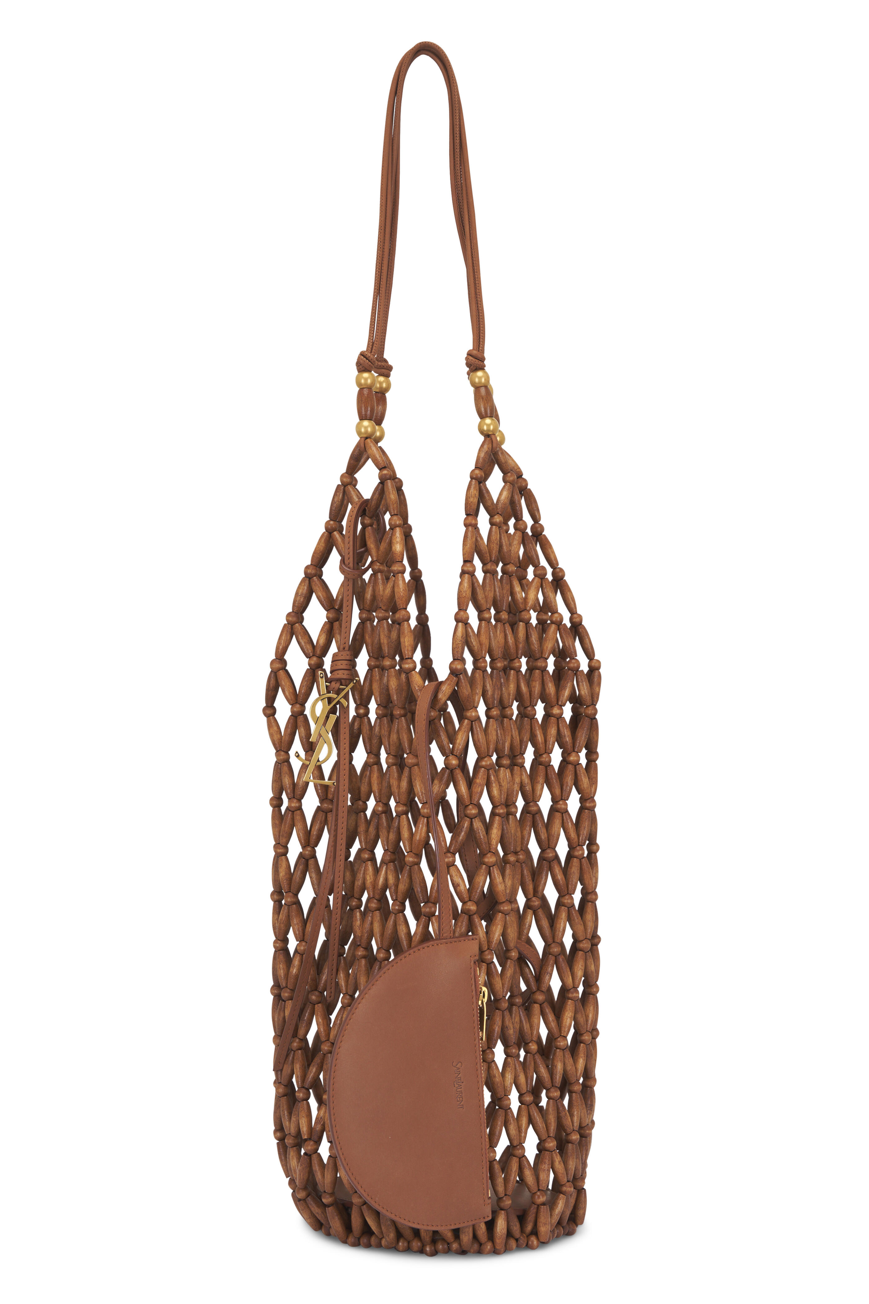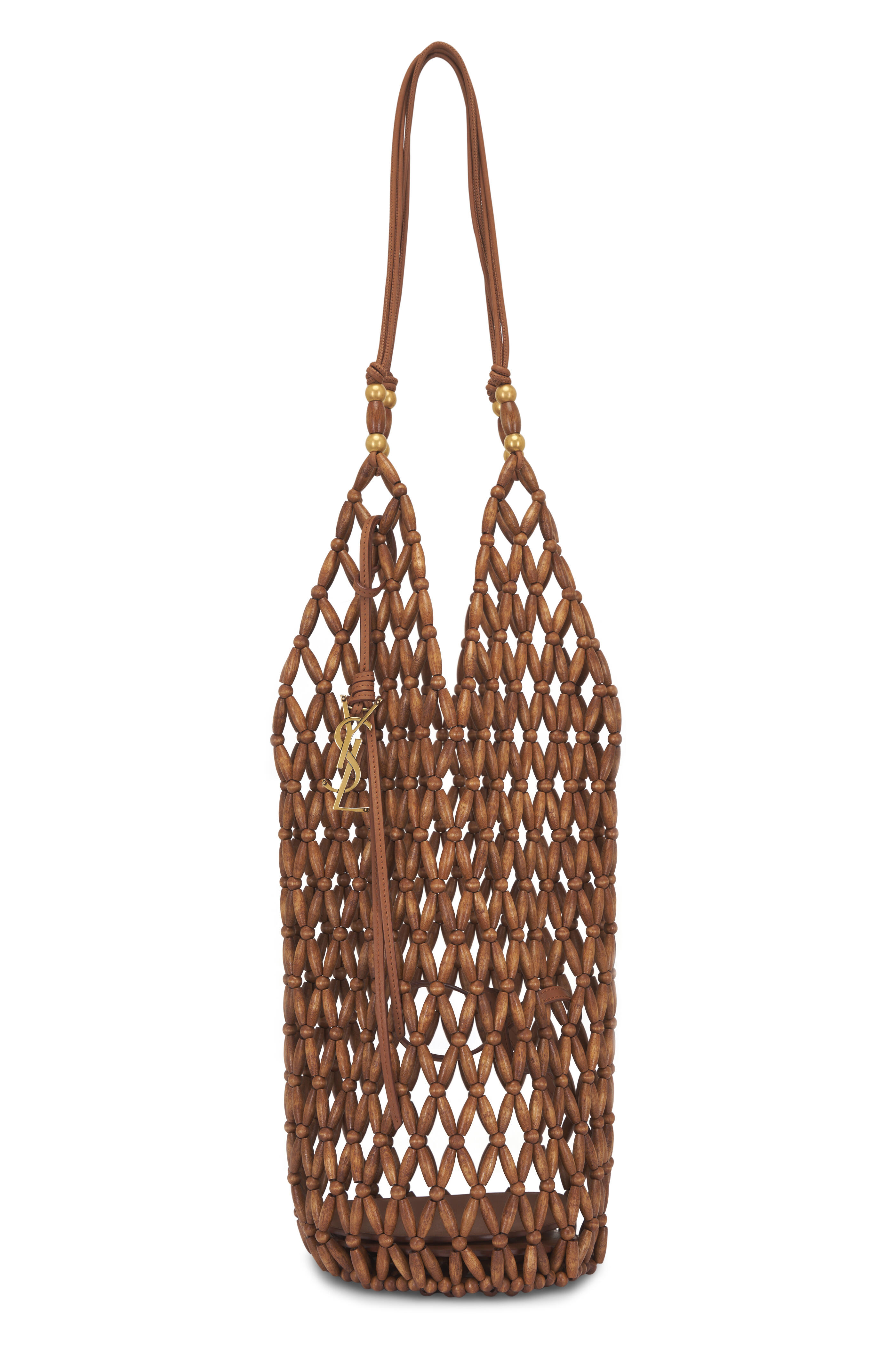 Wooden beads. Dual leather straps. Open top. Interior removable leather zip pouch. Unlined; leather base lining. Made in Italy. 17" height. 6" base diameter. 8.5" strap drop.