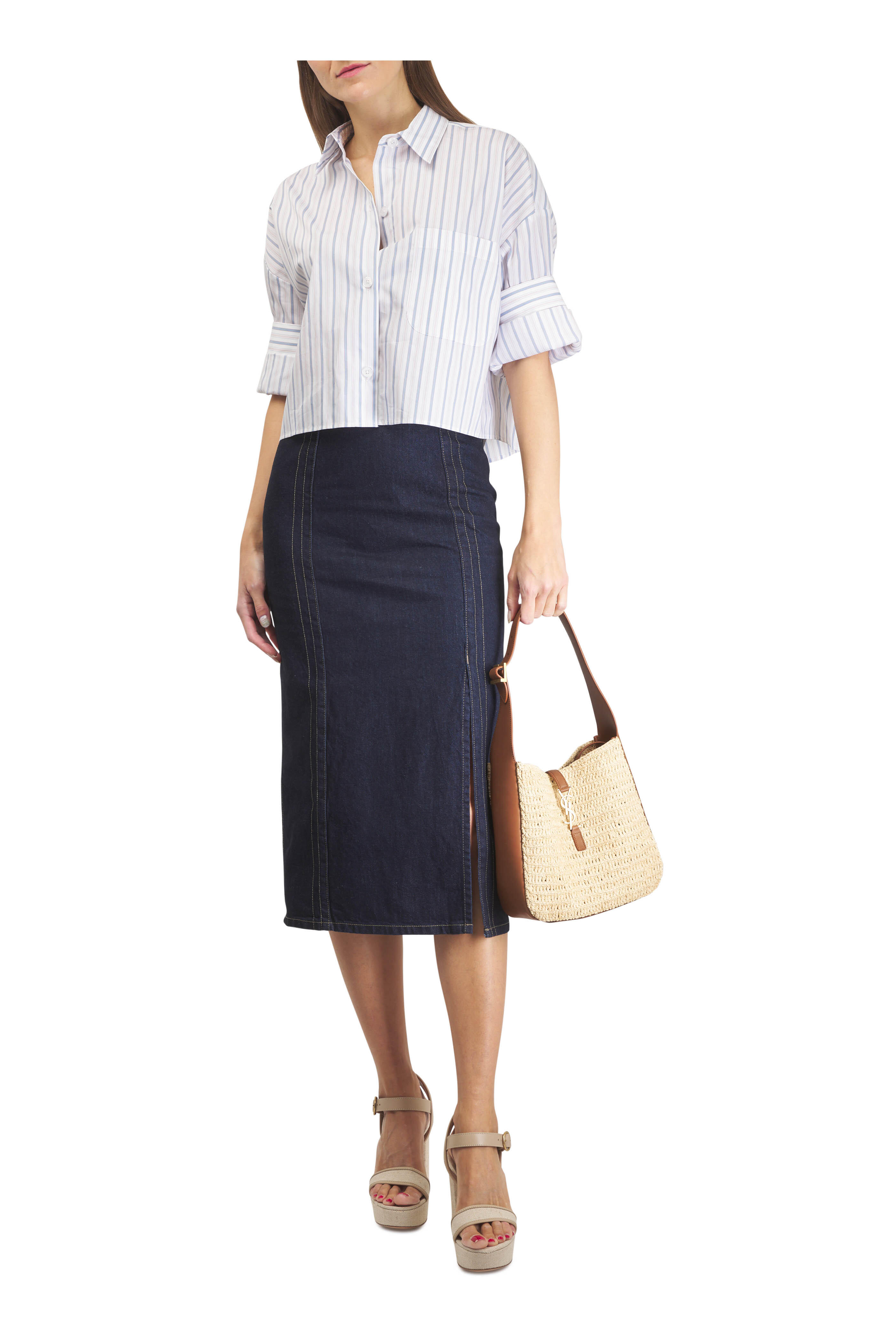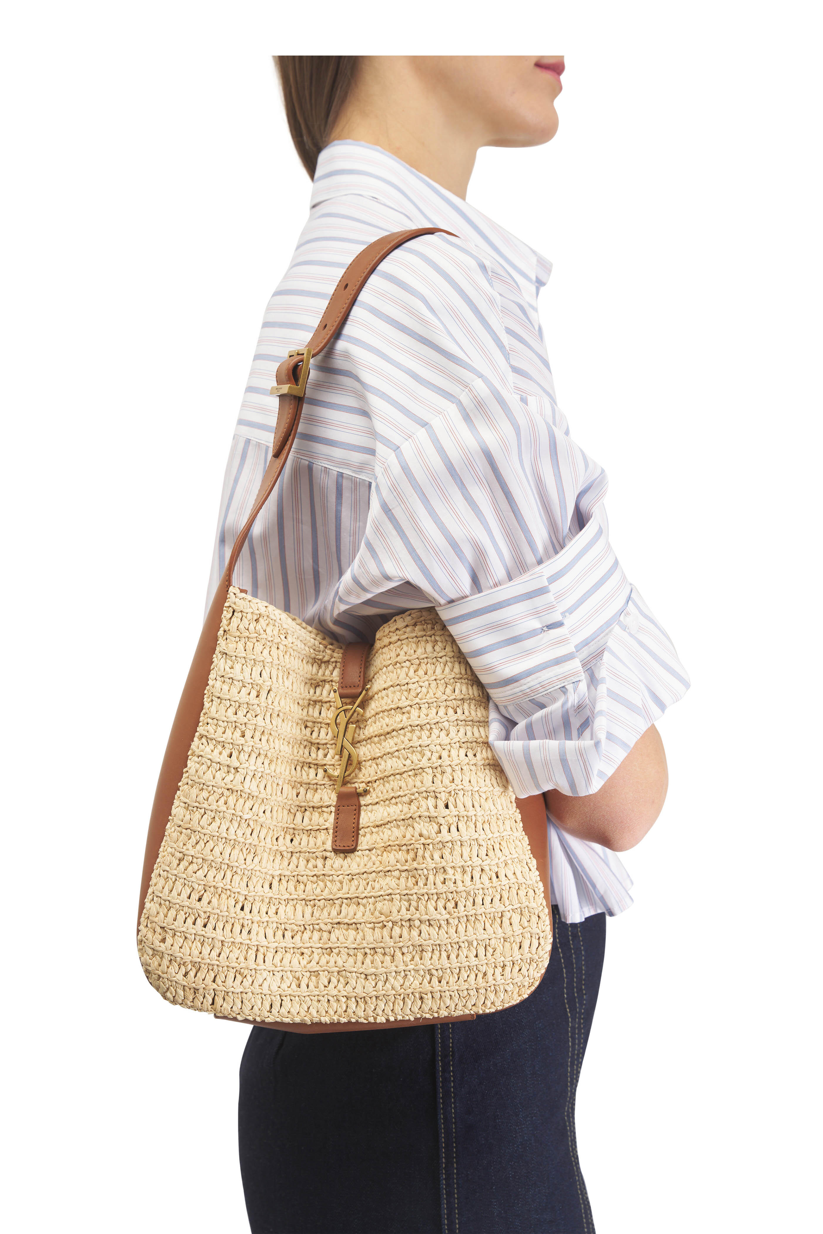 Raffia and leather. Adjustable shoulder strap. Open top; leather tab cassandre hook closure. Interior removable zip pouch. Unlined. Bronze tone hardware. Made in Italy. Dimensions: 9.1" x 8.7" x 2–3.1". Strap drop: 8.3".
