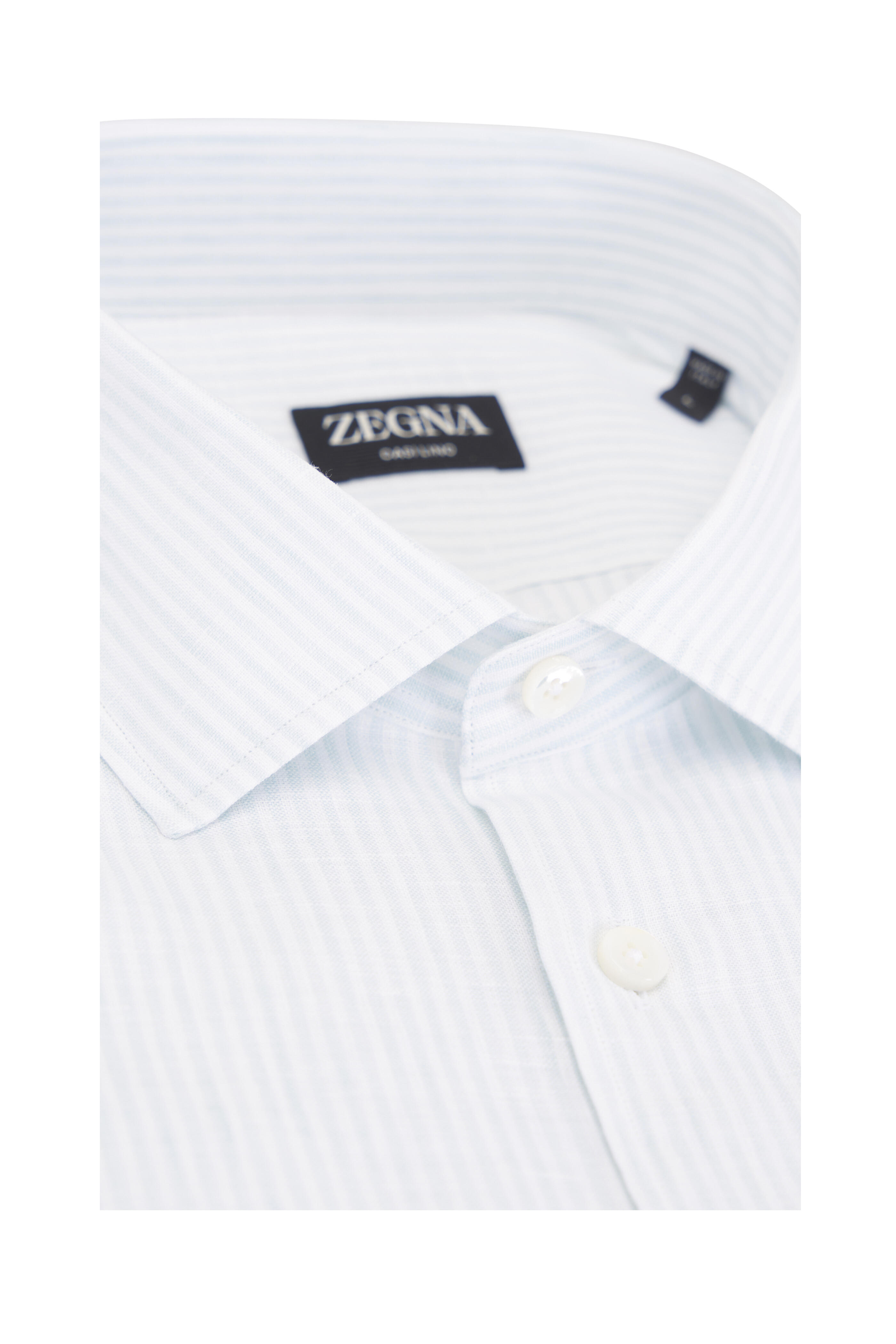 Spread collar. French front button placket. Single button cuffs. Made in Italy. 100% linen. Machine wash.