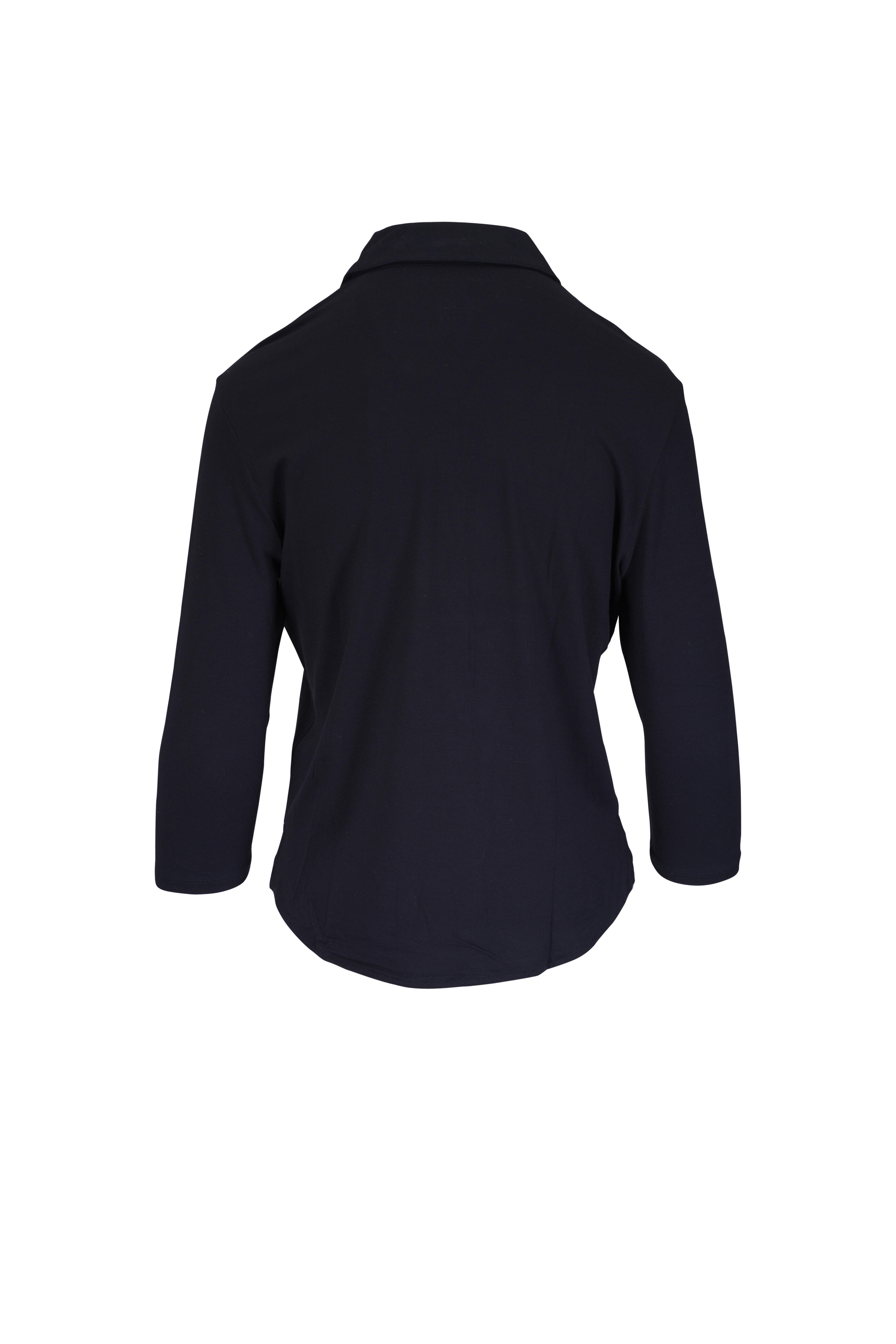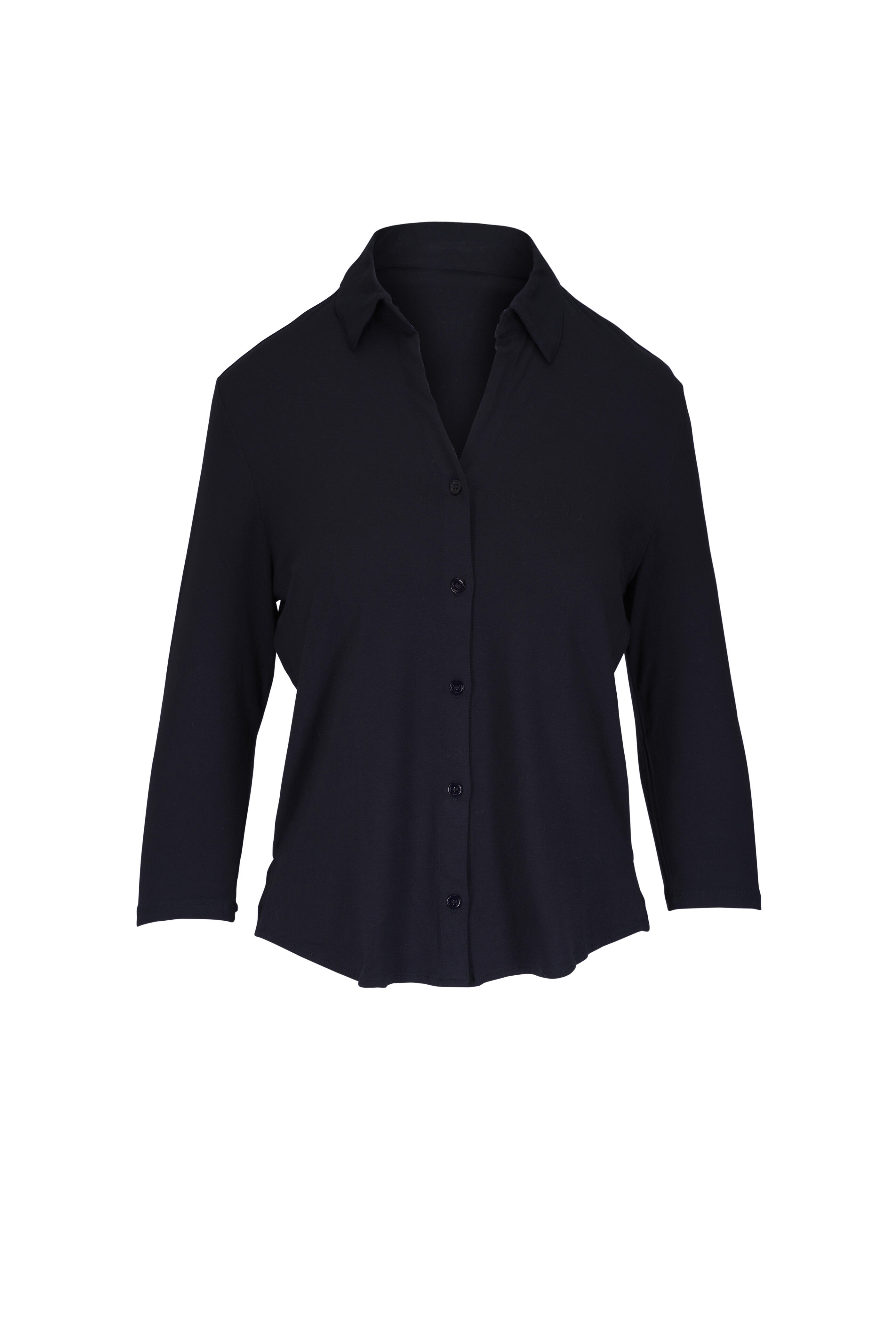 Spread collar. Front button placket. Straight hem. Imported. Shoulder to hem 23" (size xs). 94% viscose, 6%elastane. Machine wash.