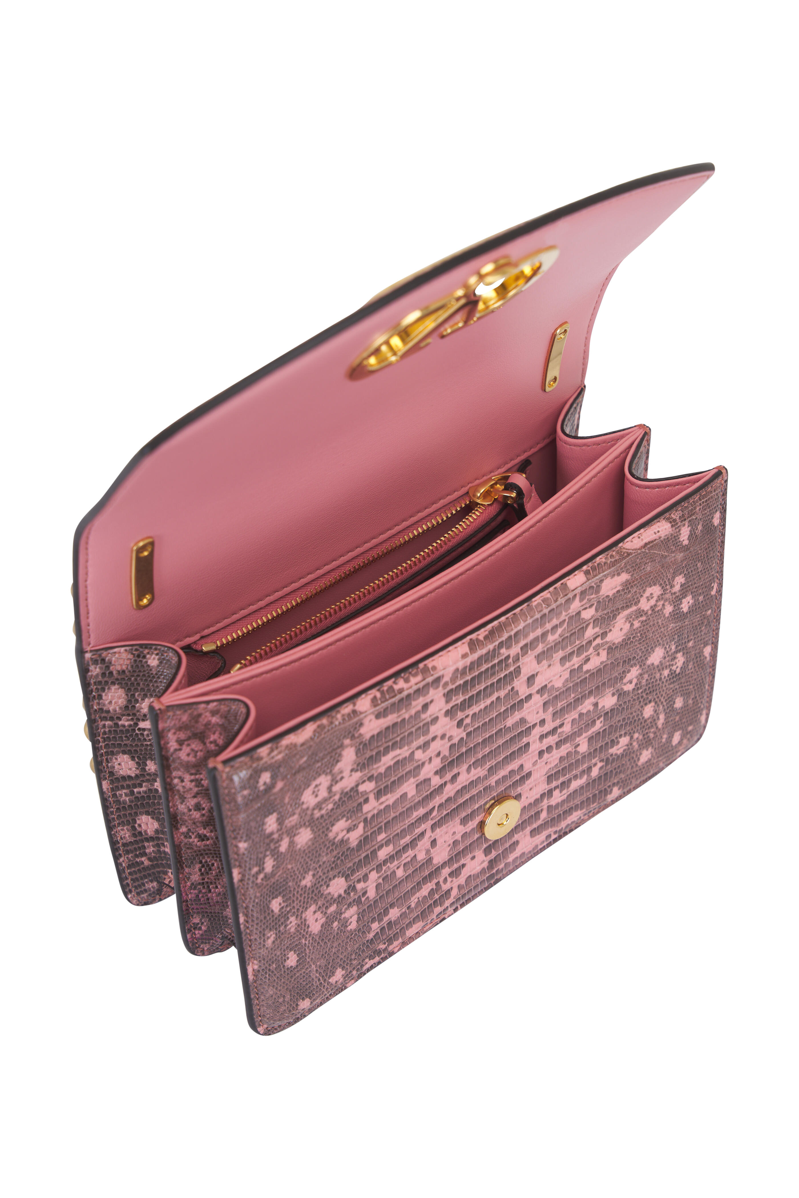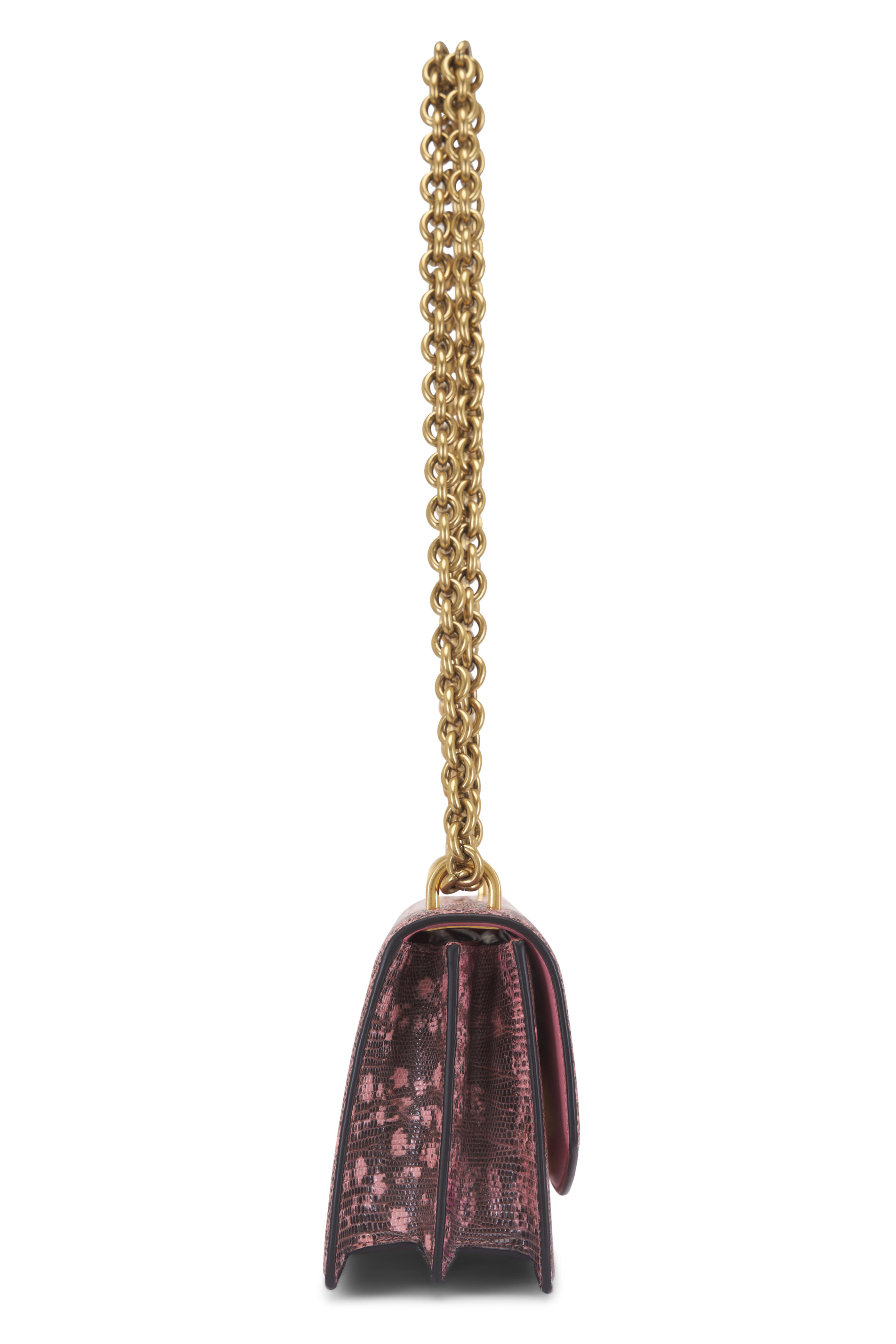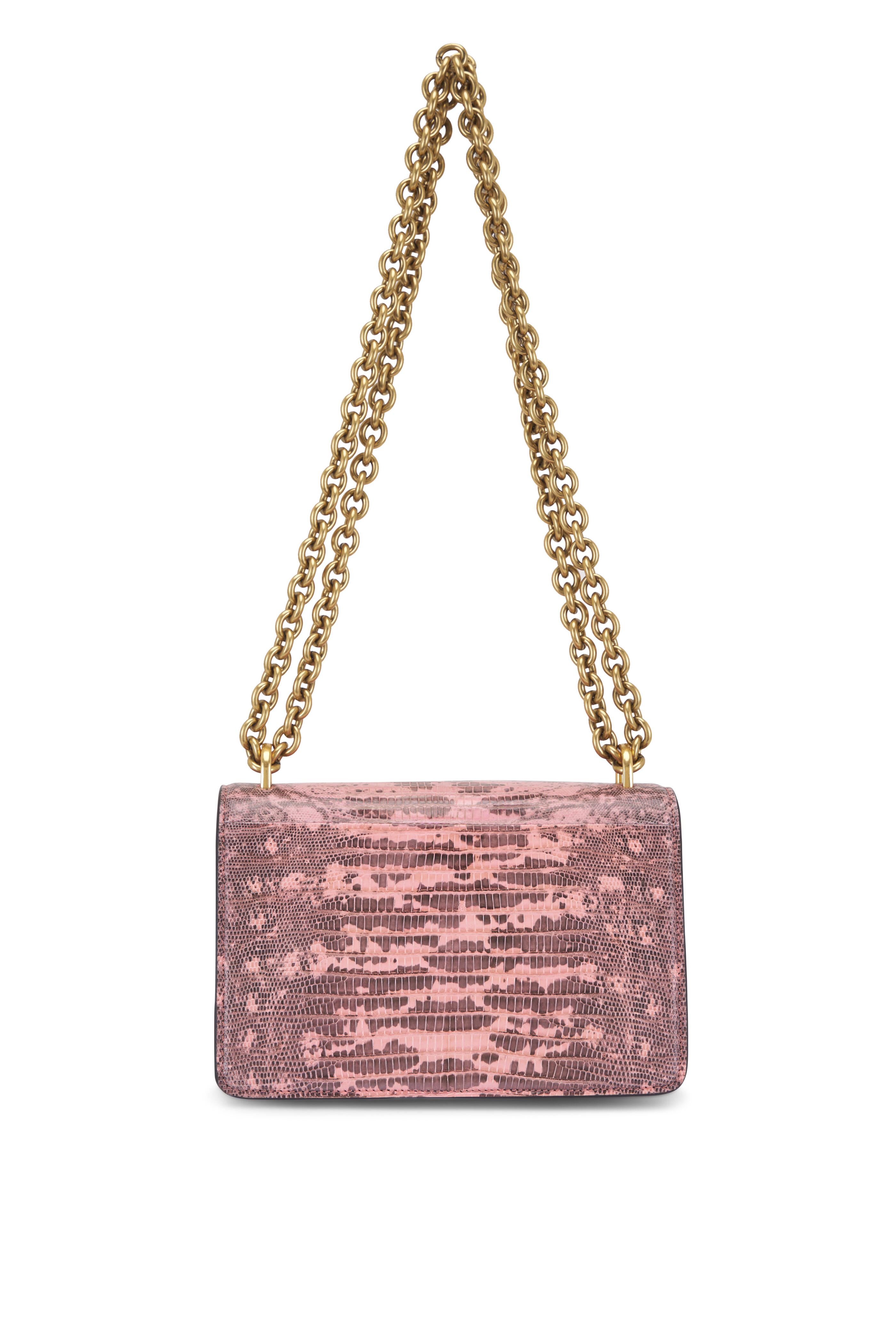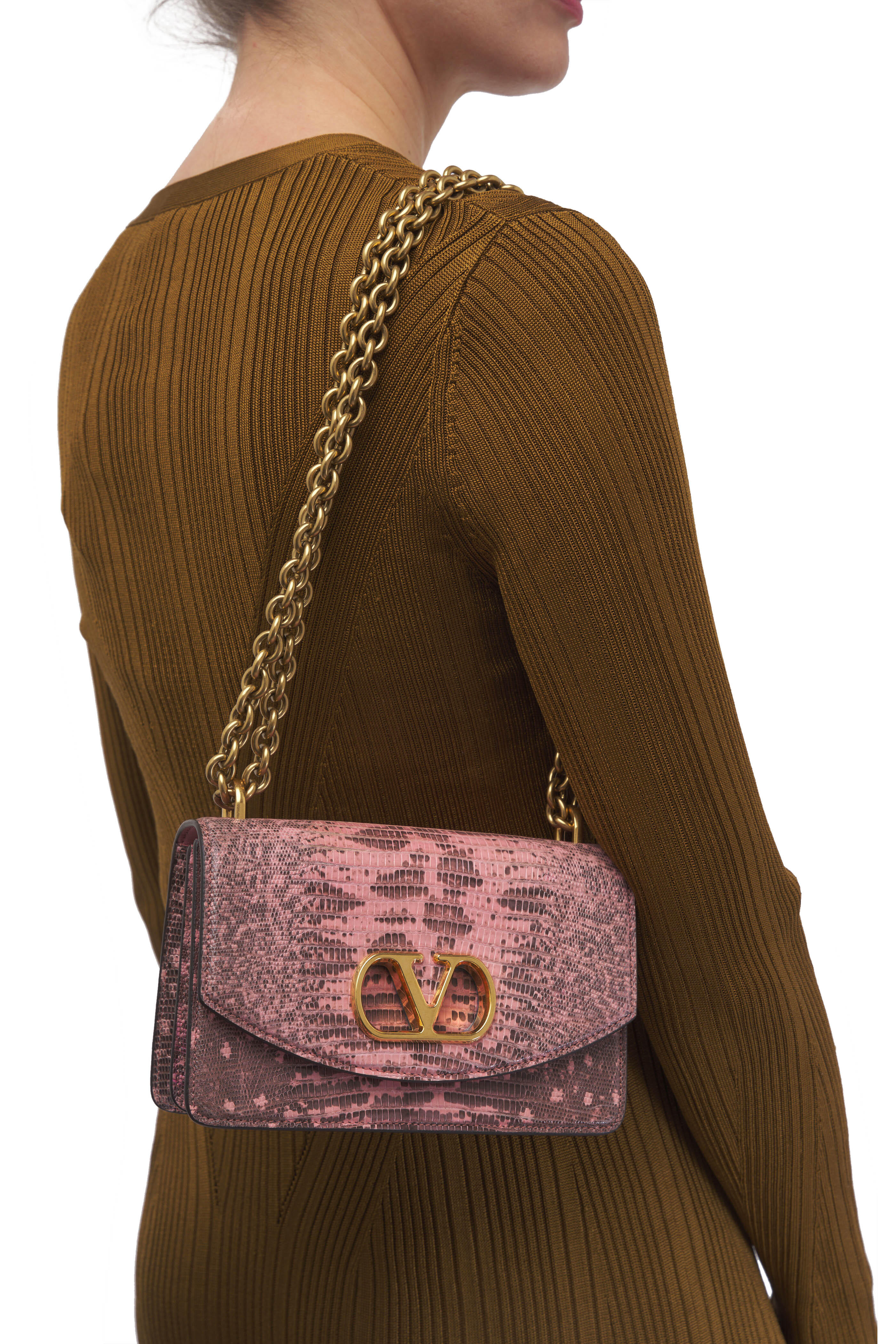 Tejus. Sliding metal shoulder chain. Magnetic closure. Two interior compartments; zippered pocket and slip pocket. Antique gold-finish hardware. Nappa lining. Made in Italy. Width: 9.4". Height: 6.3". Depth: 3.1". Strap drop length: min. 10.6" to max. 20.5".