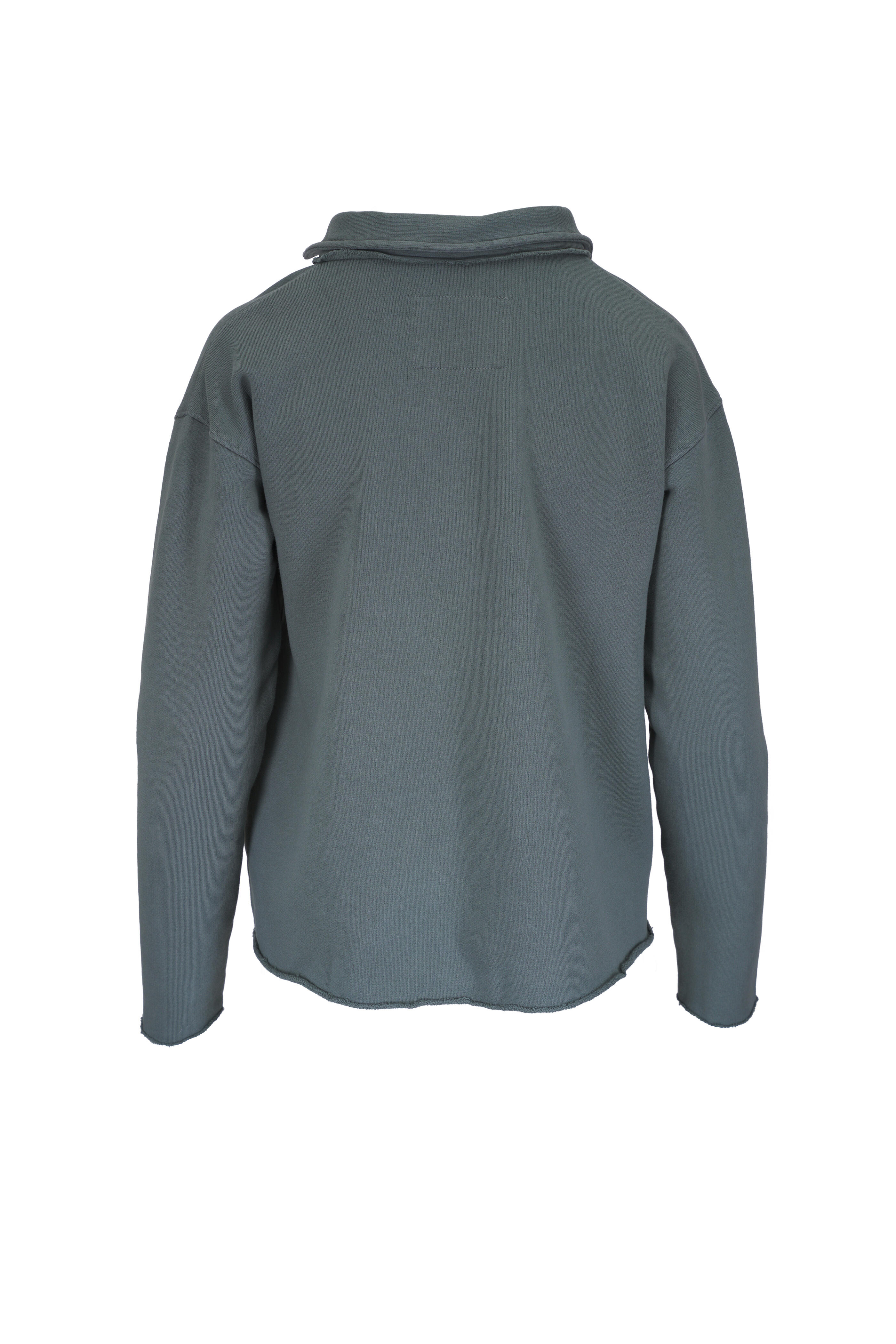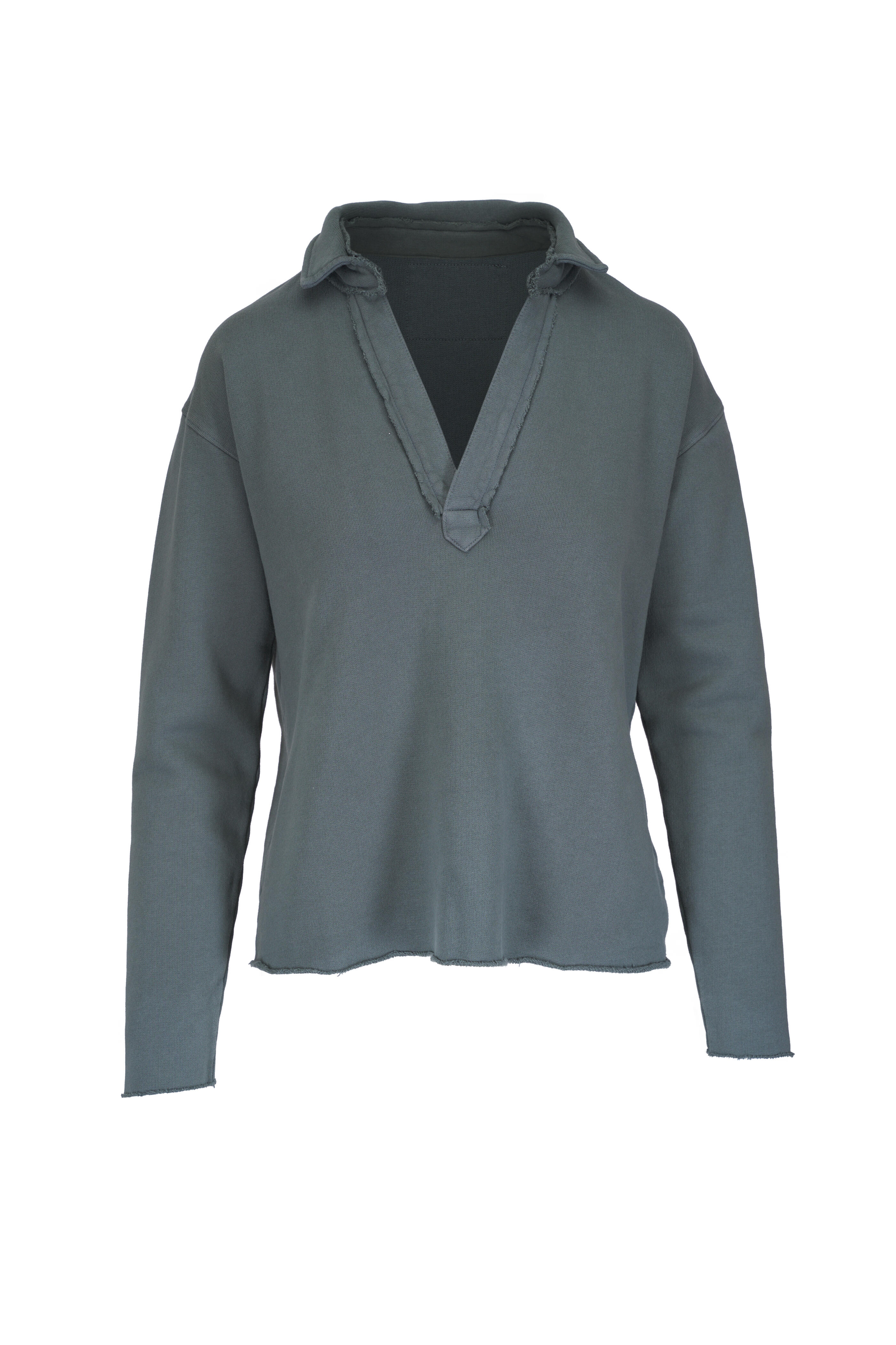 Collared v-neckline. Slip-on style. Raw edge hem and edges. Made in the USA. 100% cotton. Machine wash.