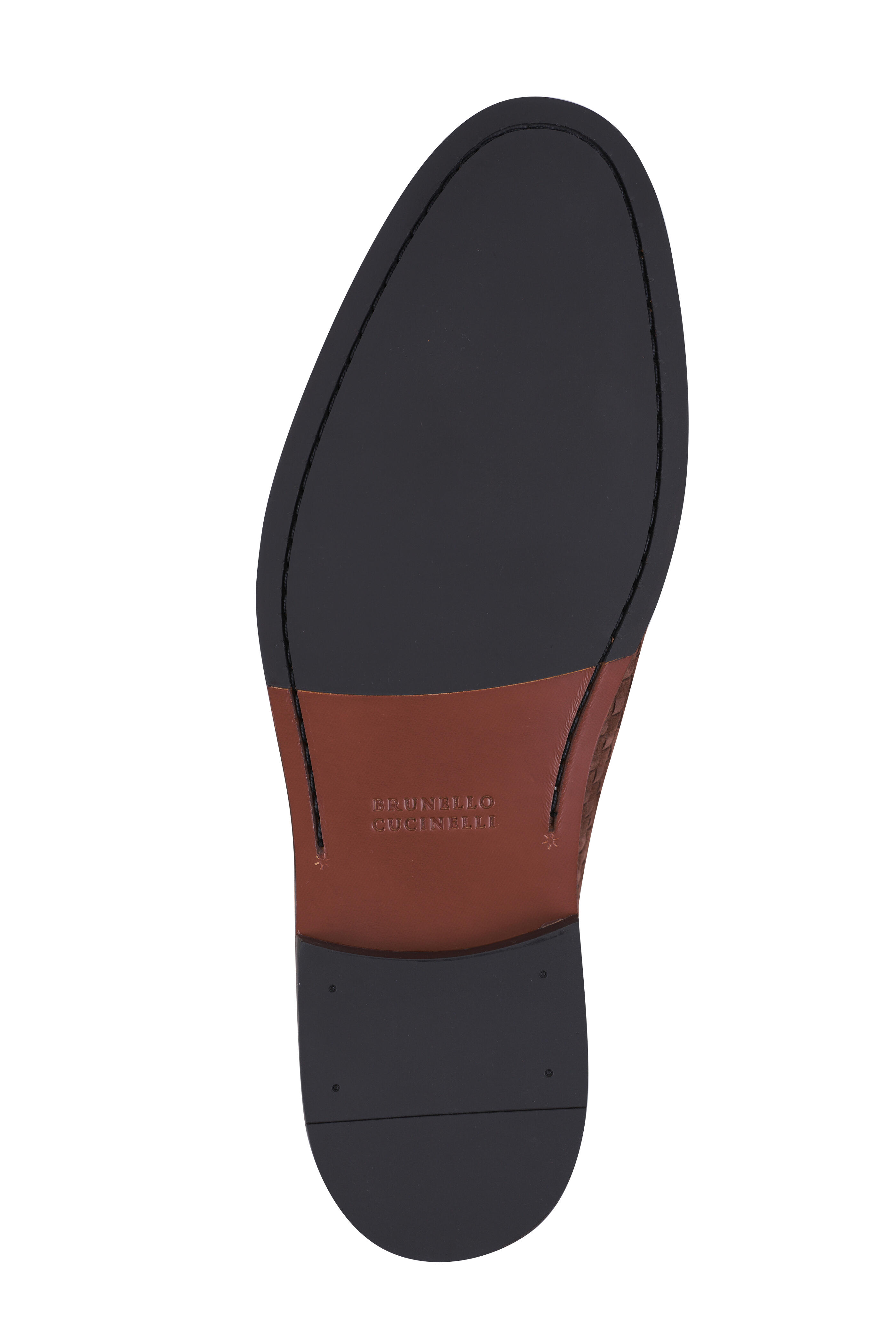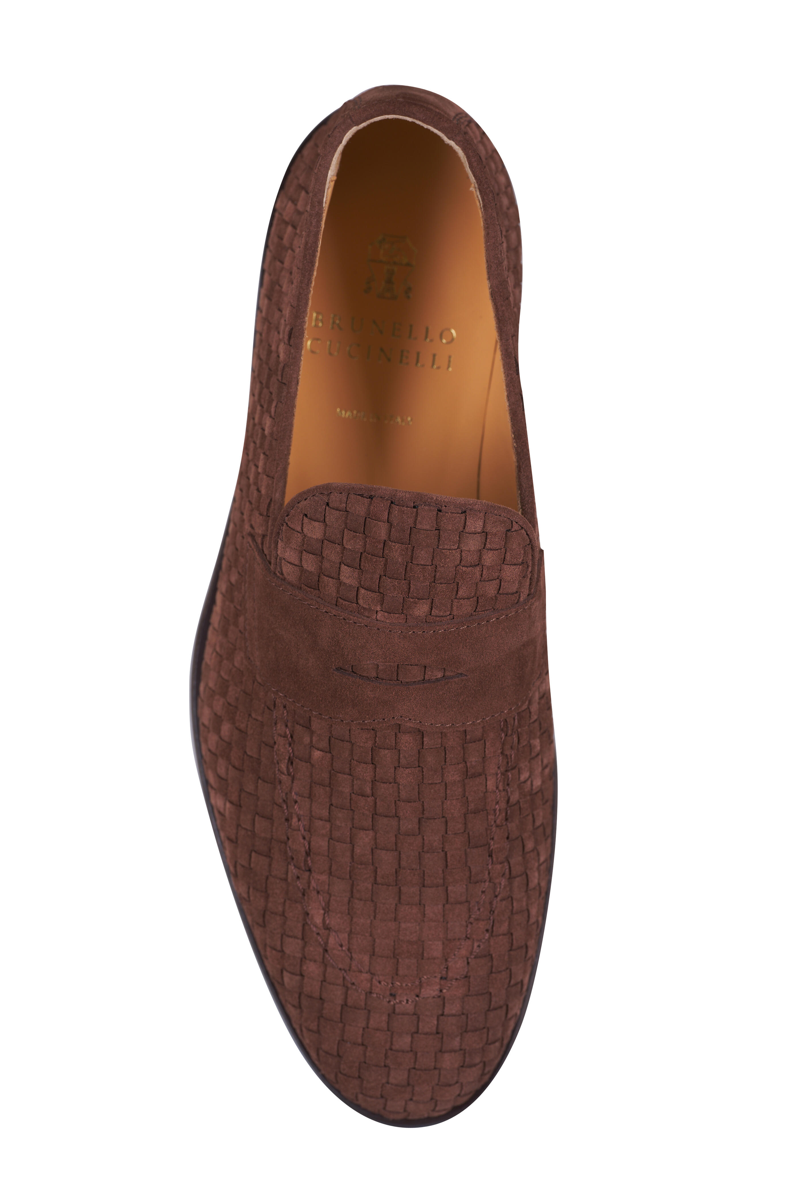 Woven suede upper. Round tapered toe. Slip-on style. Penny strap across vamp. Leather lining and insole. Stacked heel. Rubber sole. Made in Italy.
