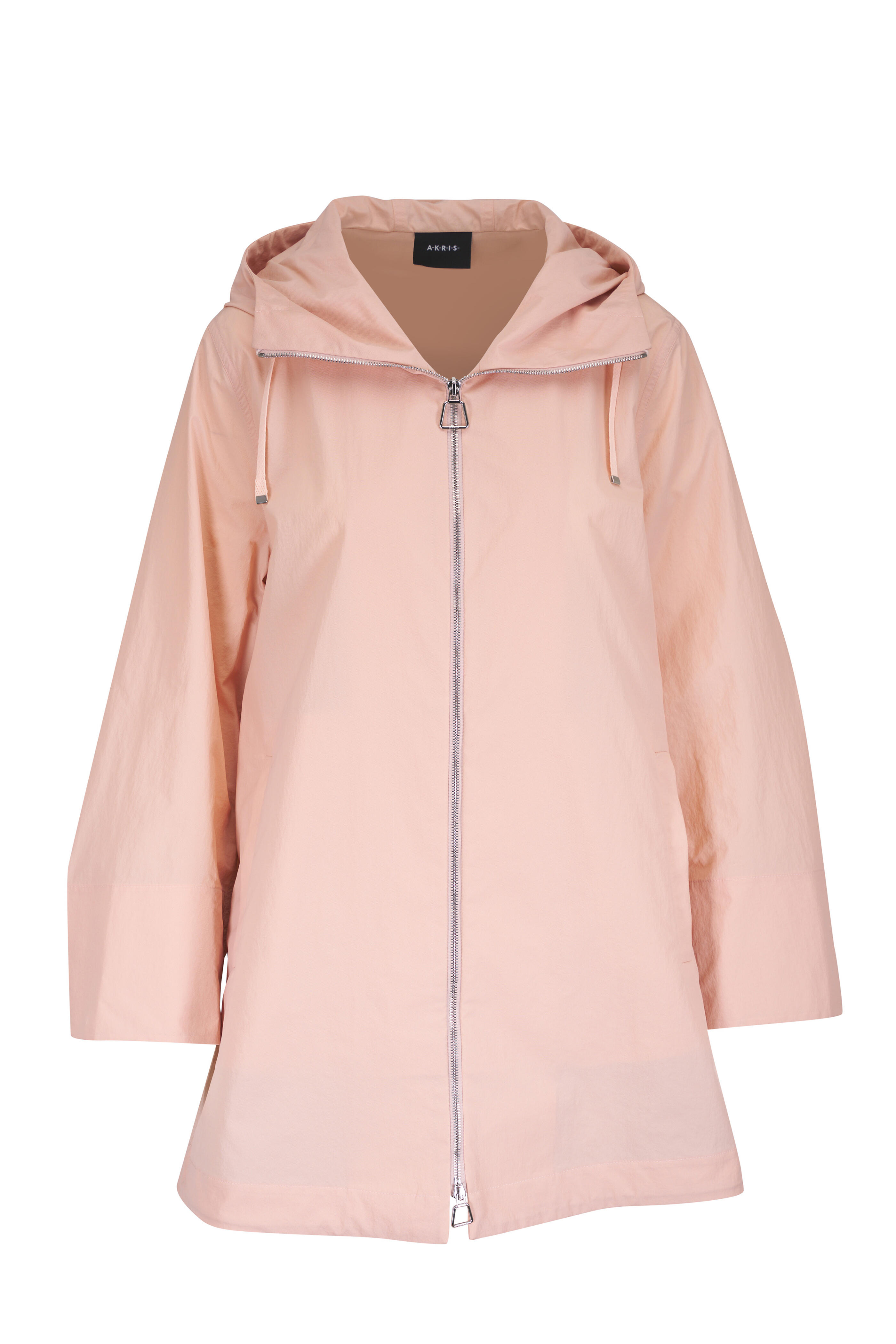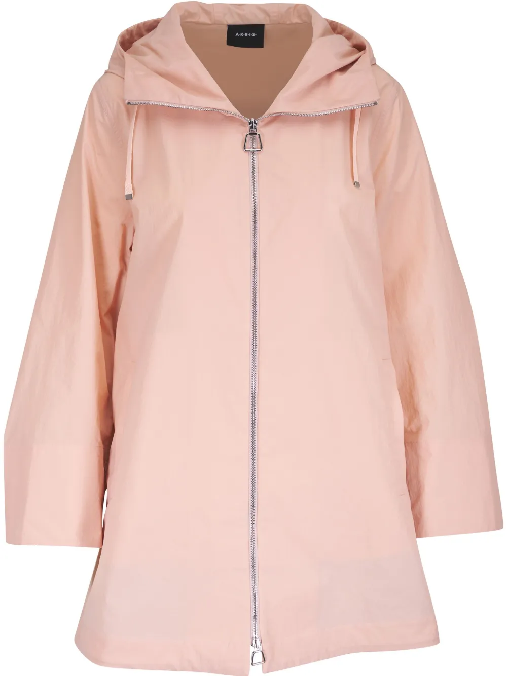 Hooded; adjustable drawstring. Two-way zip. Lower slip pockets. Imported. 97% polyamid, 3% polyurethane. Dry clean.