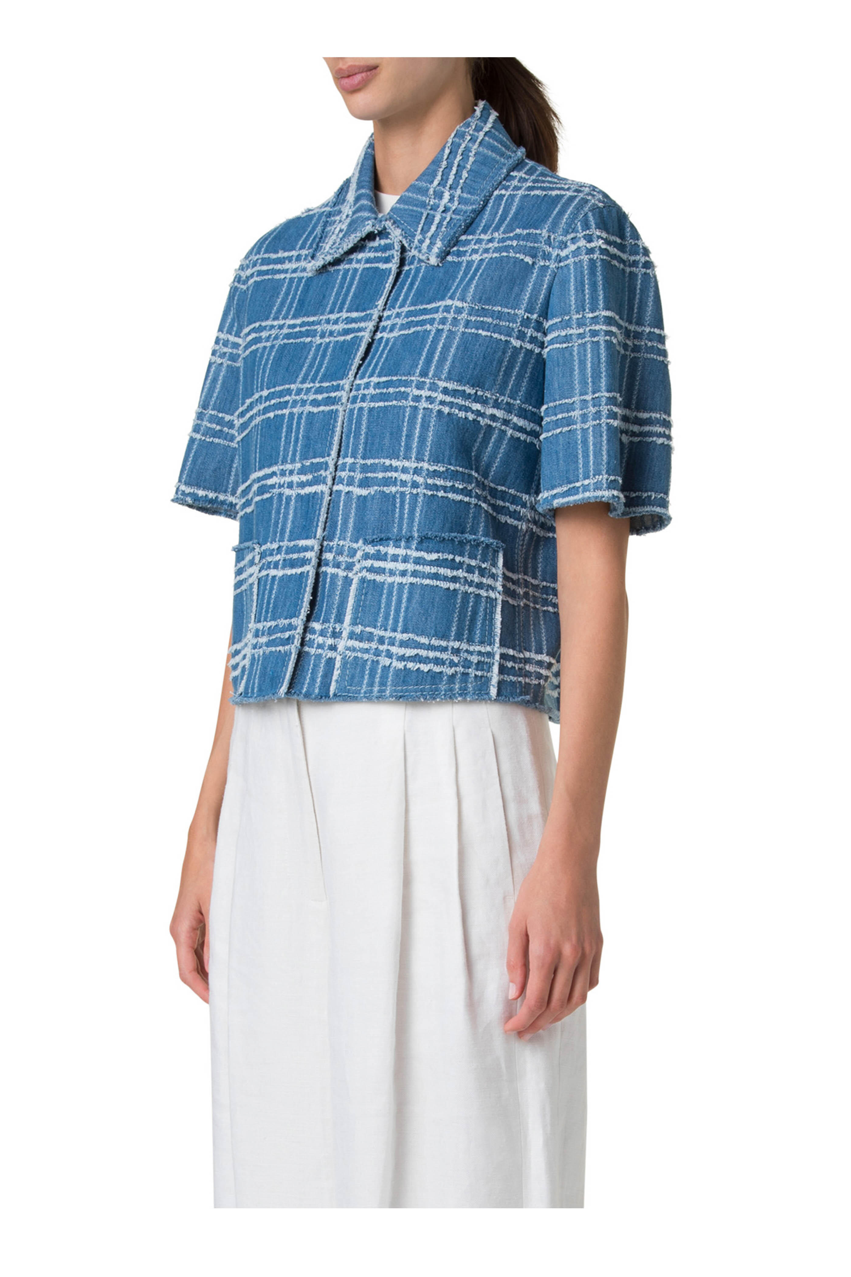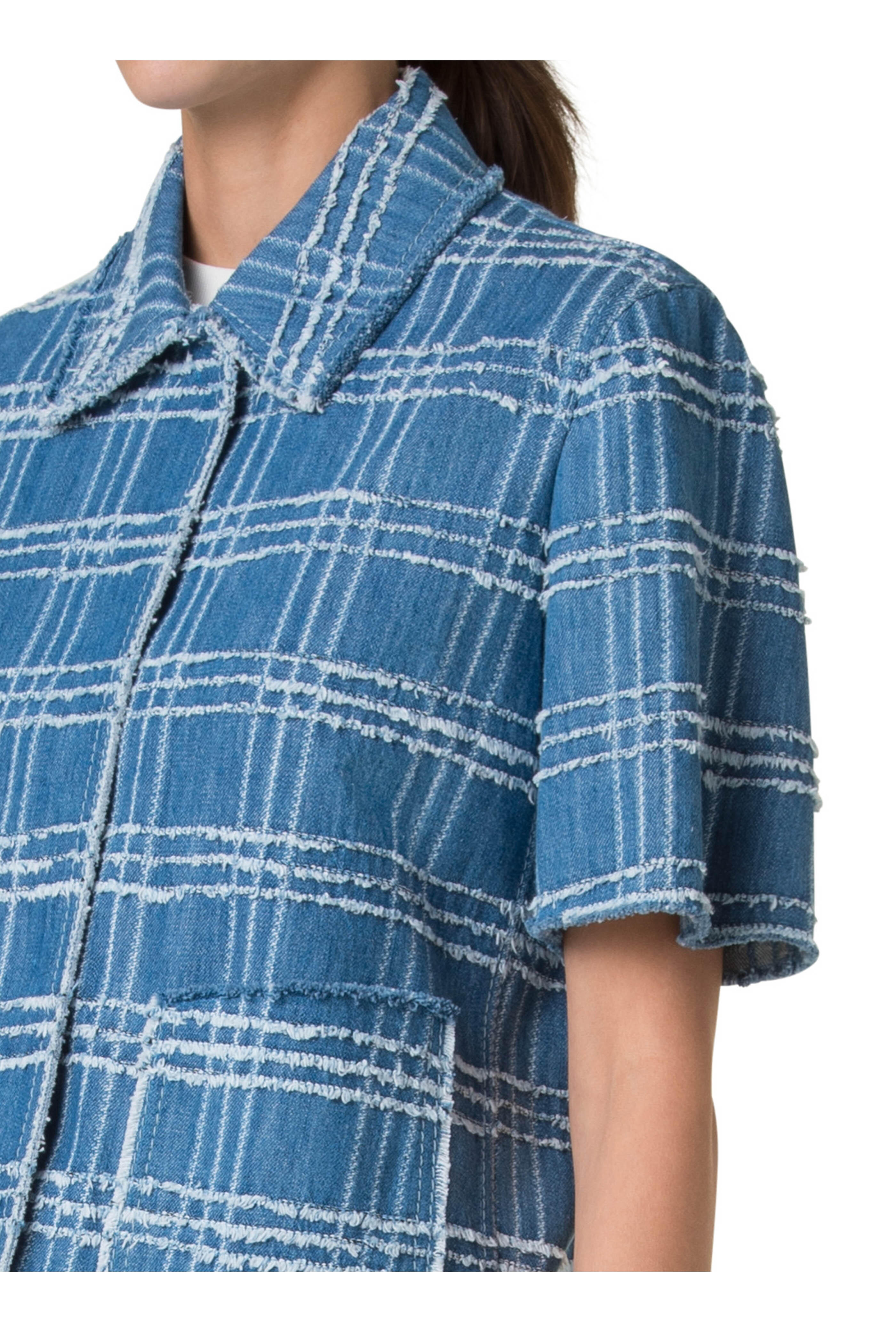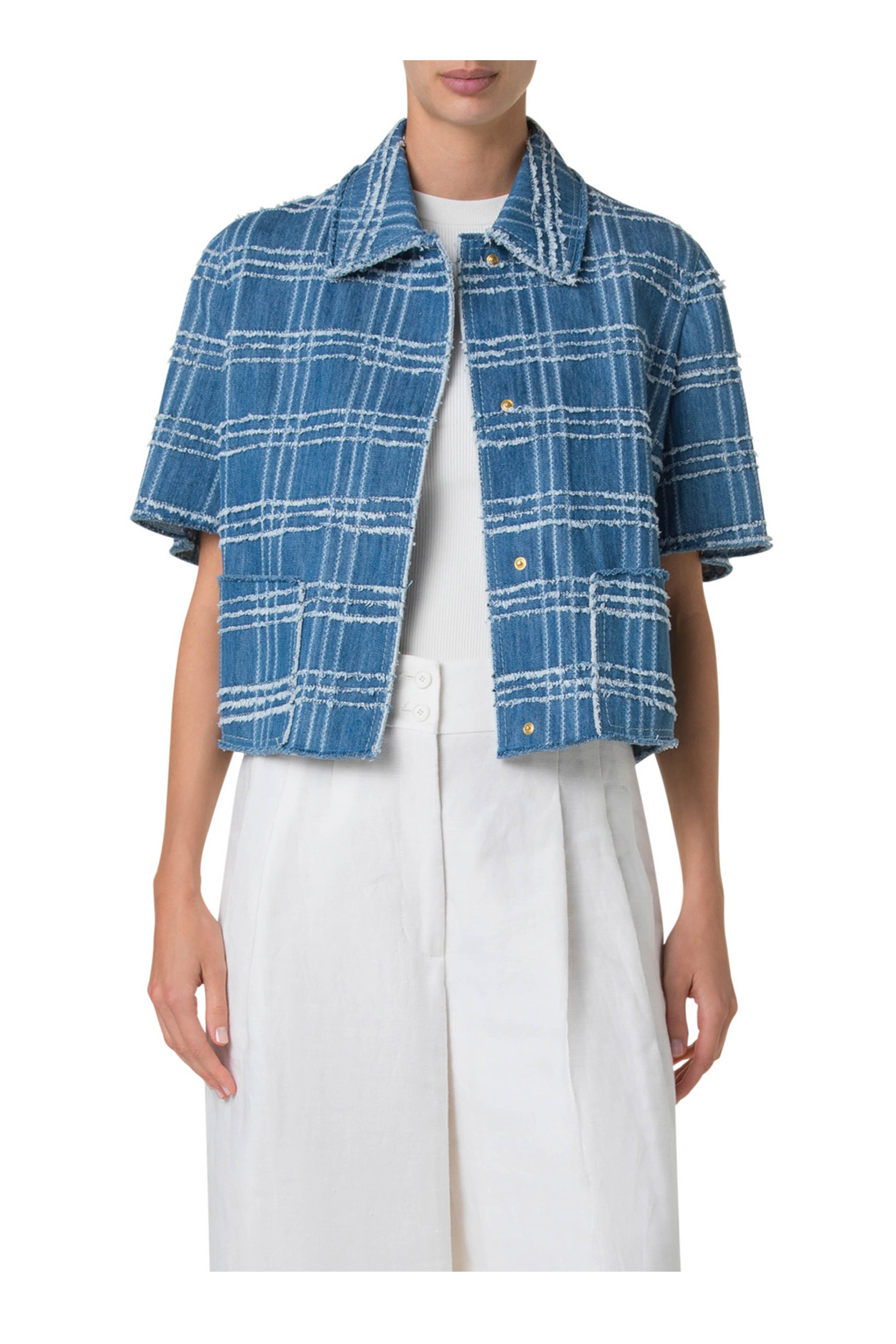 Spread collar. Front snap placket. Lower patch pockets. Imported. Approximately 19" shoulder to hem (measurements taken from size 4). 98% cotton, 2% polyester. Dry clean.