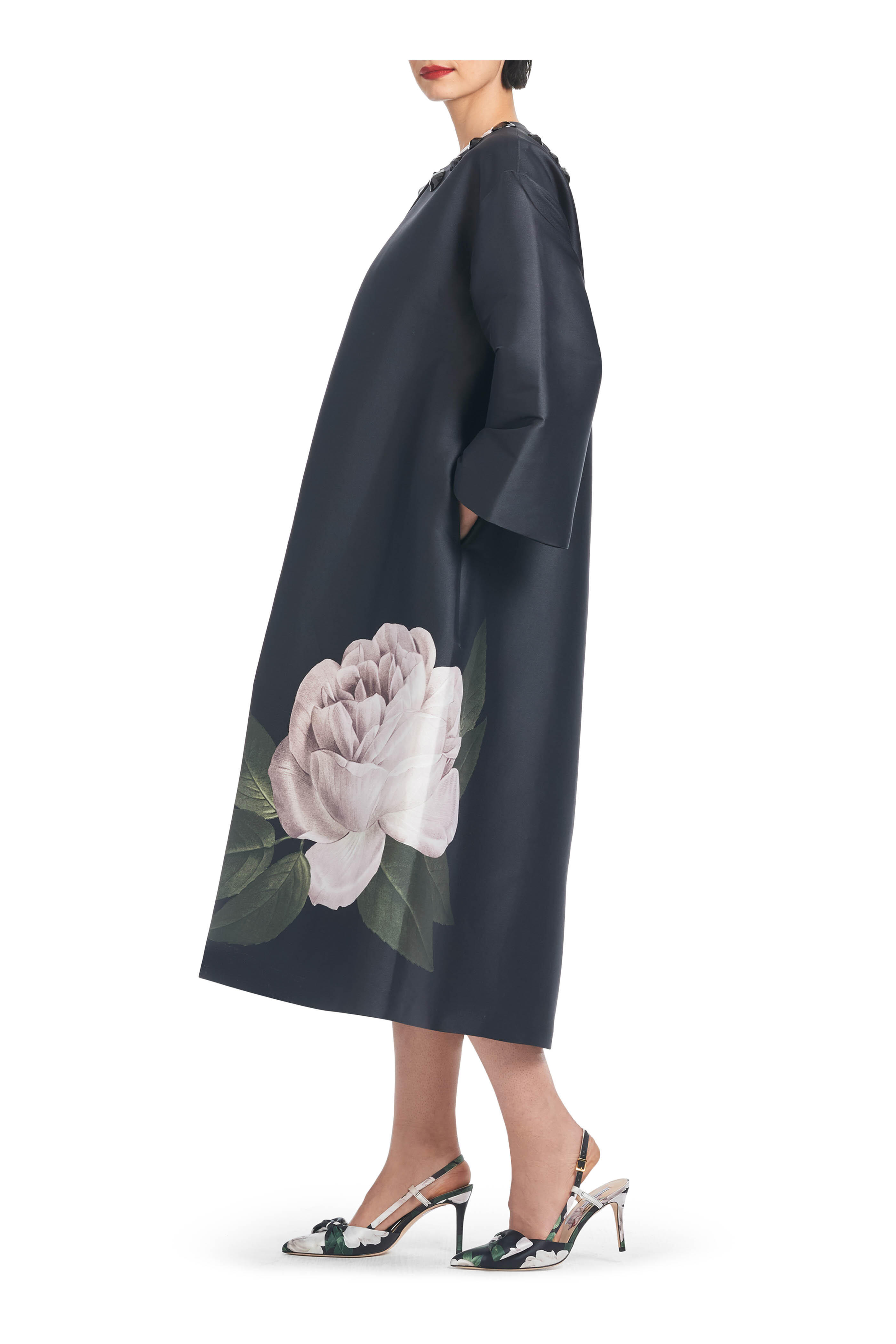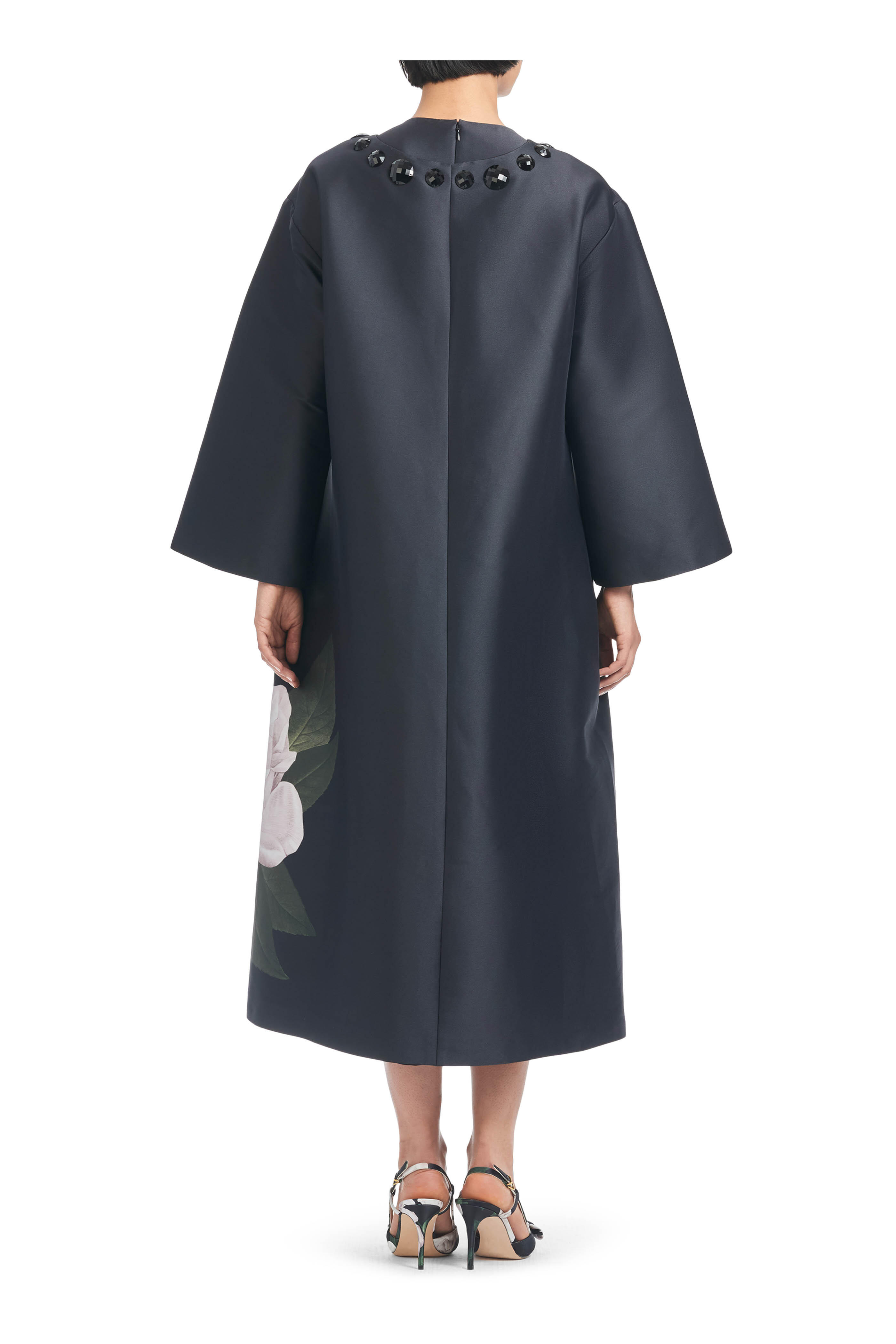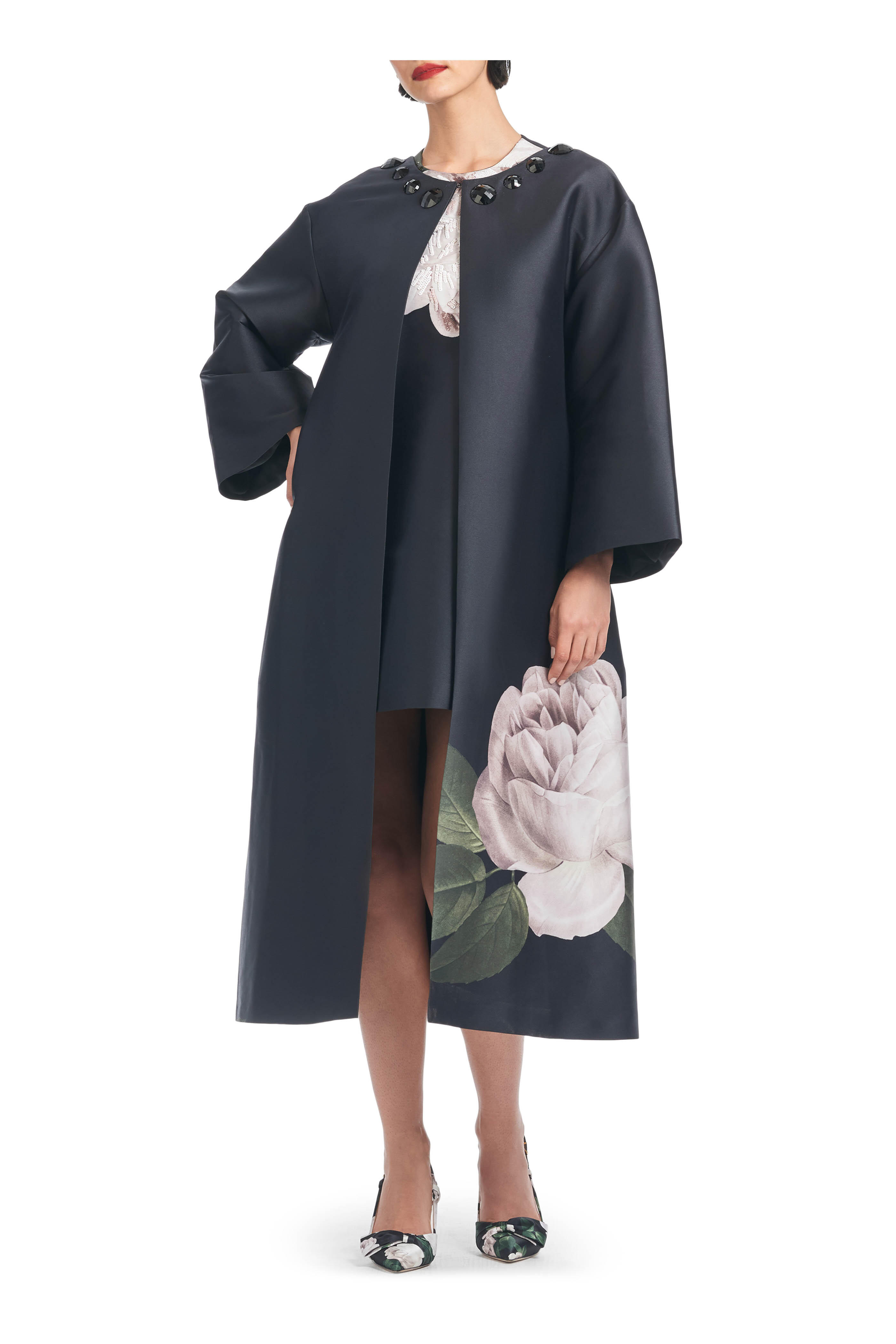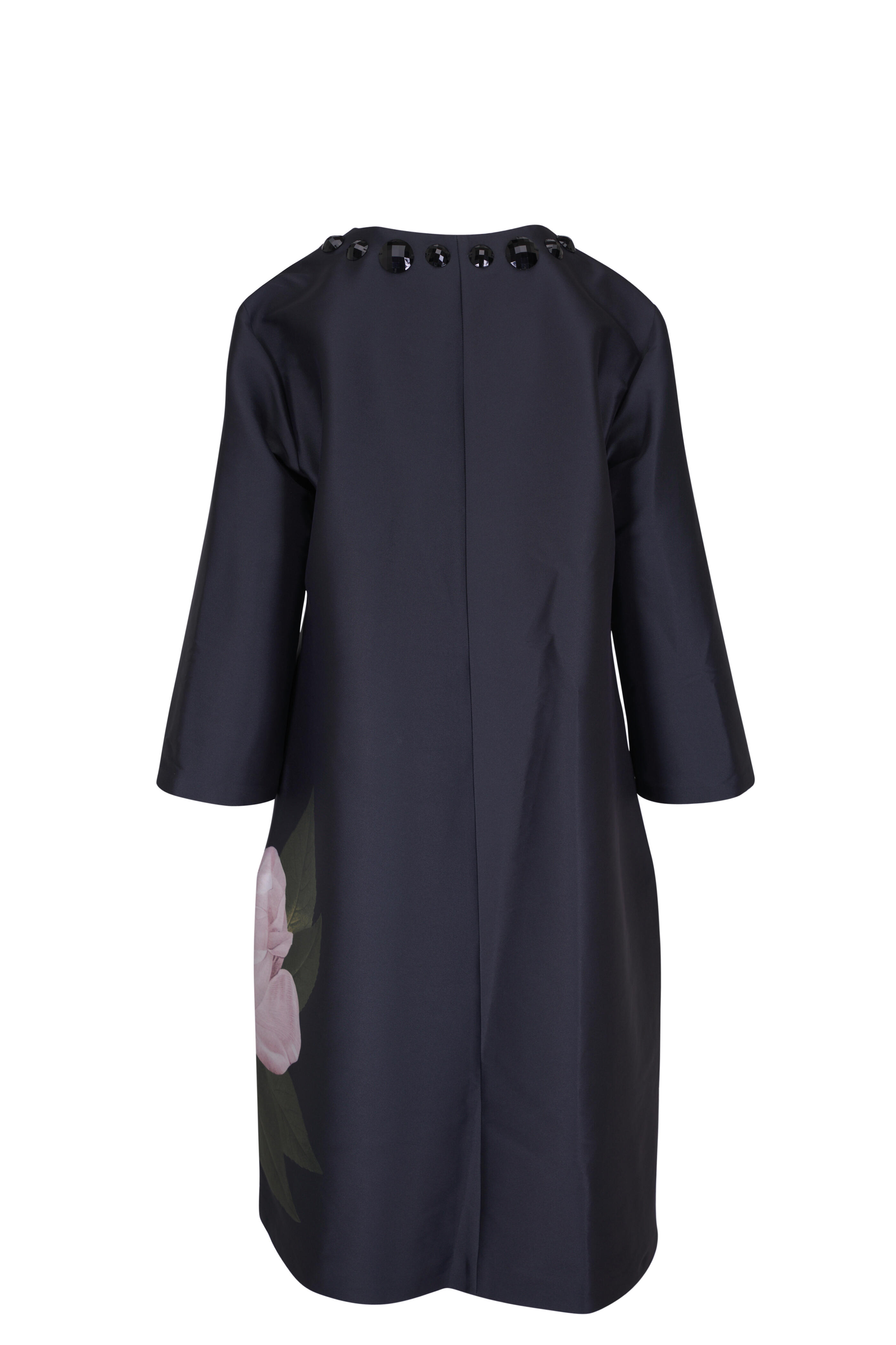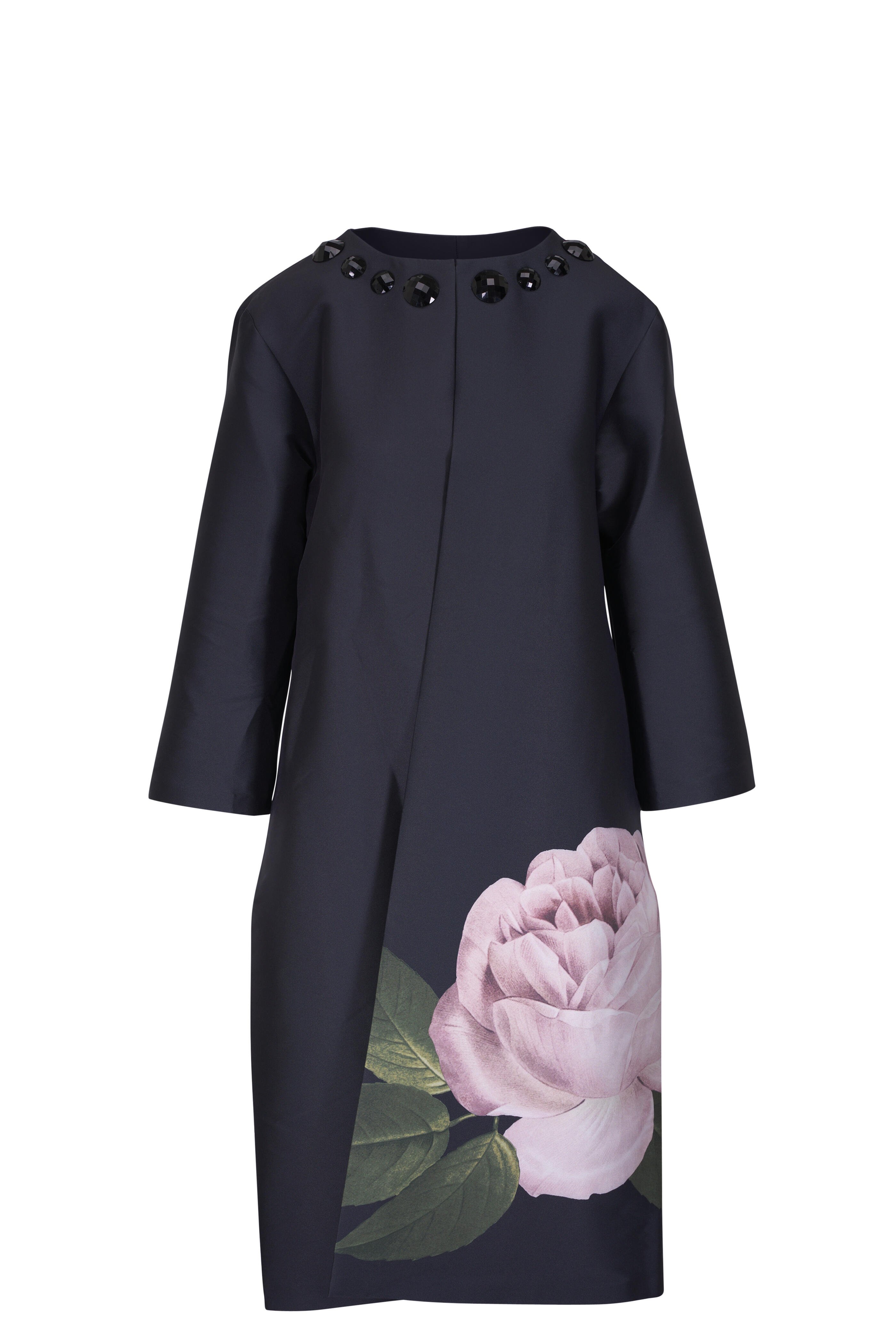 Fully lined. Round neckline. Neckline hook-and-eye closure. Embellishment details at neckline. Concealed side pockets. Bracelet-length sleeves. Imported. Full-Length, 45 1/2" from top of shoulder to bottom hem. 29 1/2" Sleeve Length. 100% polyester. Dry clean.