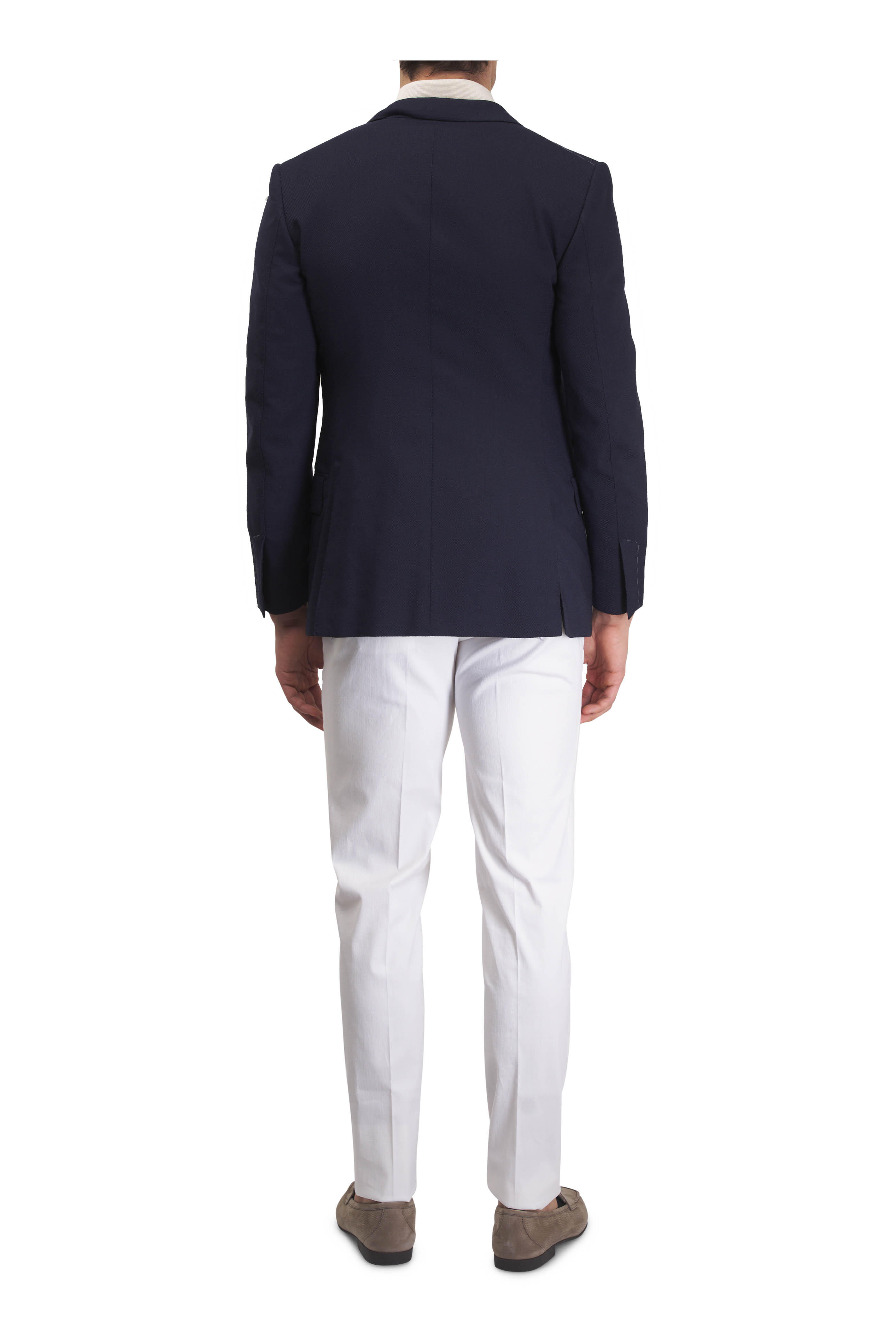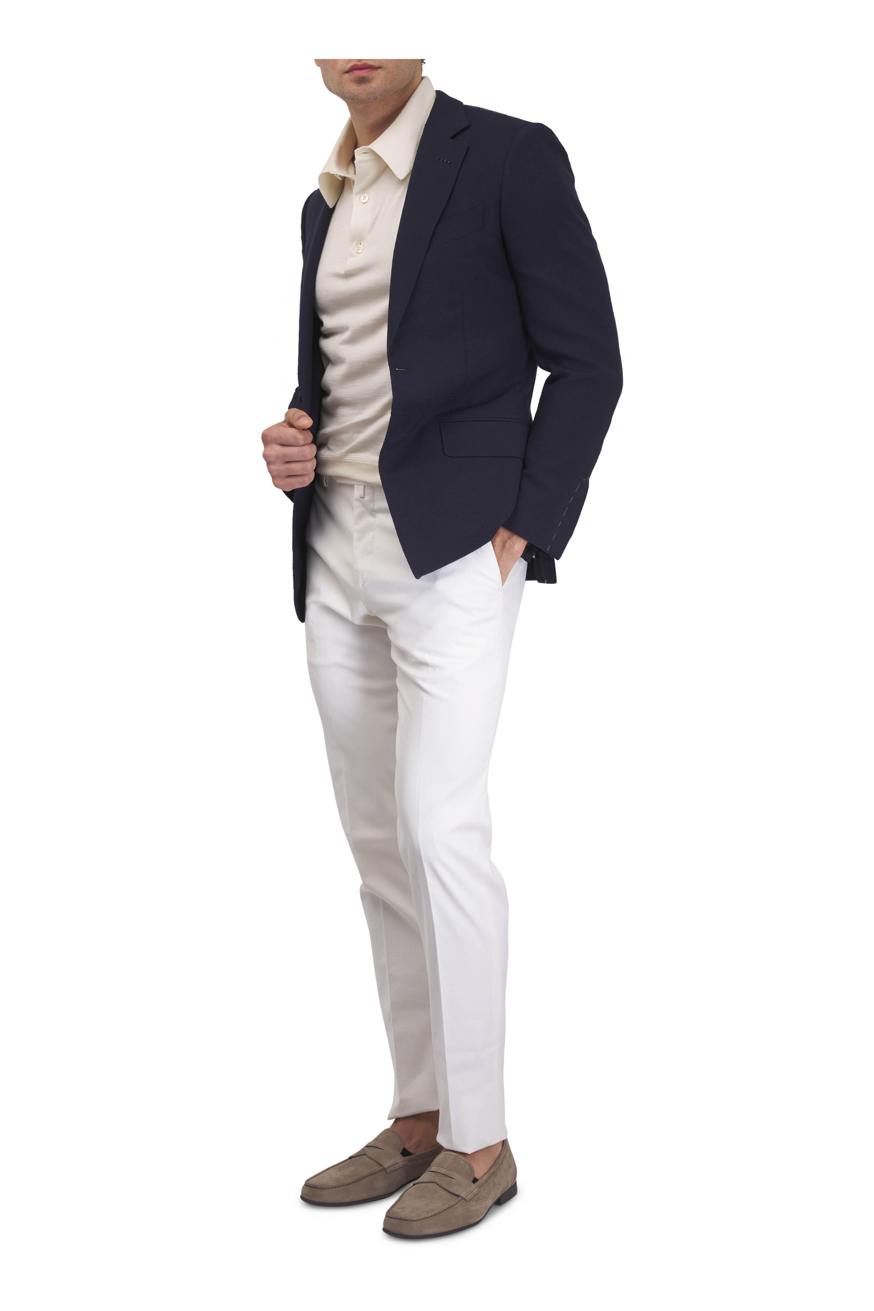 Zip fly; extended button tab closure. Banded waist; belt loops. Front slip pockets; back button besom pockets. Unfinished hem. Made in Italy. 98% cotton, 2% elastane. Dry clean.
