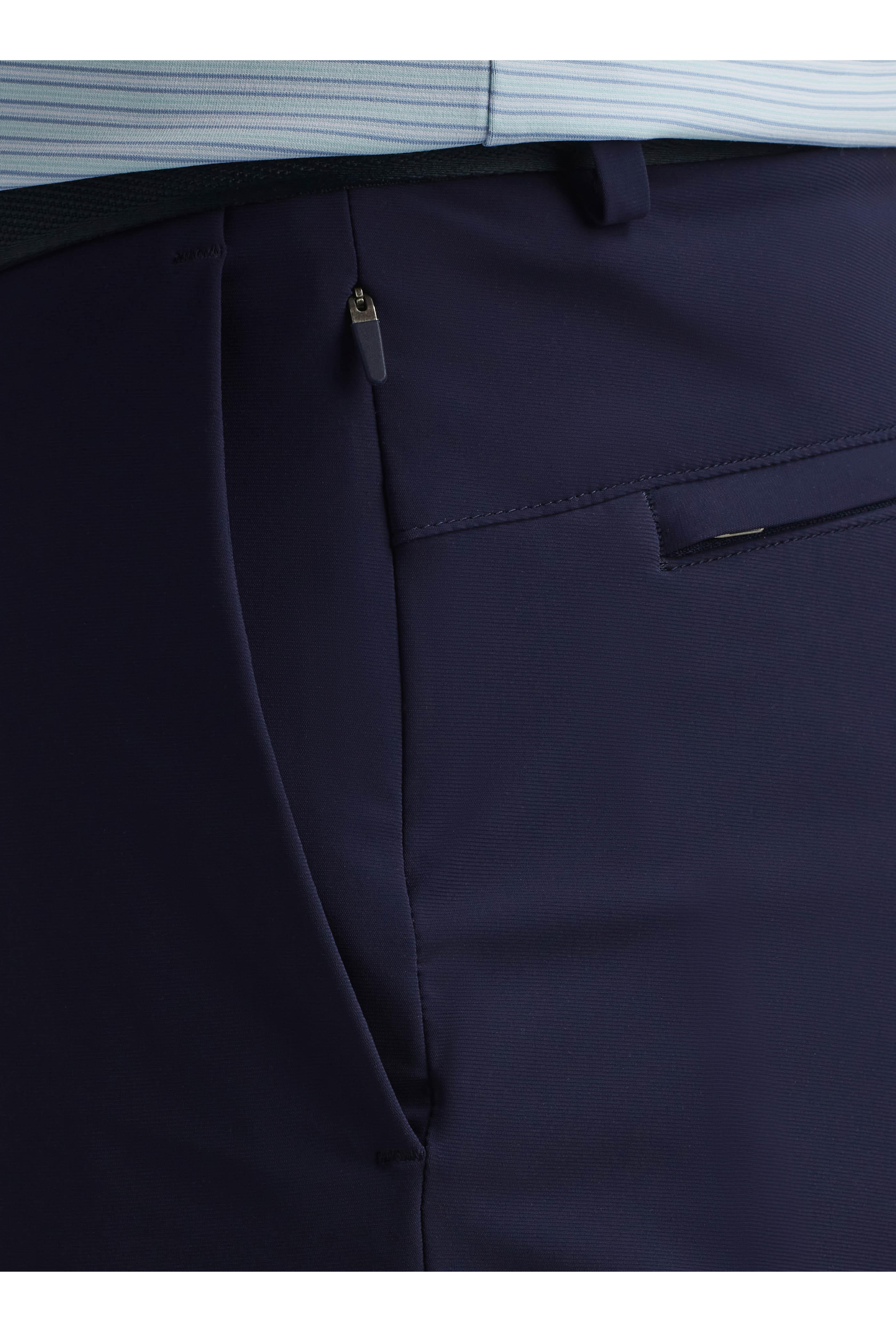 Zip fly; hook-and-eye closure. Front slip pockets; back welt pockets. Imported. Inseam 9" (size 35 R). 79% Recycled nylon, 21% spandex. Machine wash.