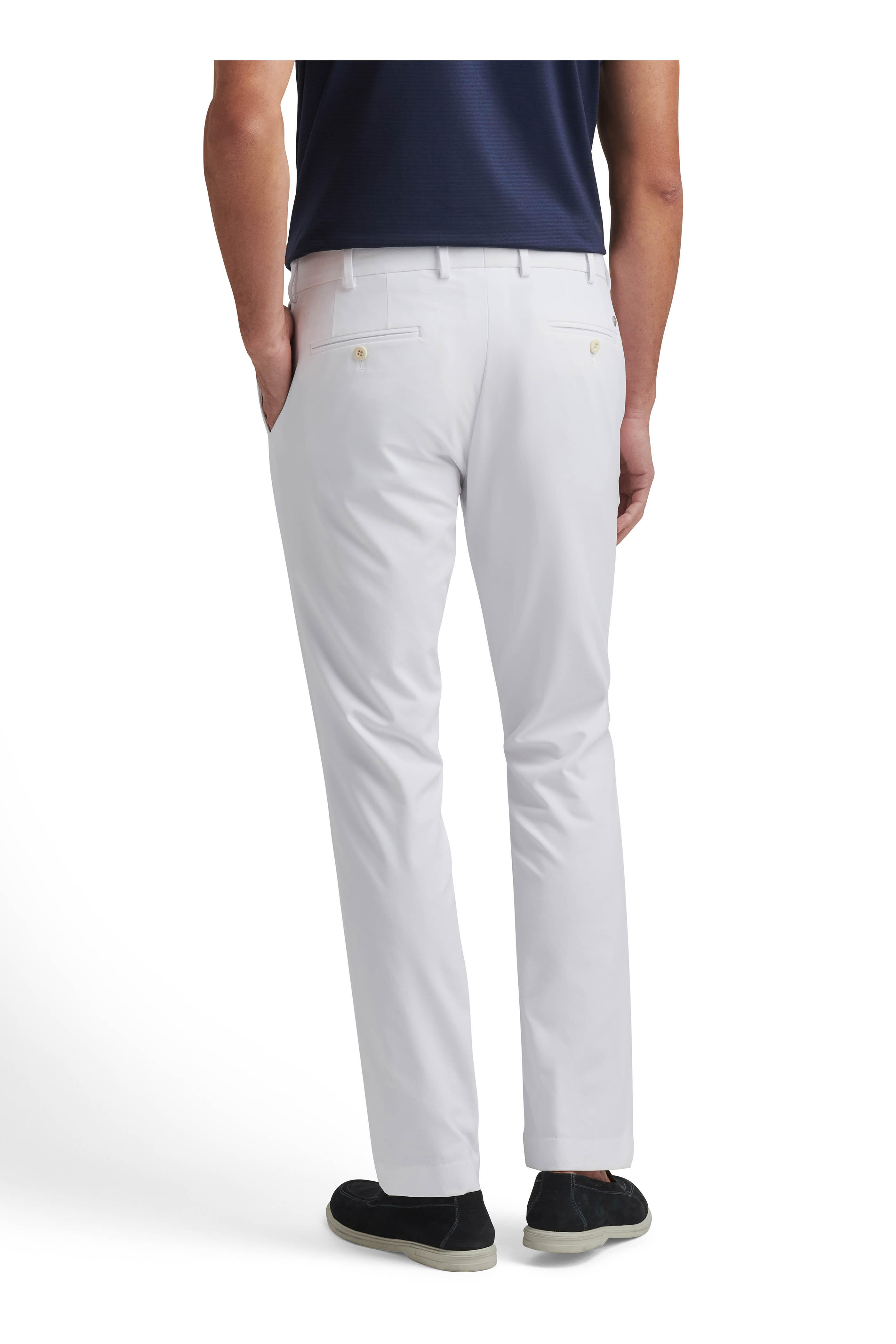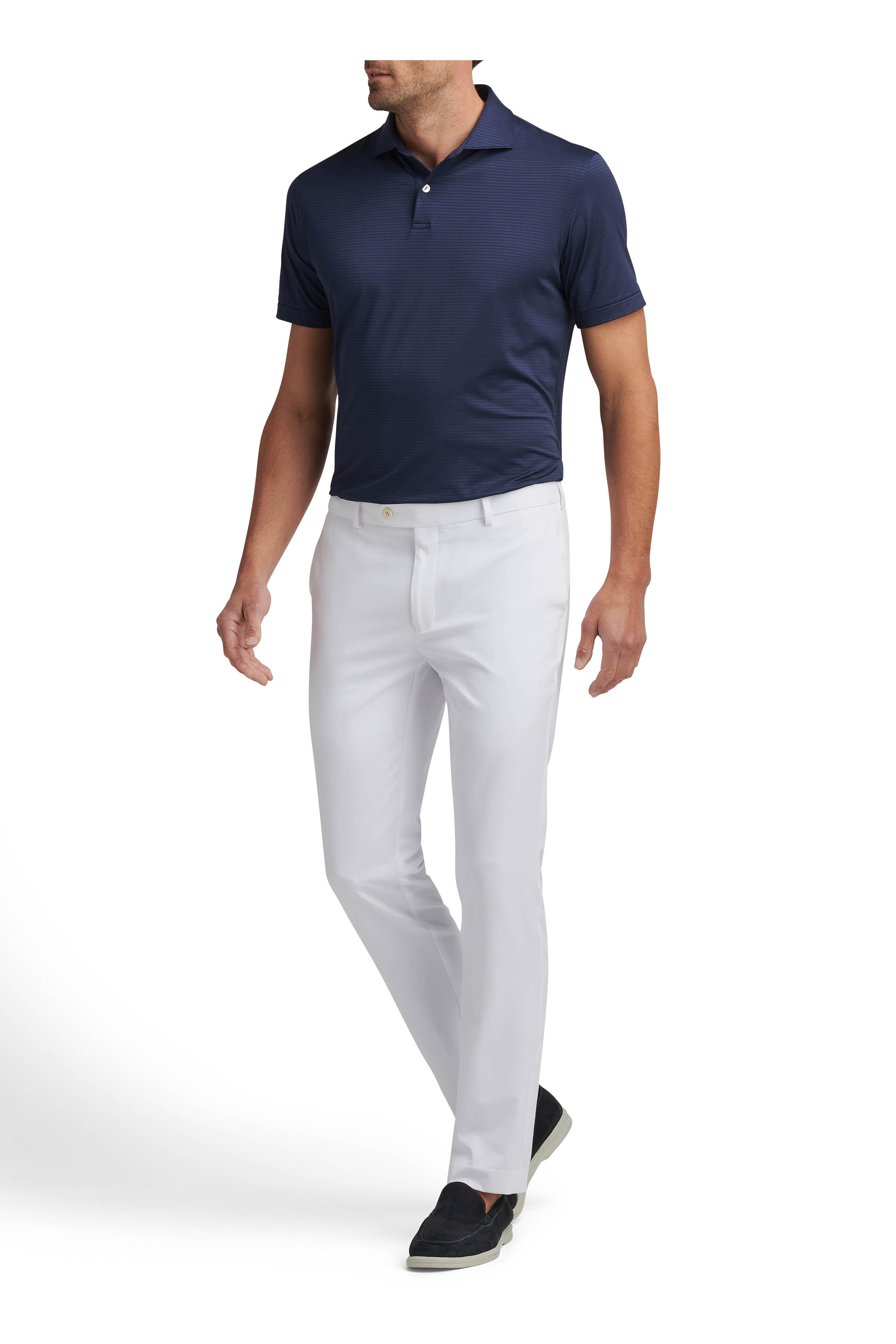 Zip fly with extended button tab. Front slip pockets; back besom pockets. Straight hem. Imported. Inseam 34" (size 36R). 90% polyester, 10% spandex. Machine wash.