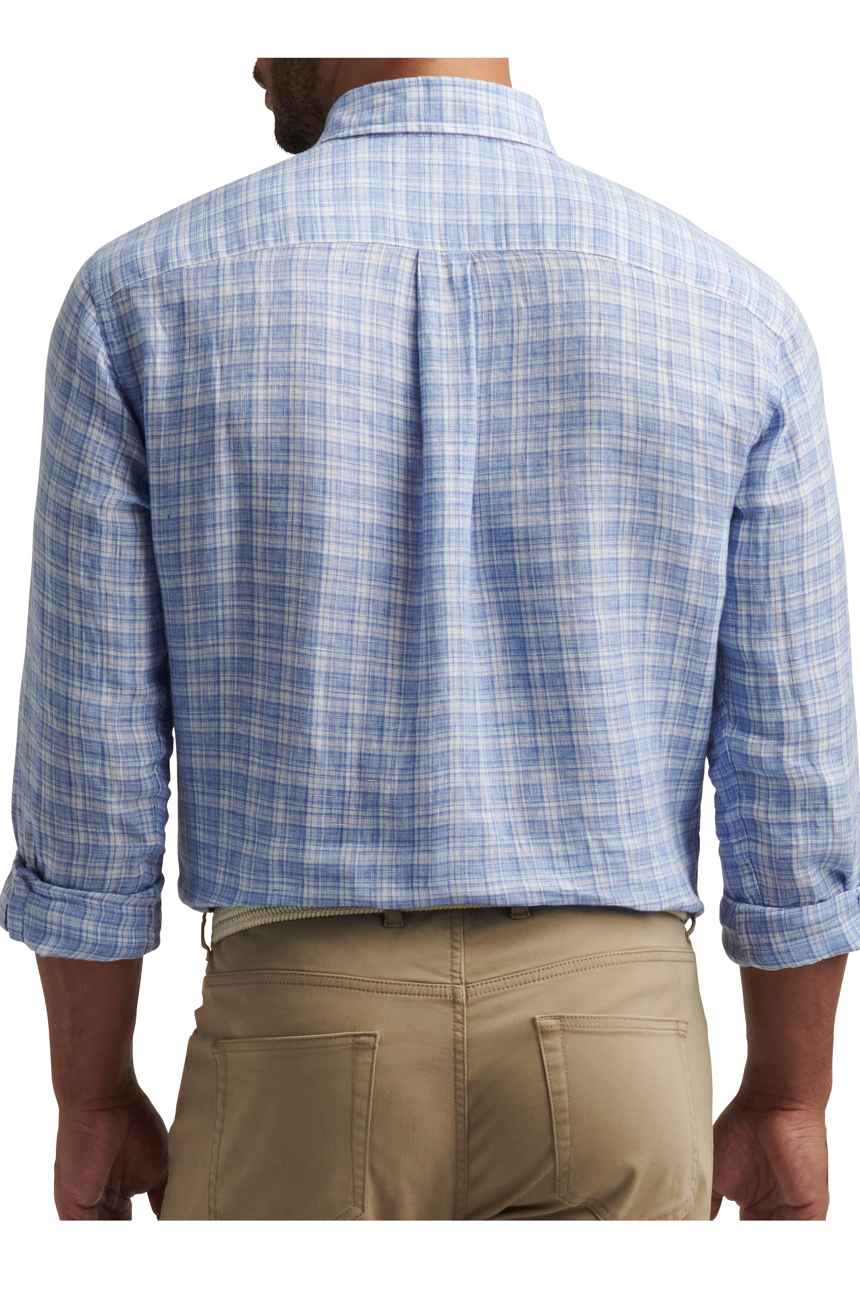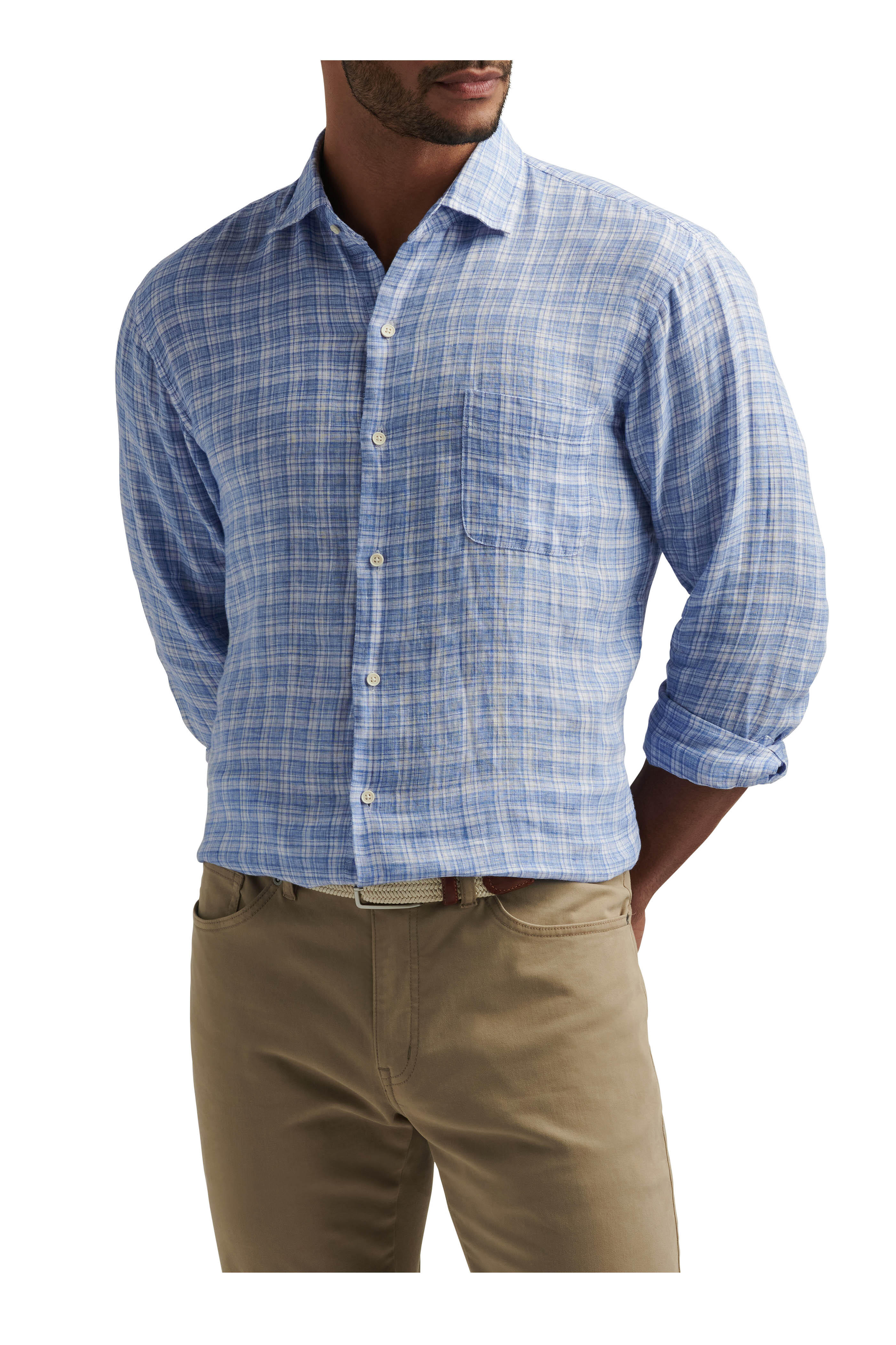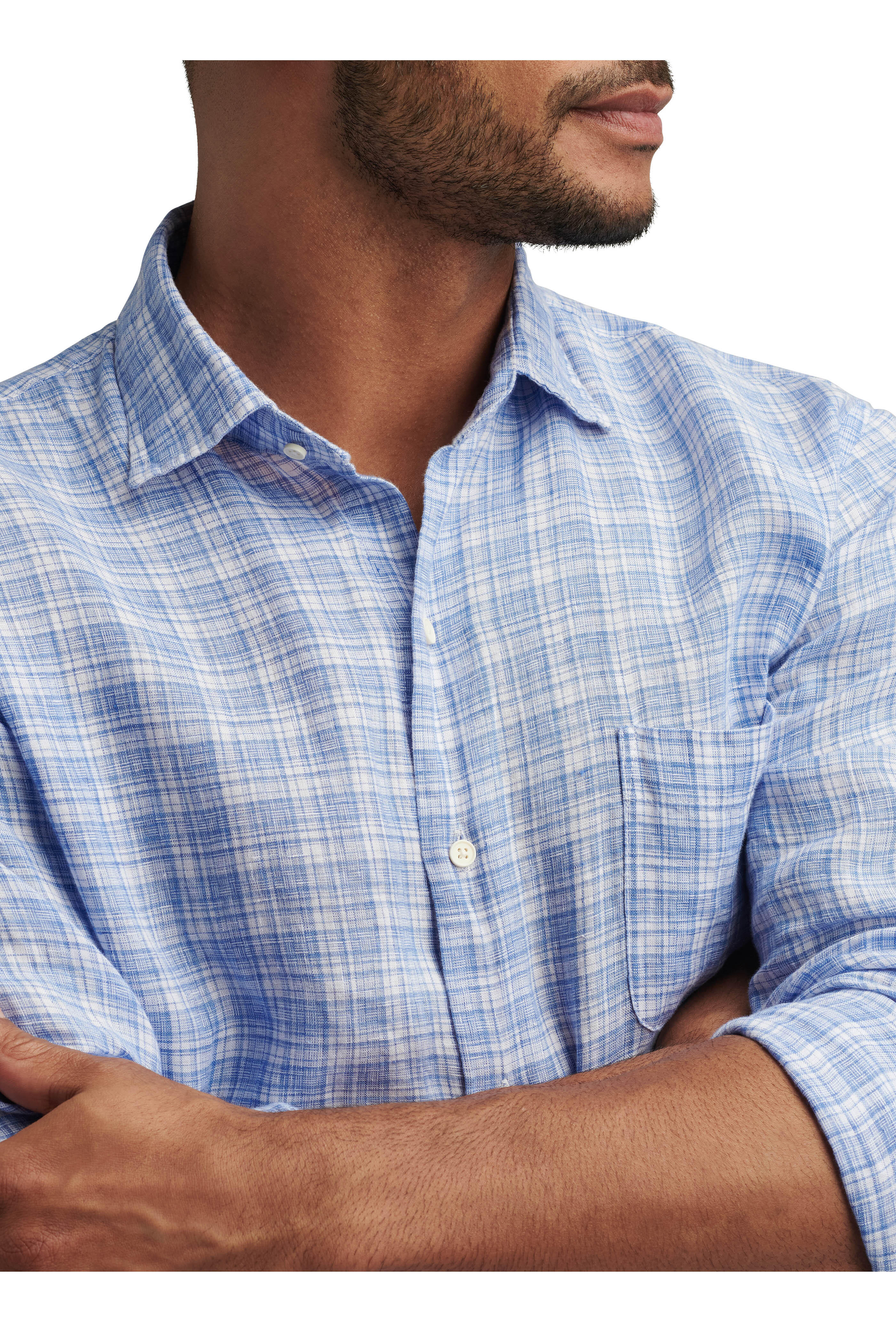 Spread collar. French front button placket. Chest patch pocket. Double button barrel cuffs. Imported. 100% linen. Machine wash.