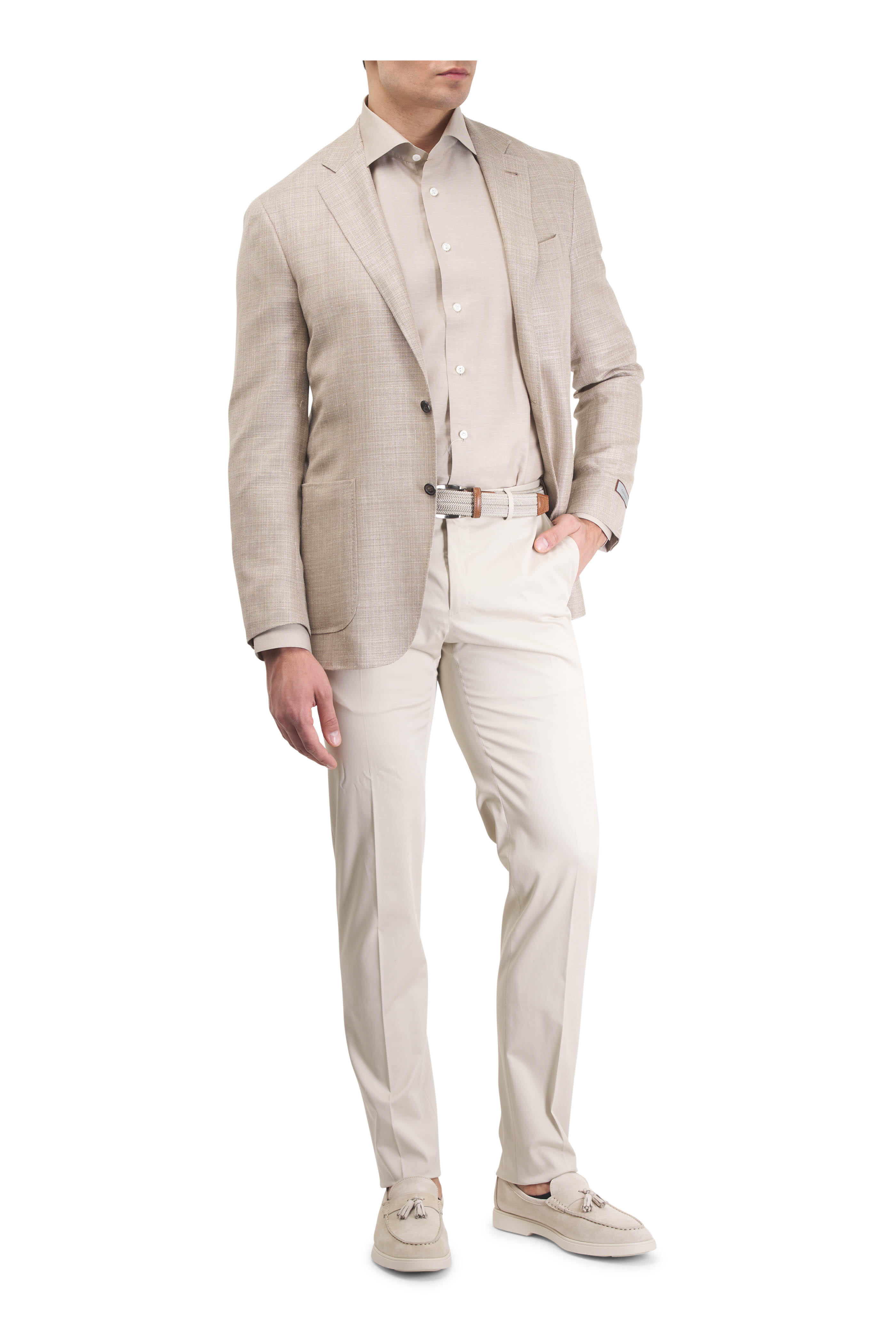 Spread collar. French front button placket. Single button barrel cuffs. Imported. 60% cotton, 25% linen, 15% silk. Machine wash.