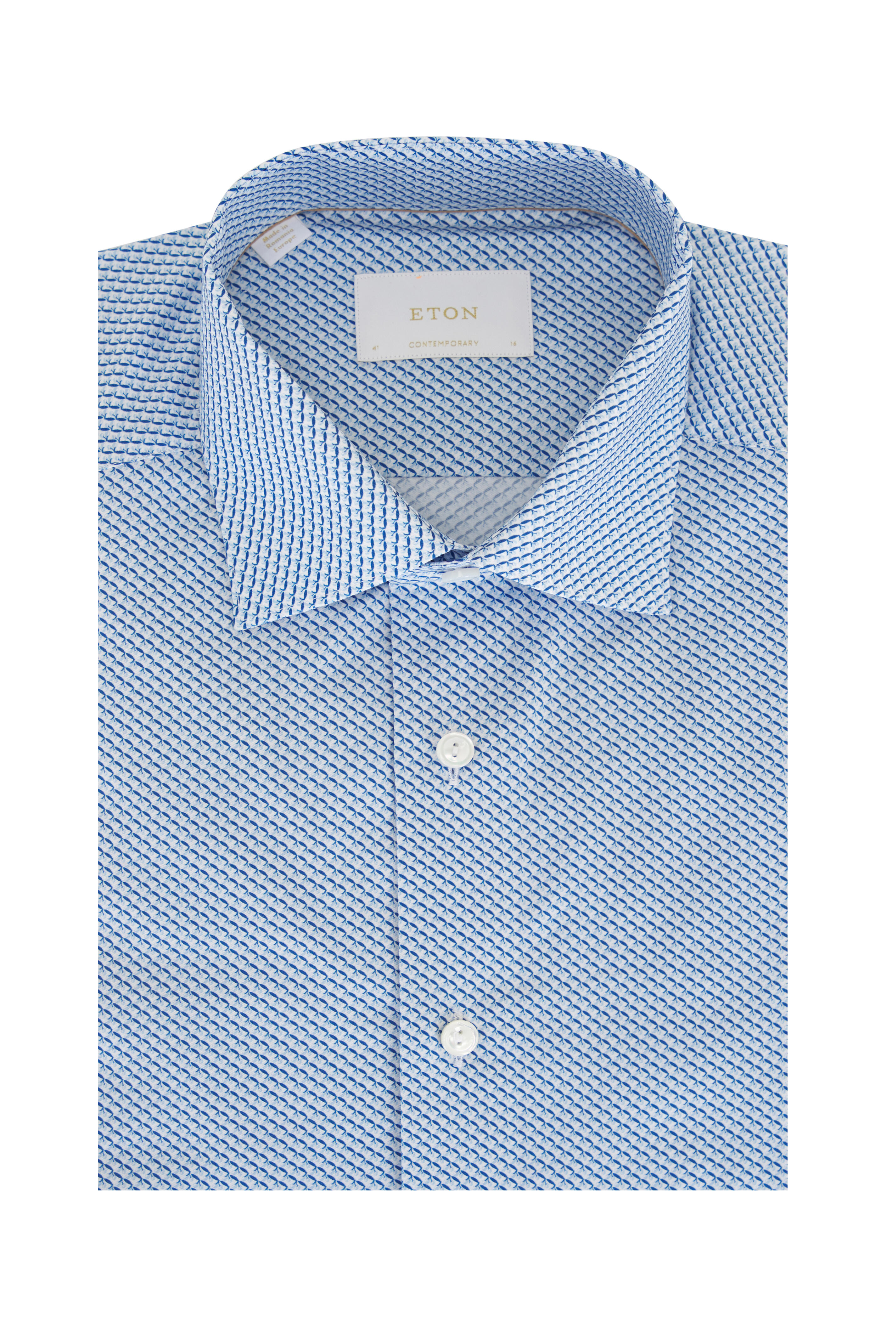 Spread collar. French placket. Single button mitered cuffs. Imported. Contemporary fit. 100% cotton. Machine wash.