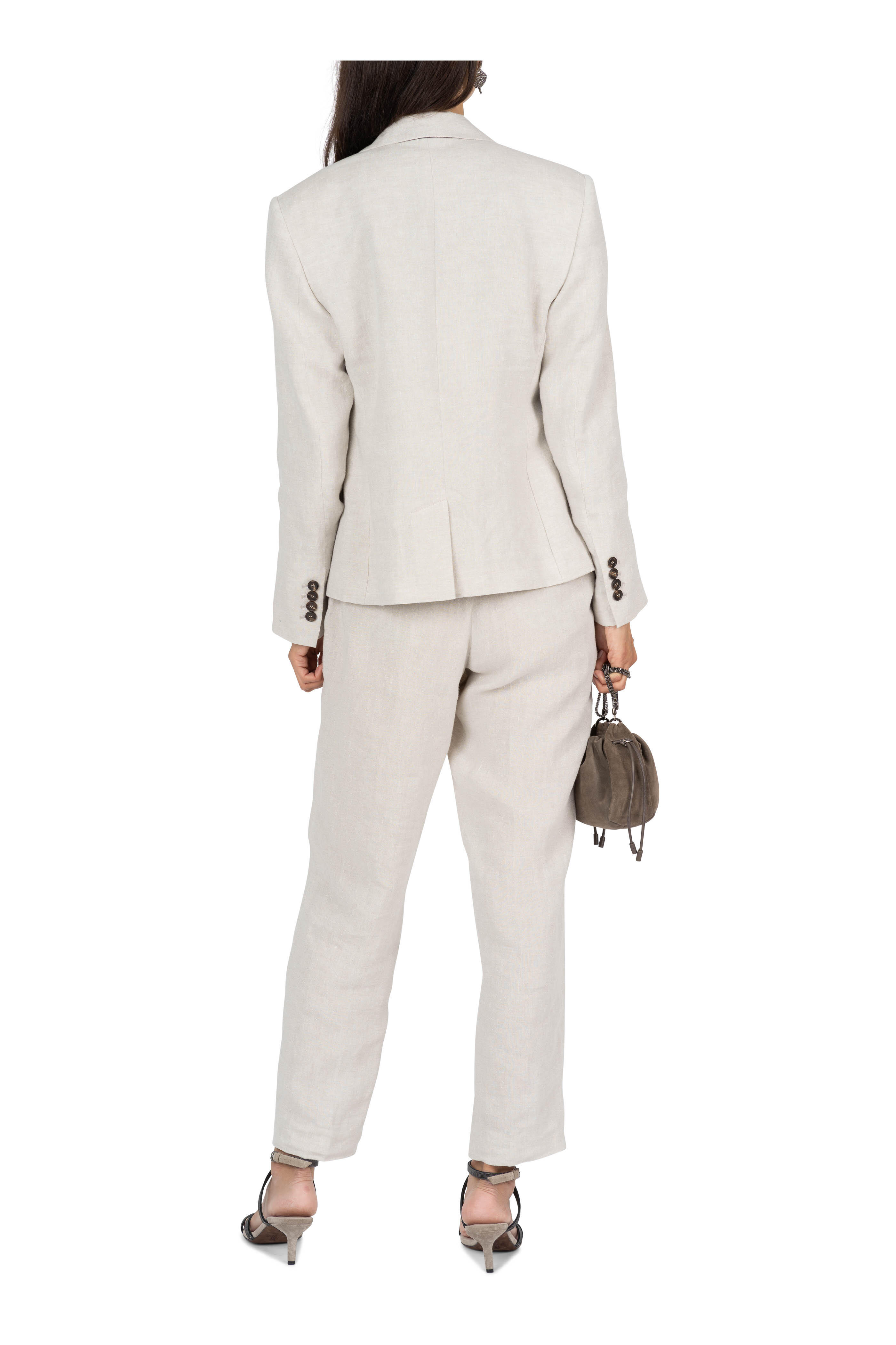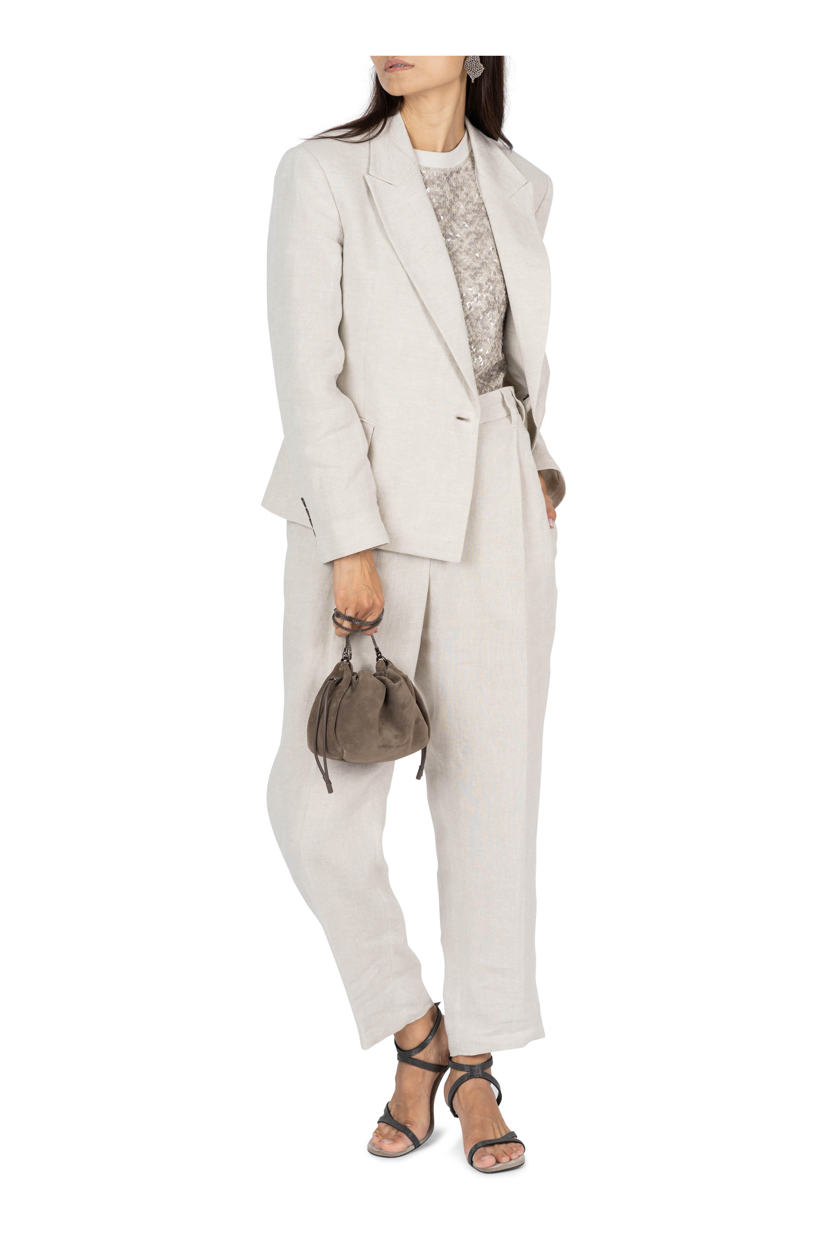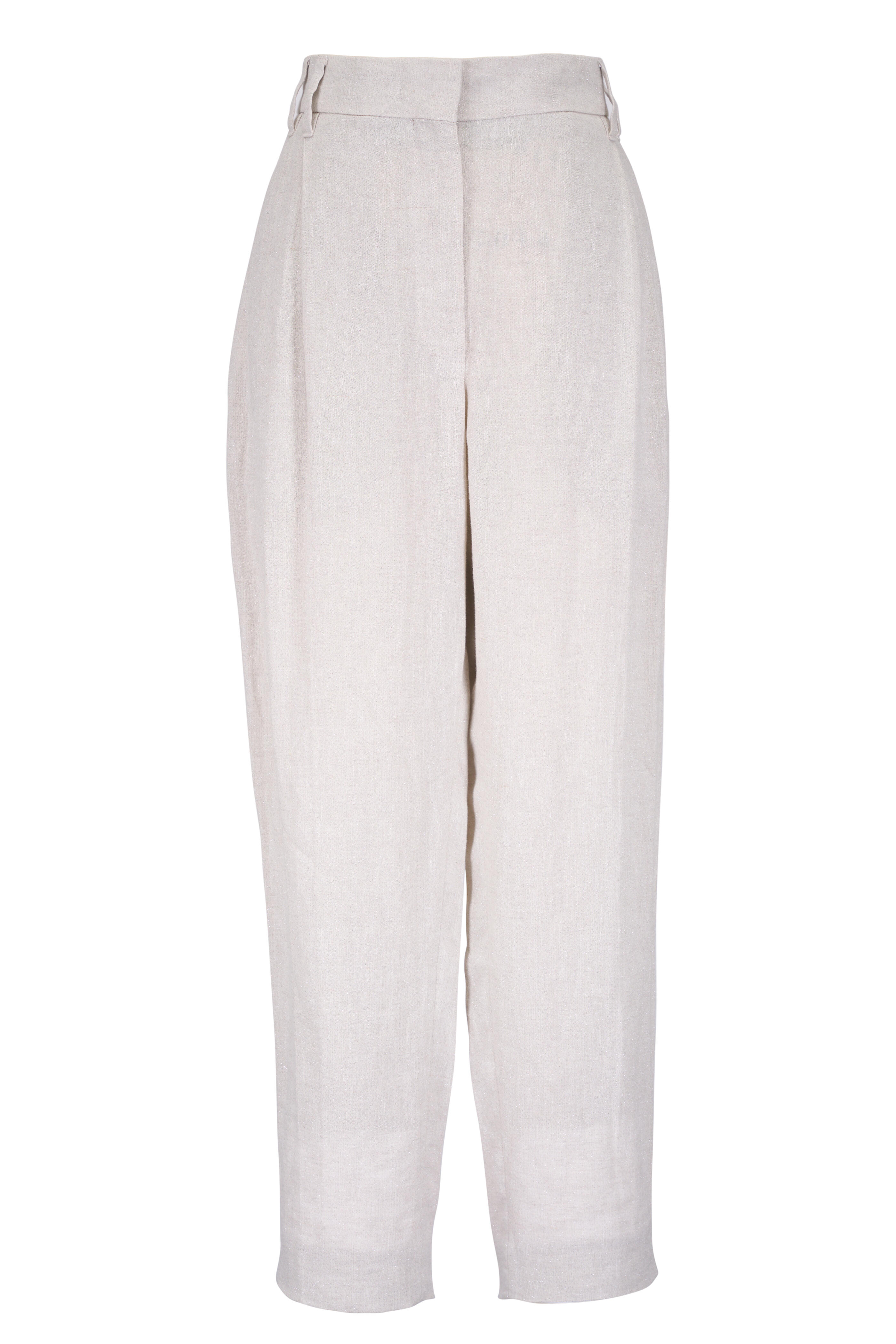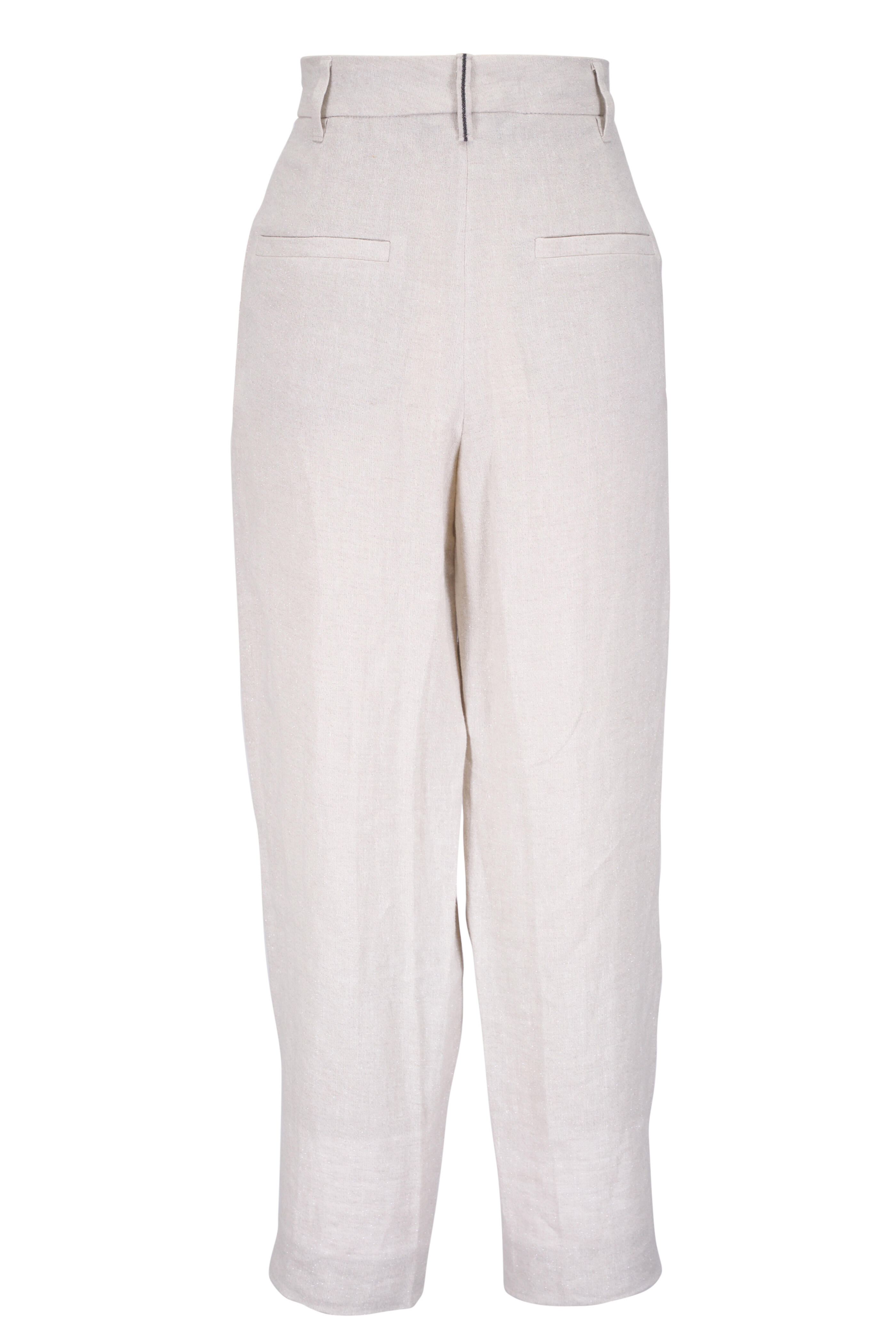 Zip front; metal hook and backing closure. Banded waist; belt loops. Side slip pockets; back welt pockets. Double pleat. Monili detailing on back belt loop. Made in Italy. 97% linen, 2% polyester, 1% nylon; unlined. Dry clean.