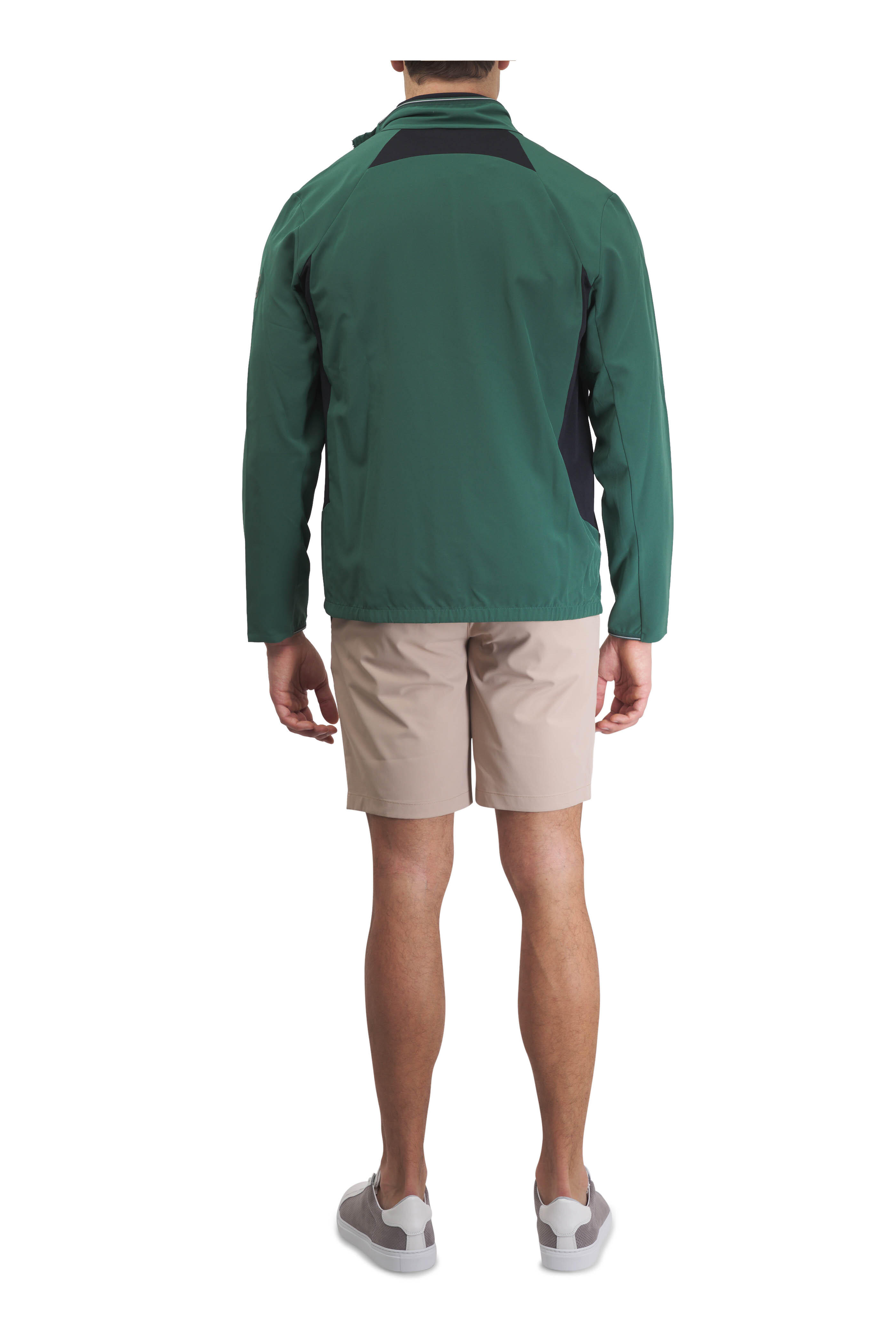 Zip fly; button closure. Banded waist; belt loops. Side slip pockets; back welt pockets. Imported. Inseam: 10". 100% polyester. Machine wash.