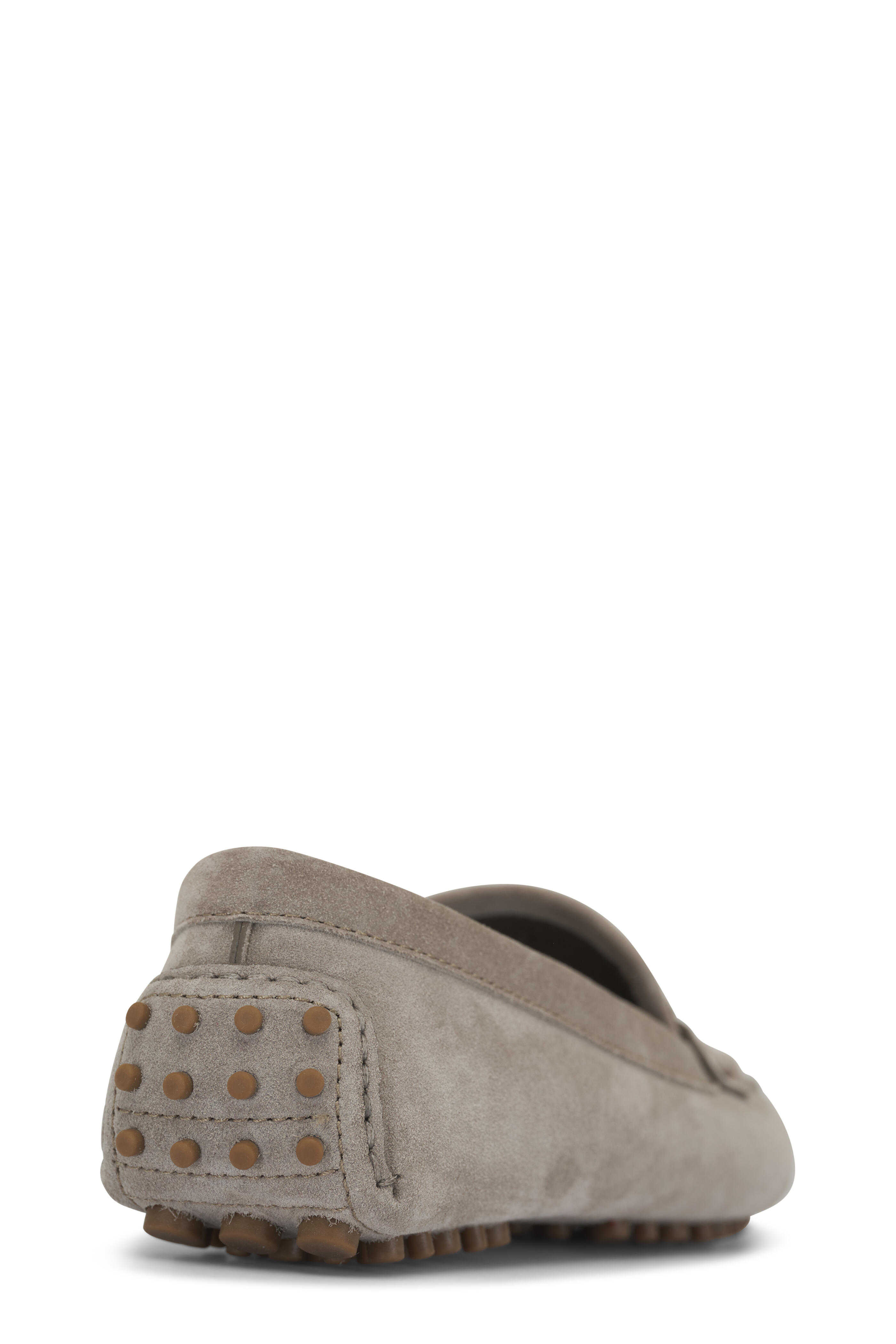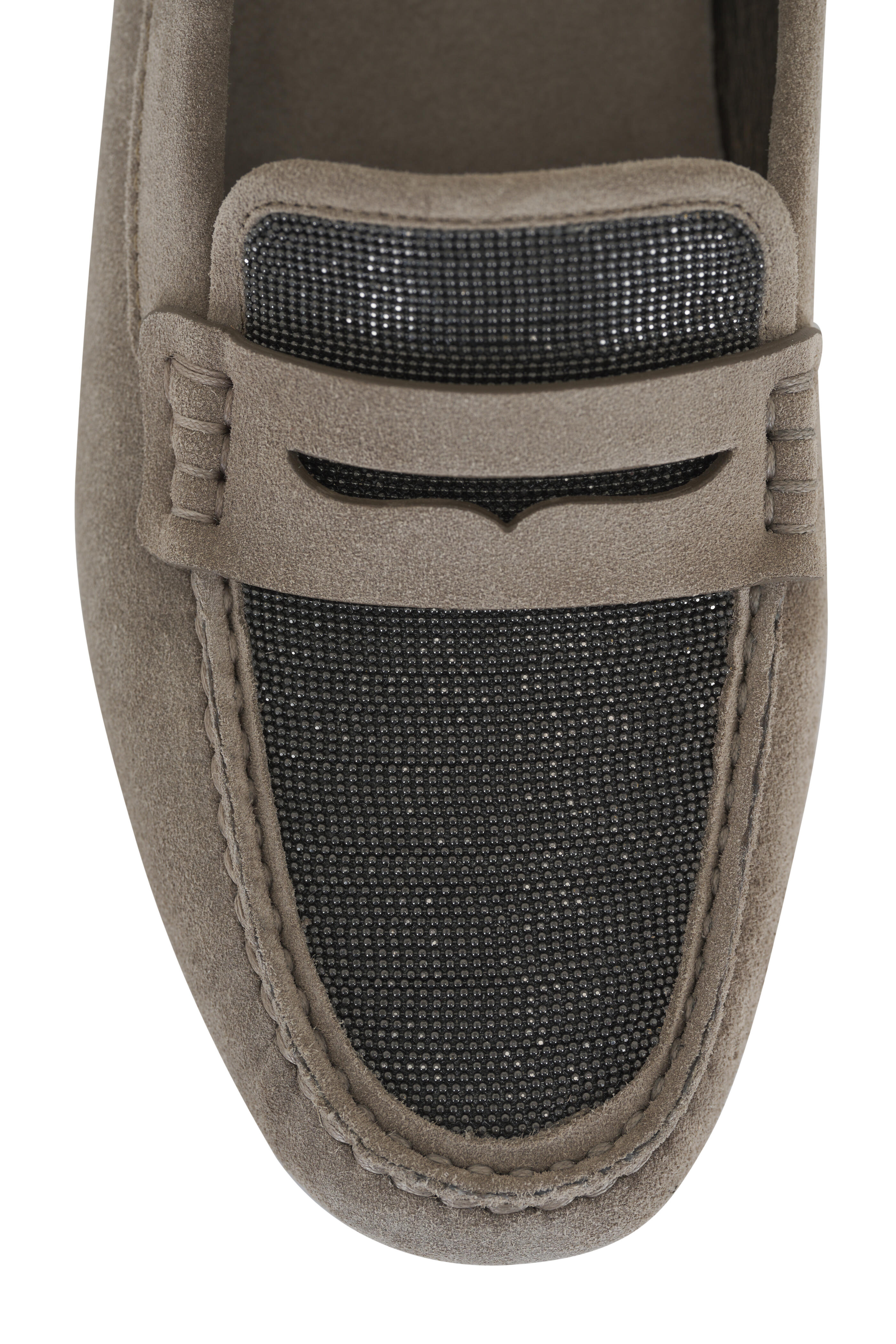 Suede upper. Almond toe. Signature monili beads across upper; penny strap. Leather lining and suede insole. Pebbled rubber sole. Made in Italy.