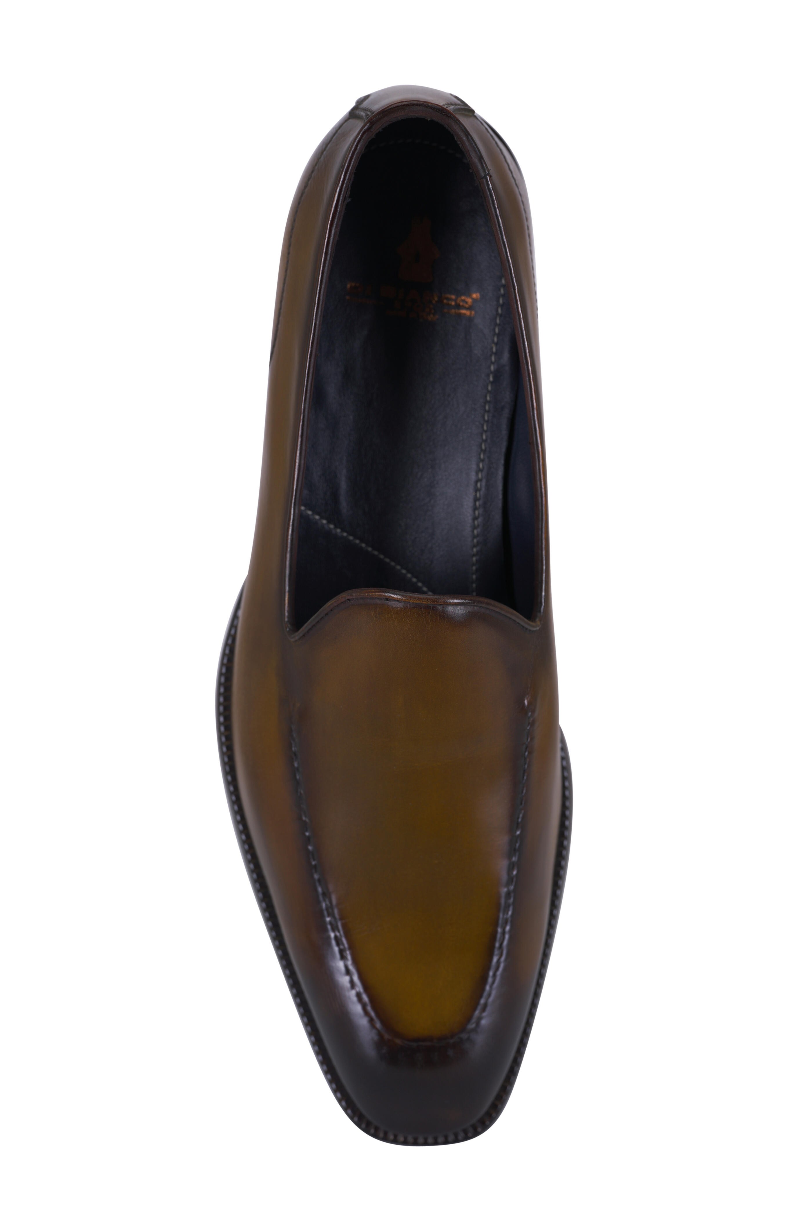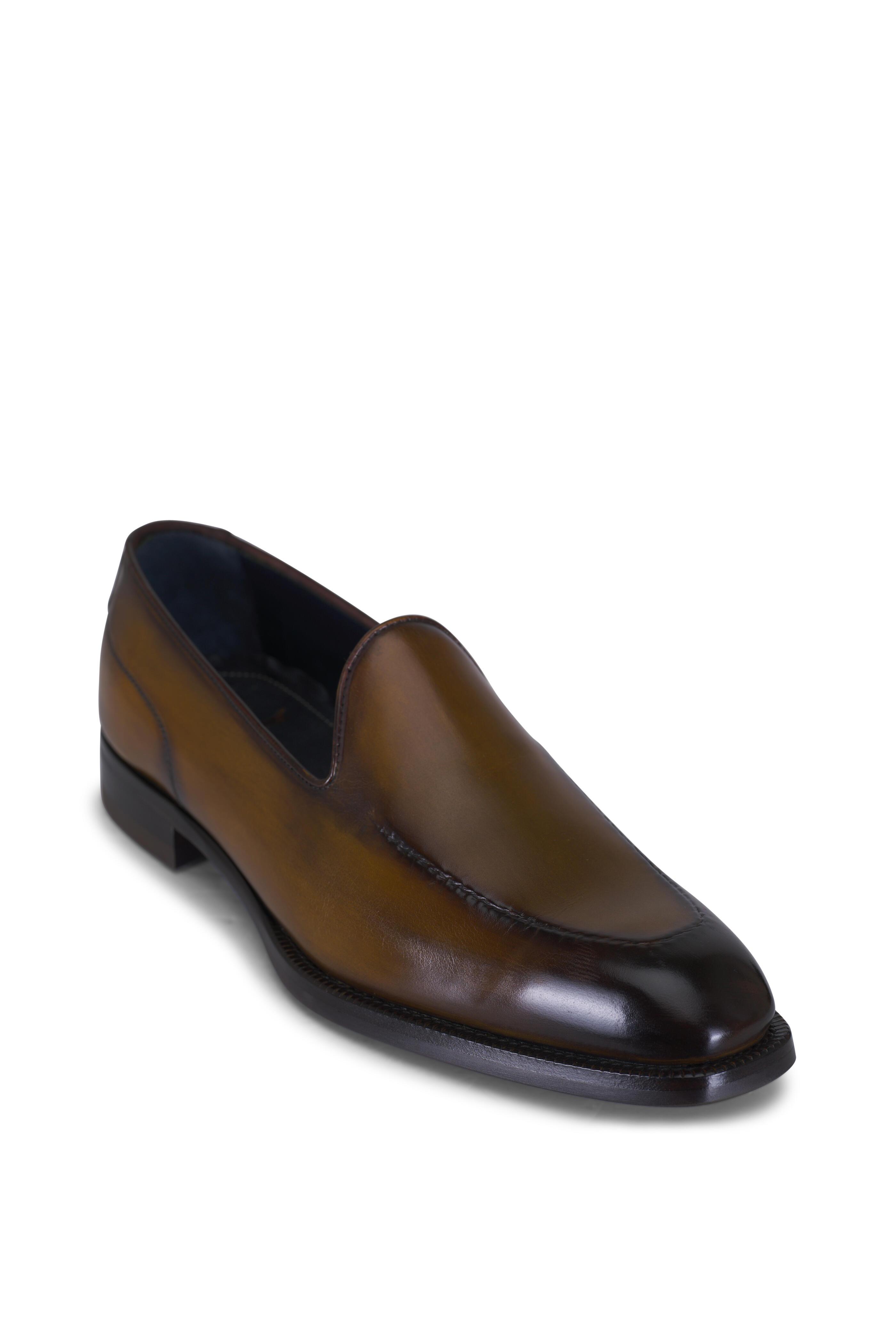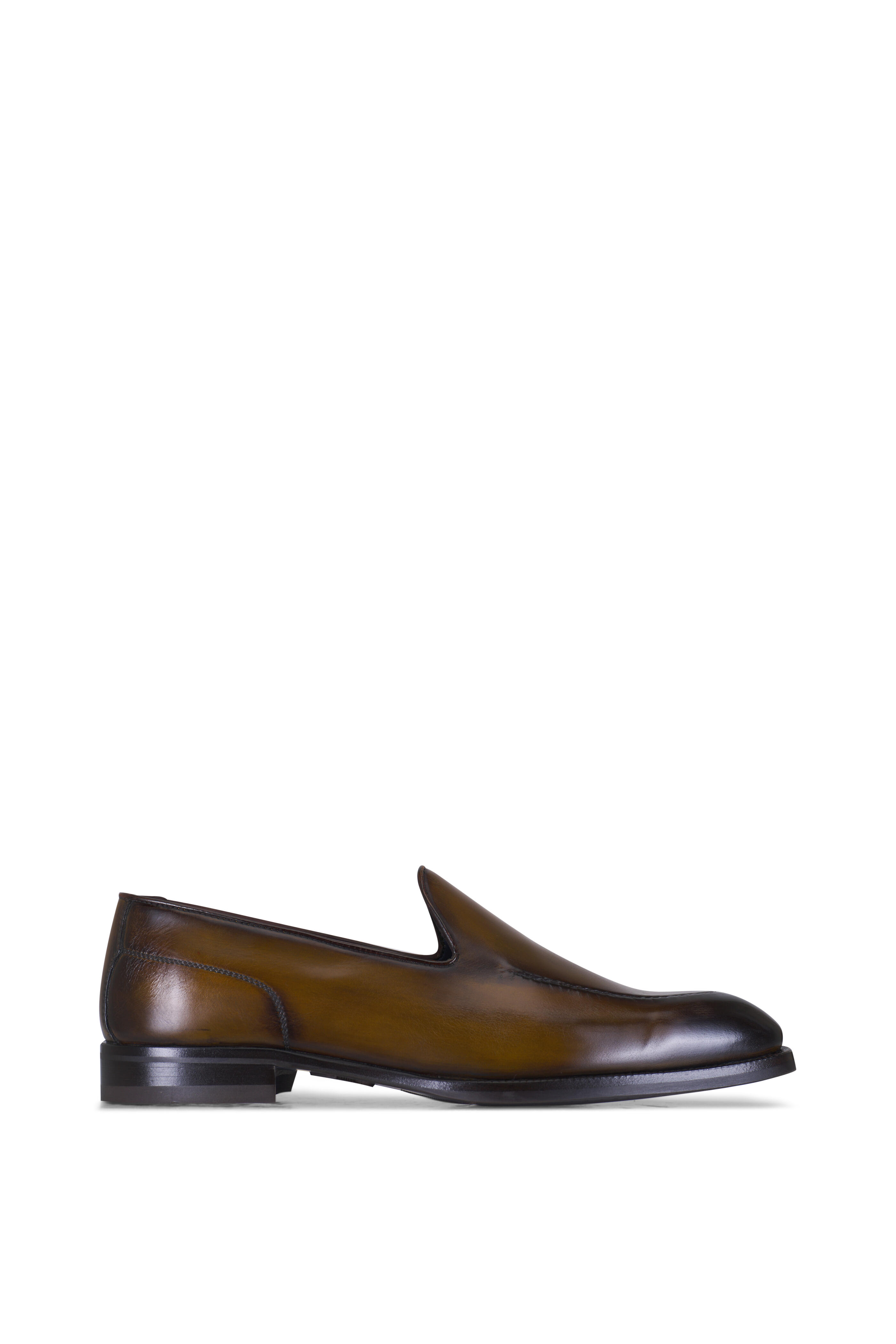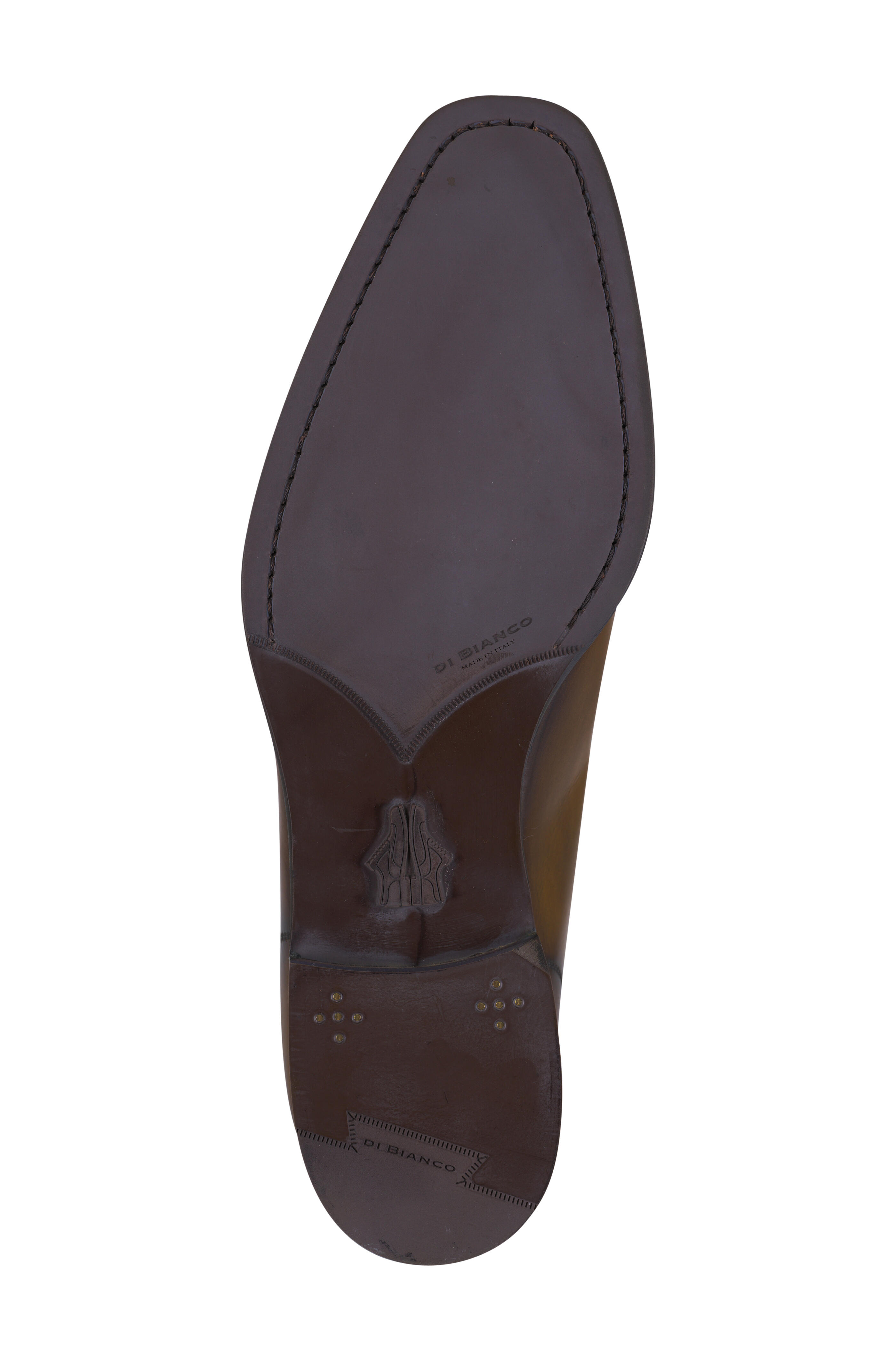 Leather upper and lining. Reinforced almond toe. Slip-on style. Flexible construction. Distinctive stitched vamp. Gel innersole. Rubber and leather sole. Stacked heel. Made in Italy. All sizes listed are in US measurements.