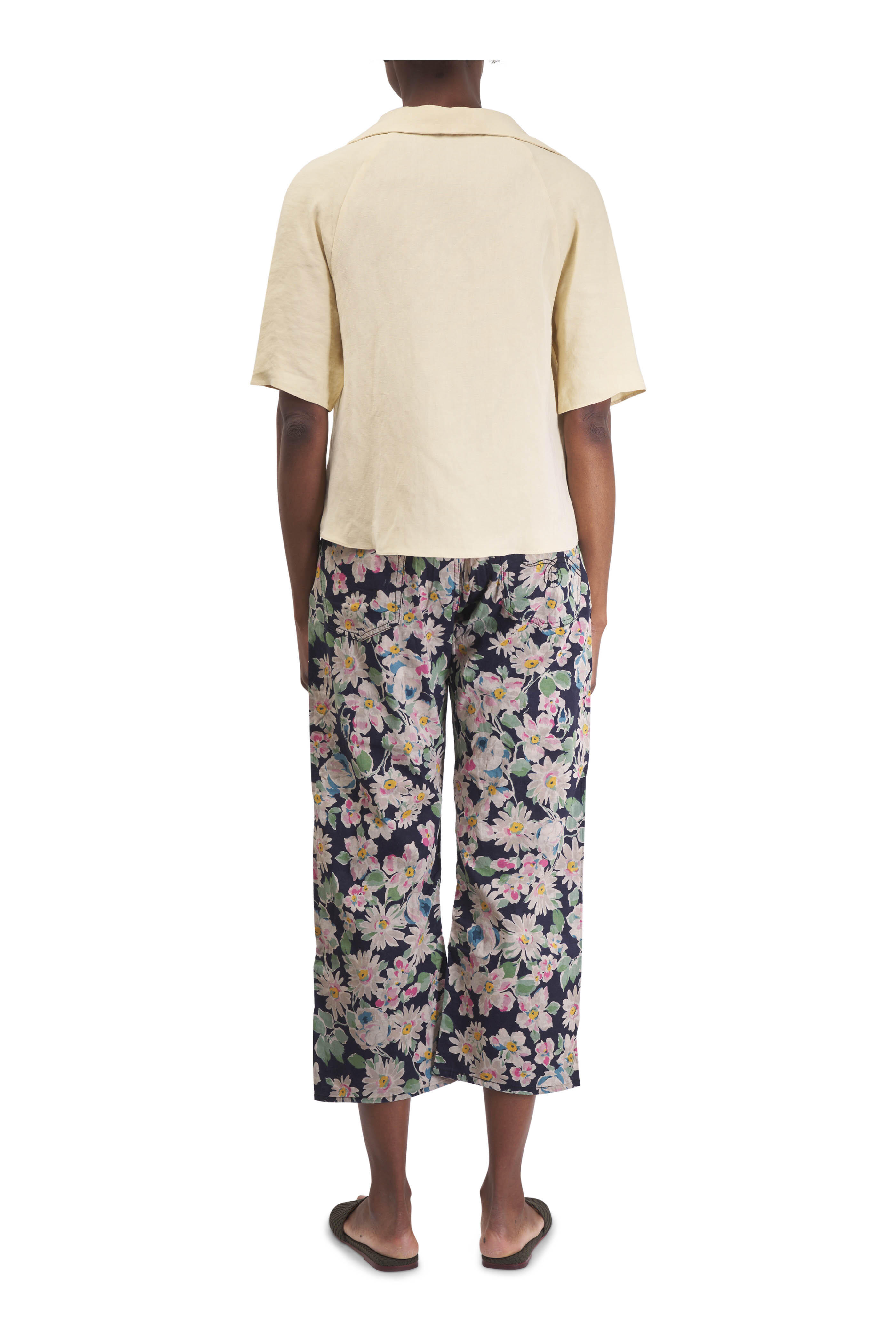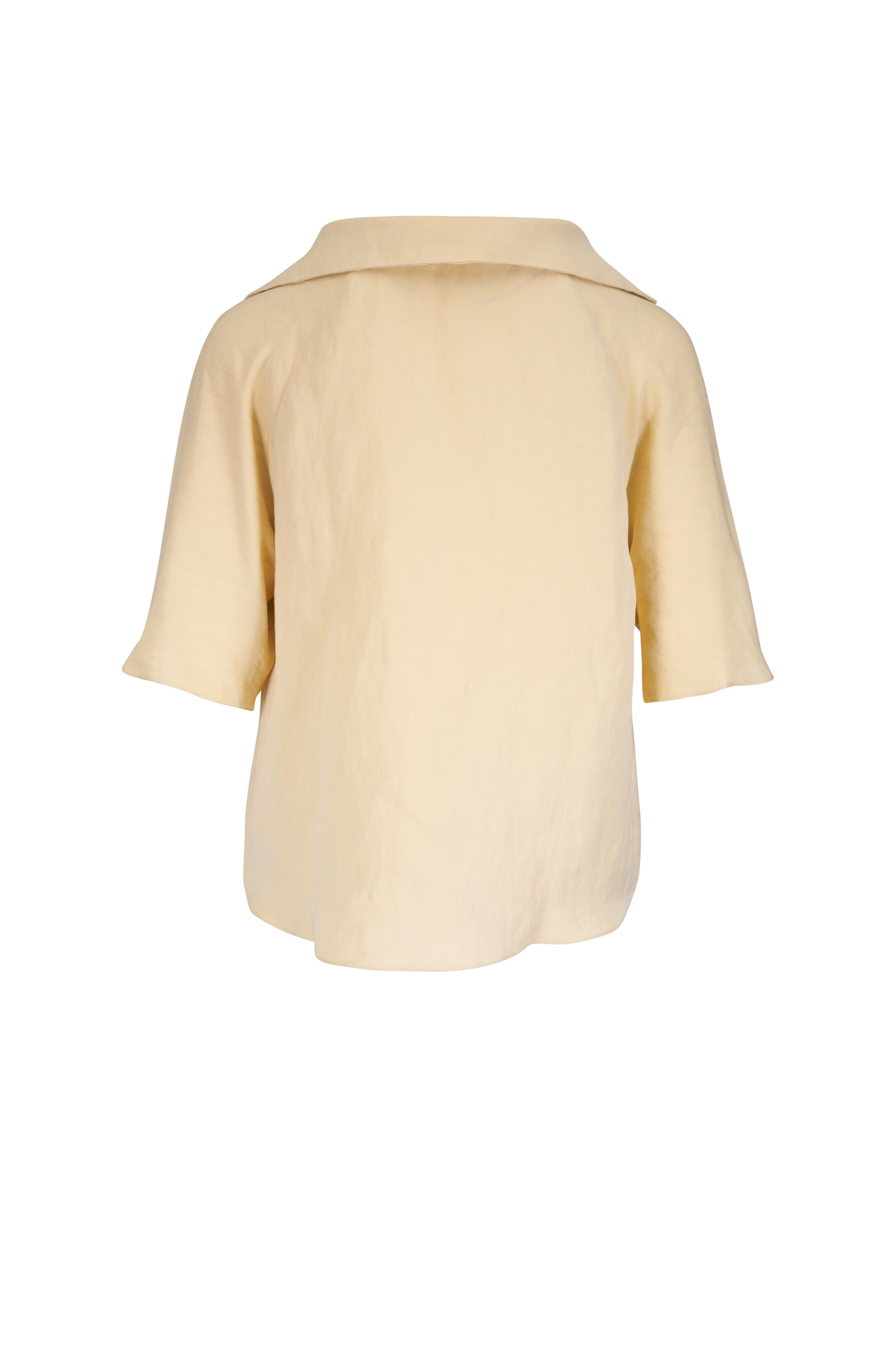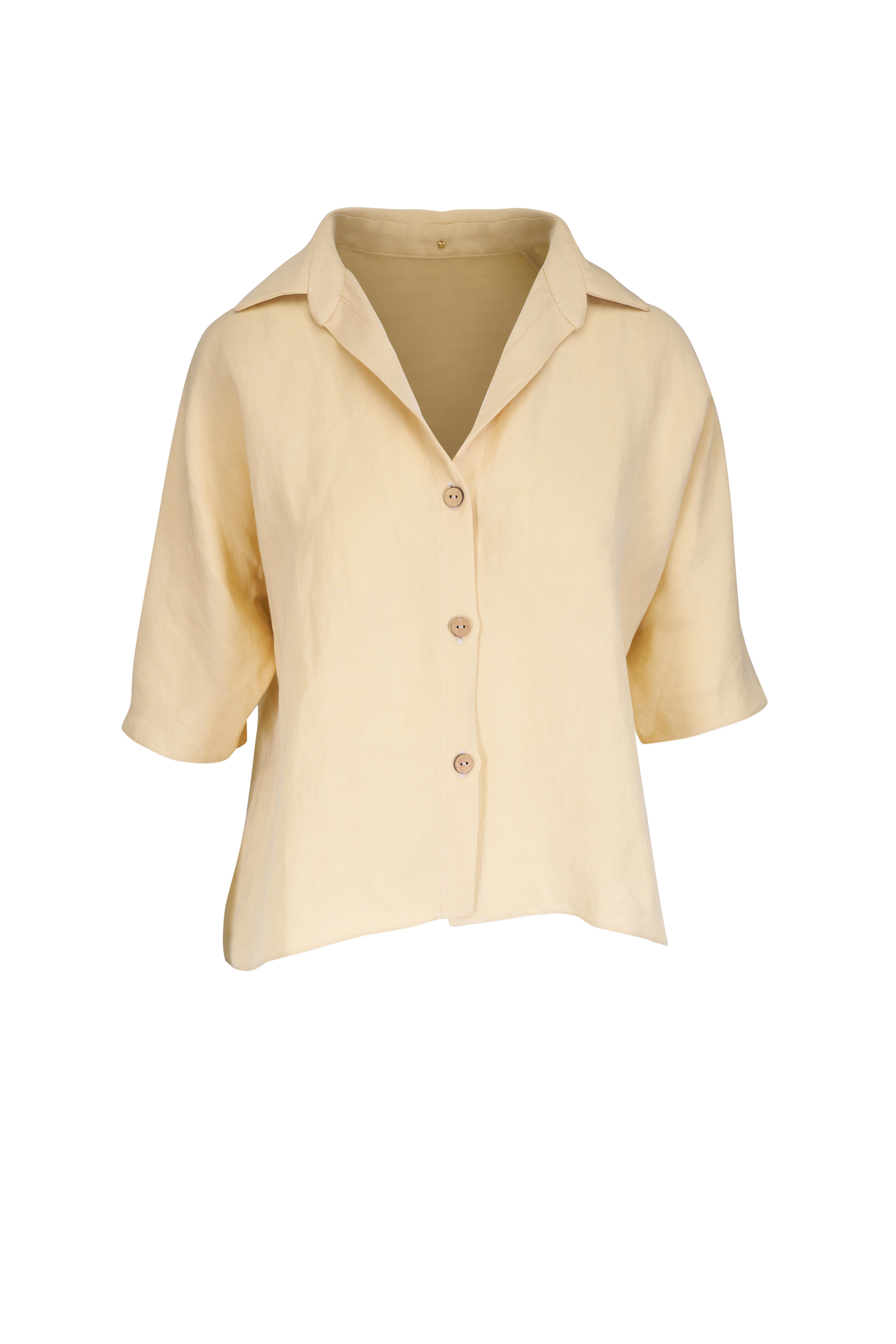 Spread collar. Front button placket. Made in USA. 59% viscose, 41% linen. Dry clean.