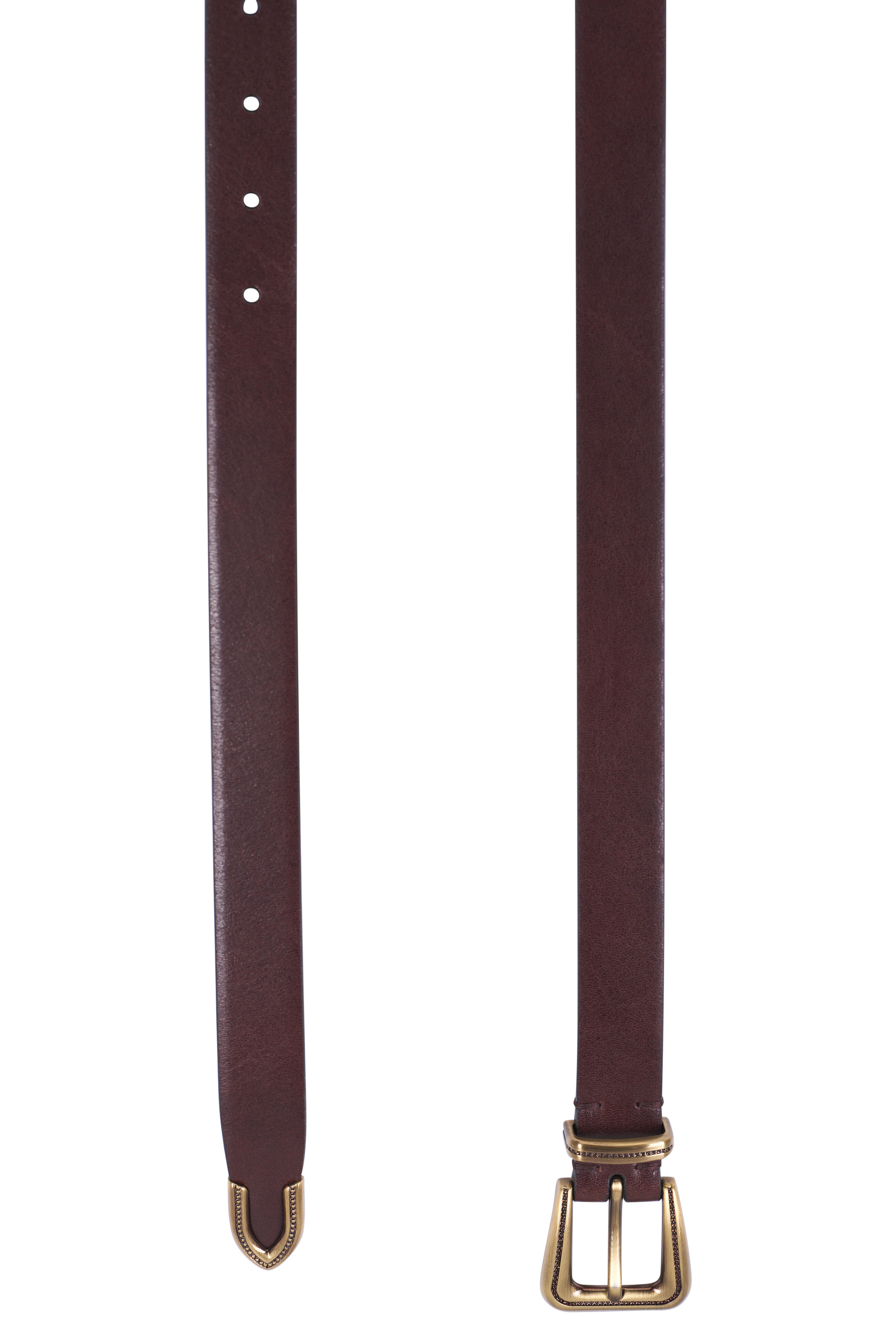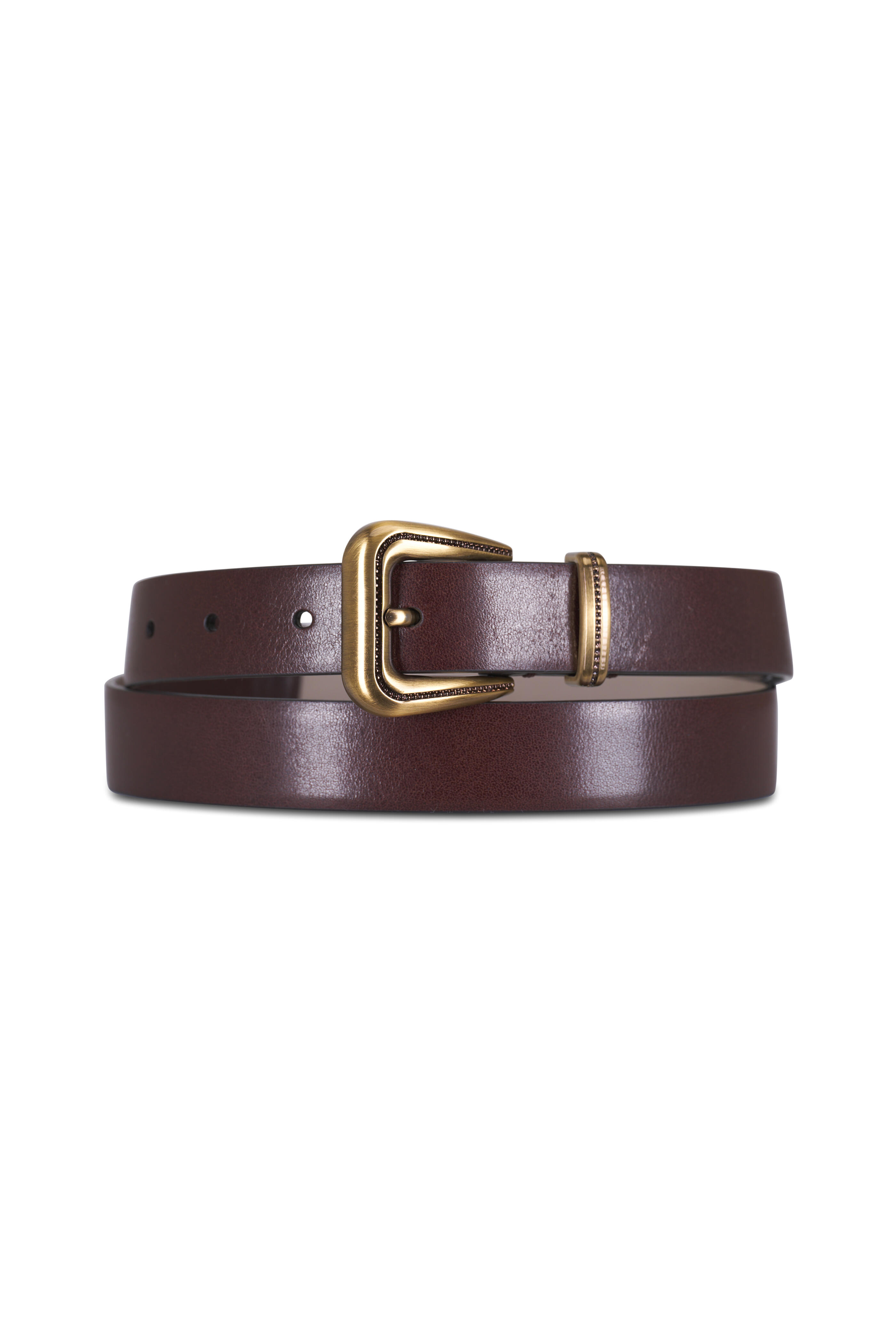 Leather. Single belt loop keeper. Monili accented buckle. Tapered tip with gold metal cover. Brass-toned hardware. Made in Italy. Approximately 25mm width.