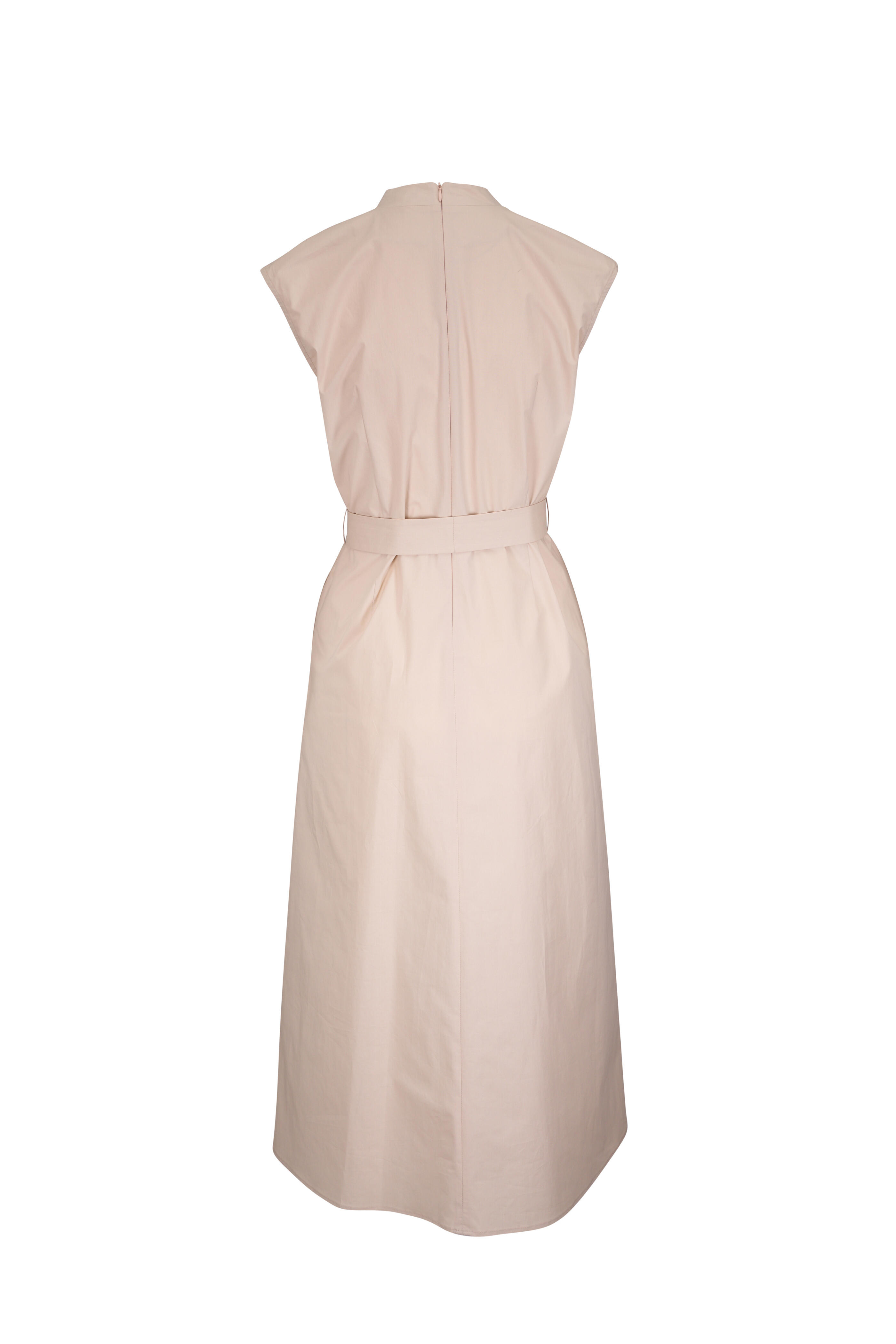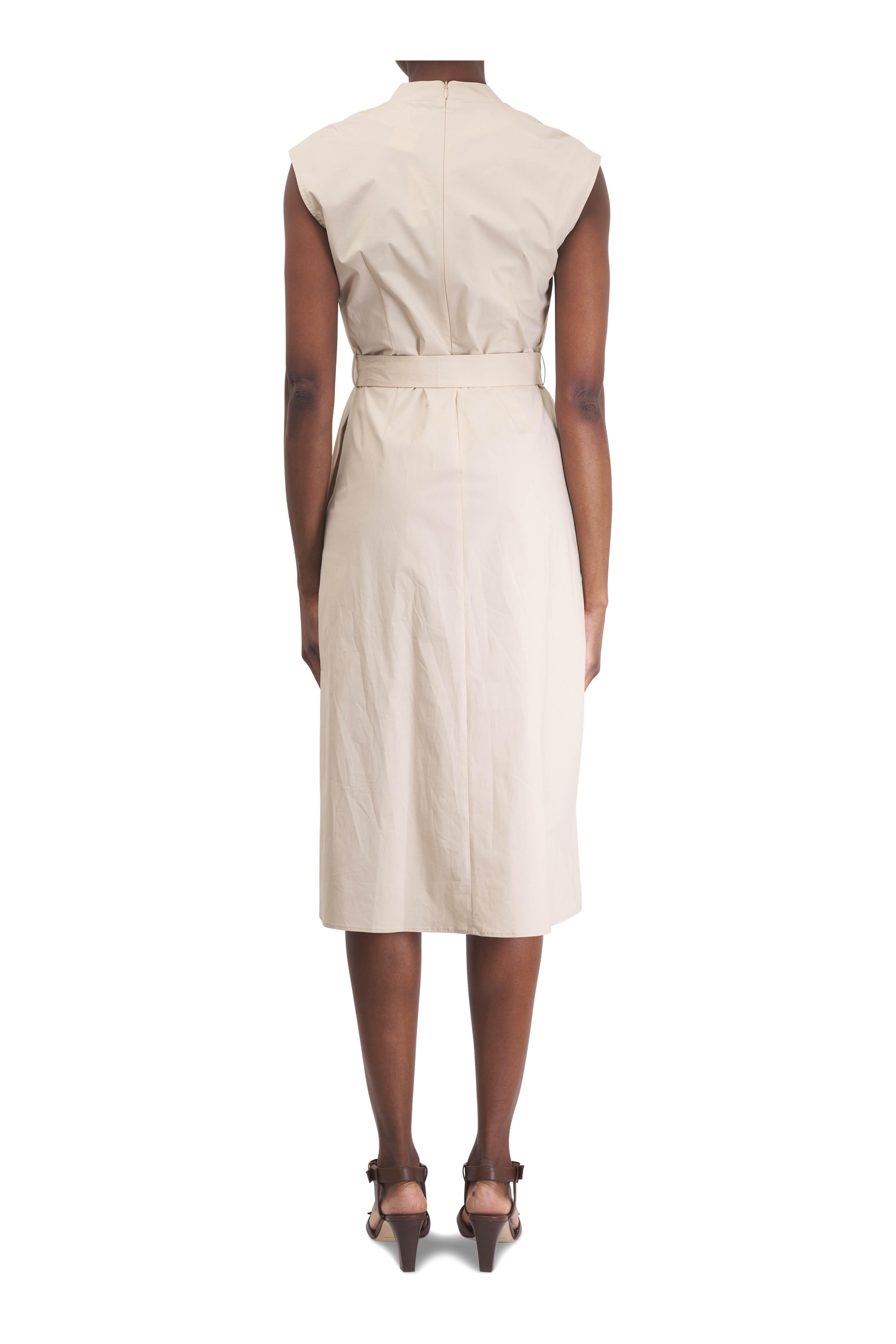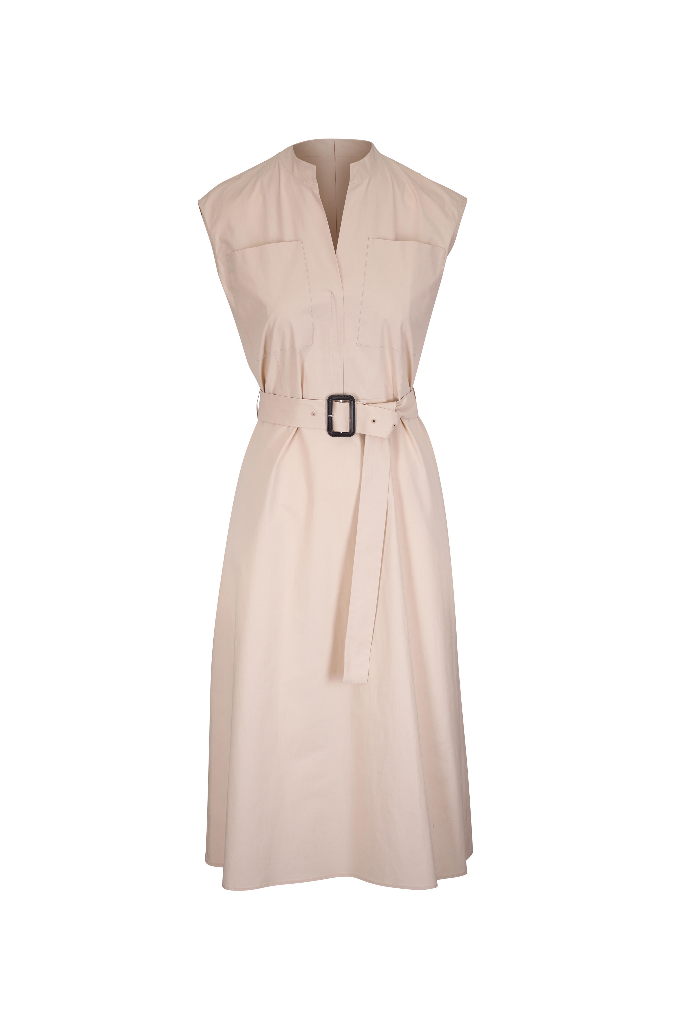 Spread collar; v-neckline. Removable, self-tie belt. Cap sleeve. Chest patch pockets; lower side seam pockets. Made in Italy. 46" shoulder to hem. 95% cotton, 5% elastane. Hand wash.