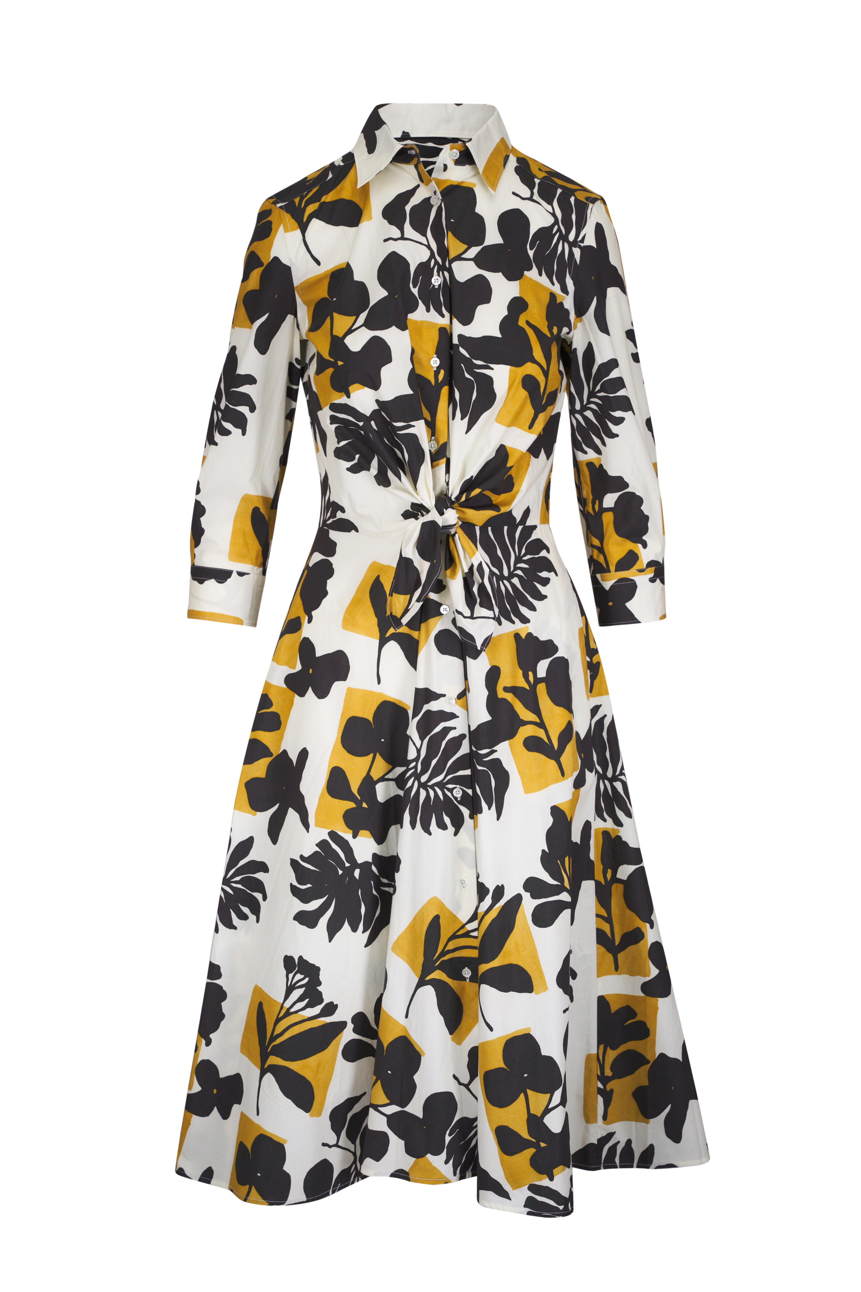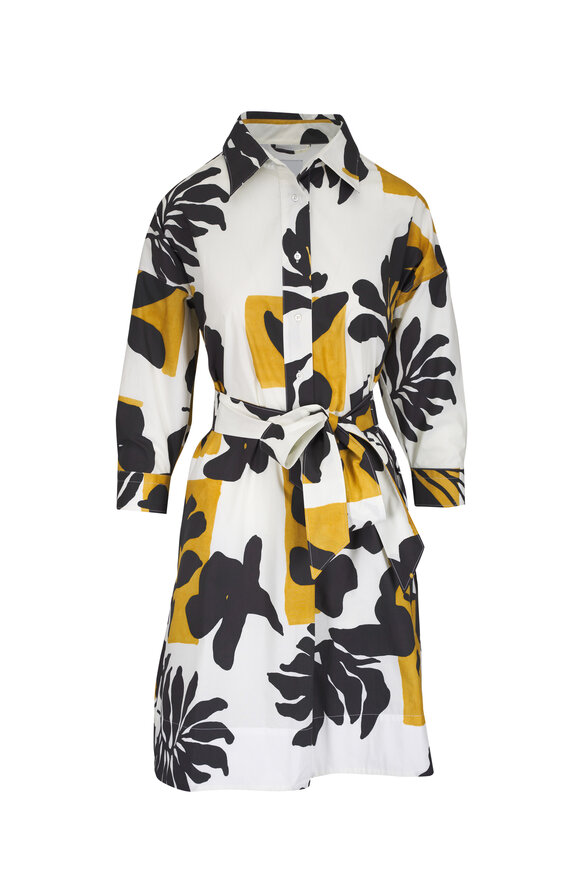 Spread collar. Front button placket. Self-tie waist. Three-quarter length sleeves. Single button mitered cuffs. On-seam pockets. Made in Italy. Approx. 50" shoulder to hem (size 4). 100% cotton. Hand wash.