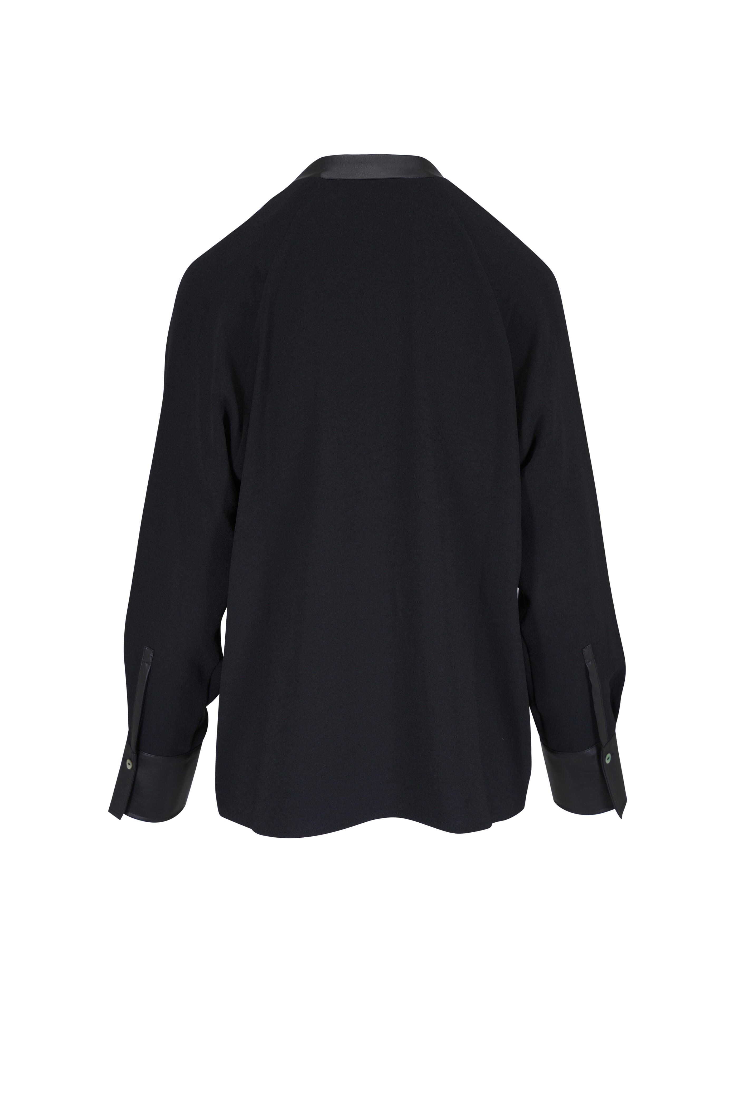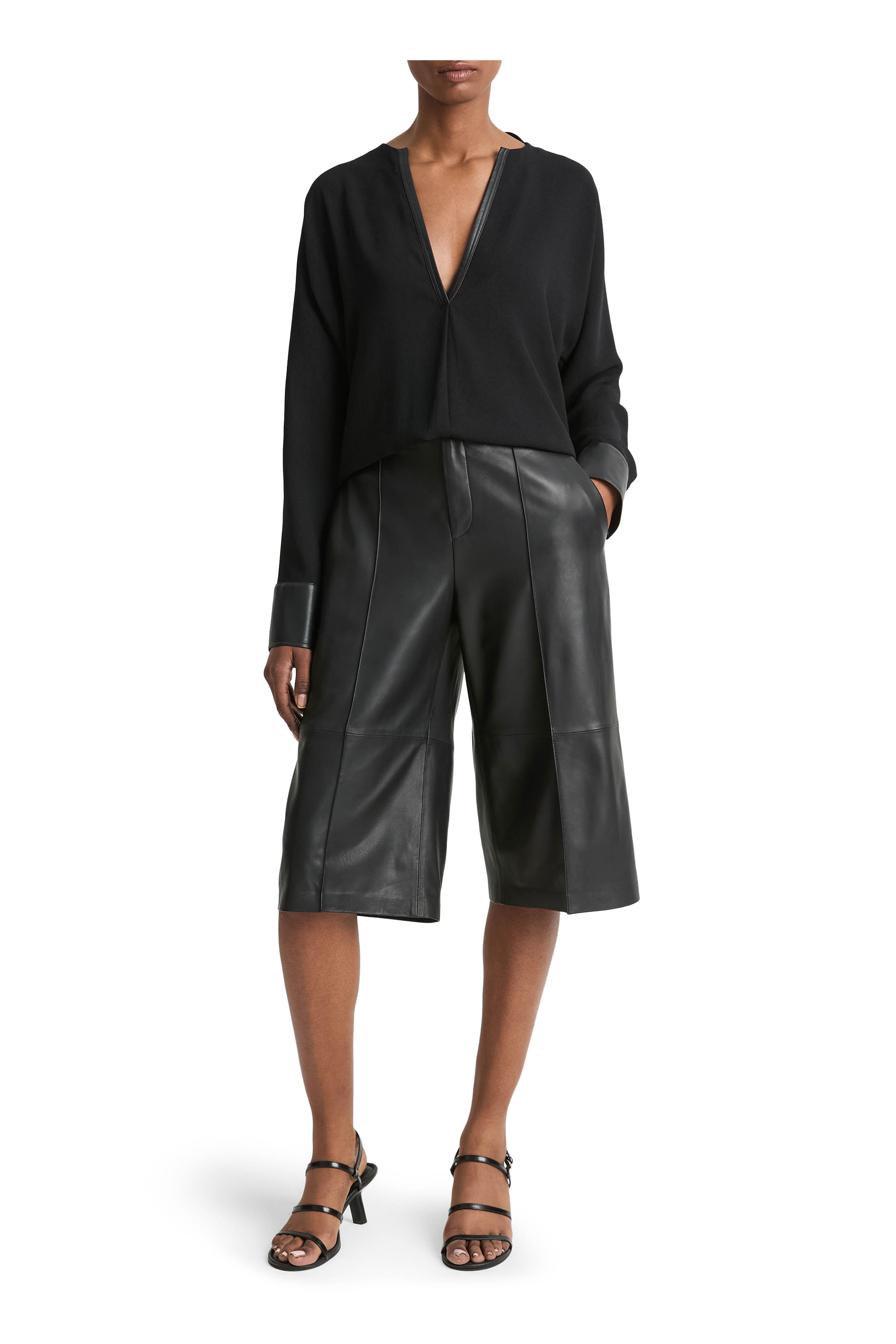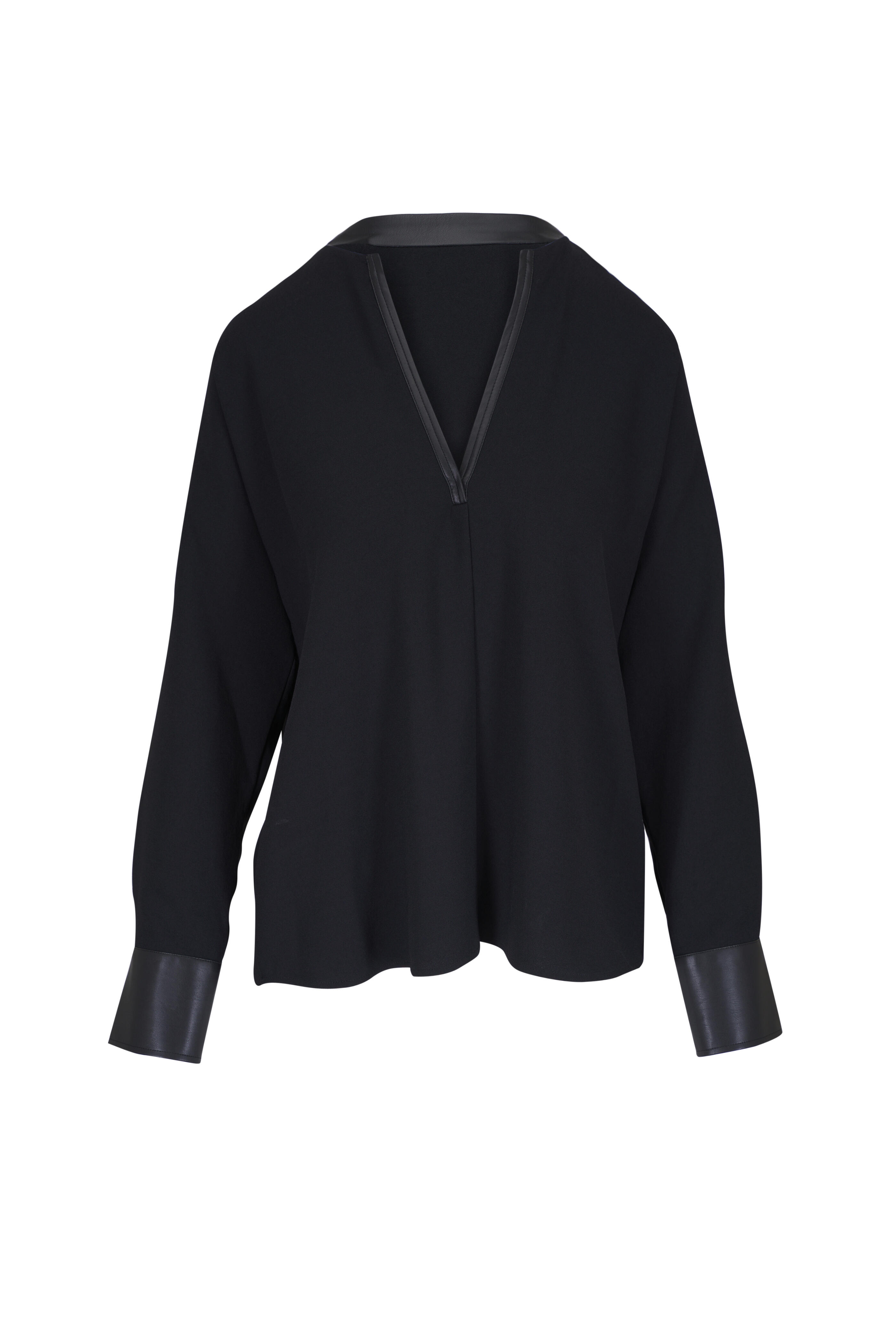 Deep v-neckline. Slip over style. Single button cuffs. Faux leather cuffs and trim. Imported. 100% polyester. Hand wash.