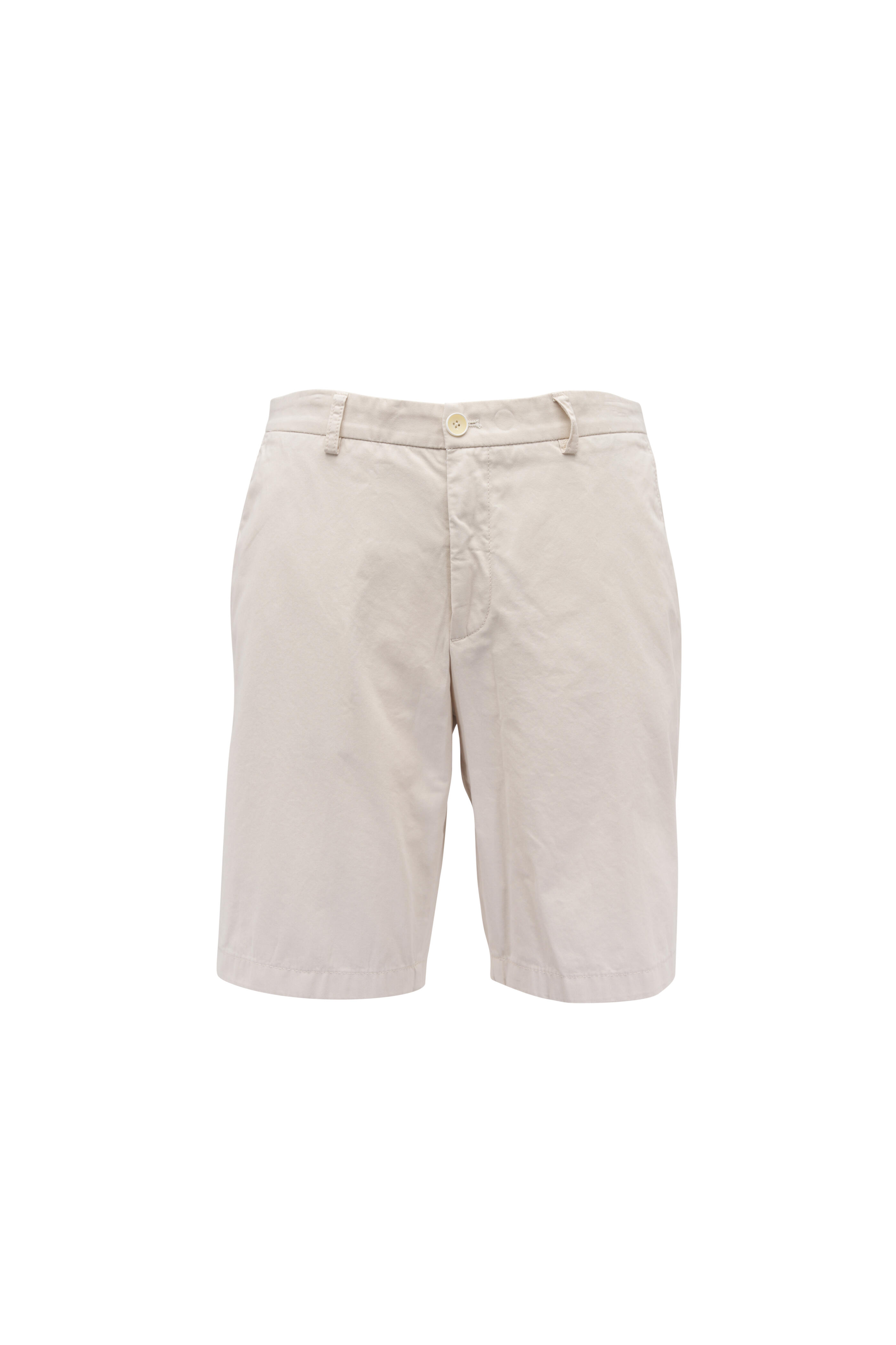 Zip fly; button closure. Banded waist; belt loops. Side slash pockets; back welt button pockets. Imported. 10" inseam. 100% cotton. Machine wash.
