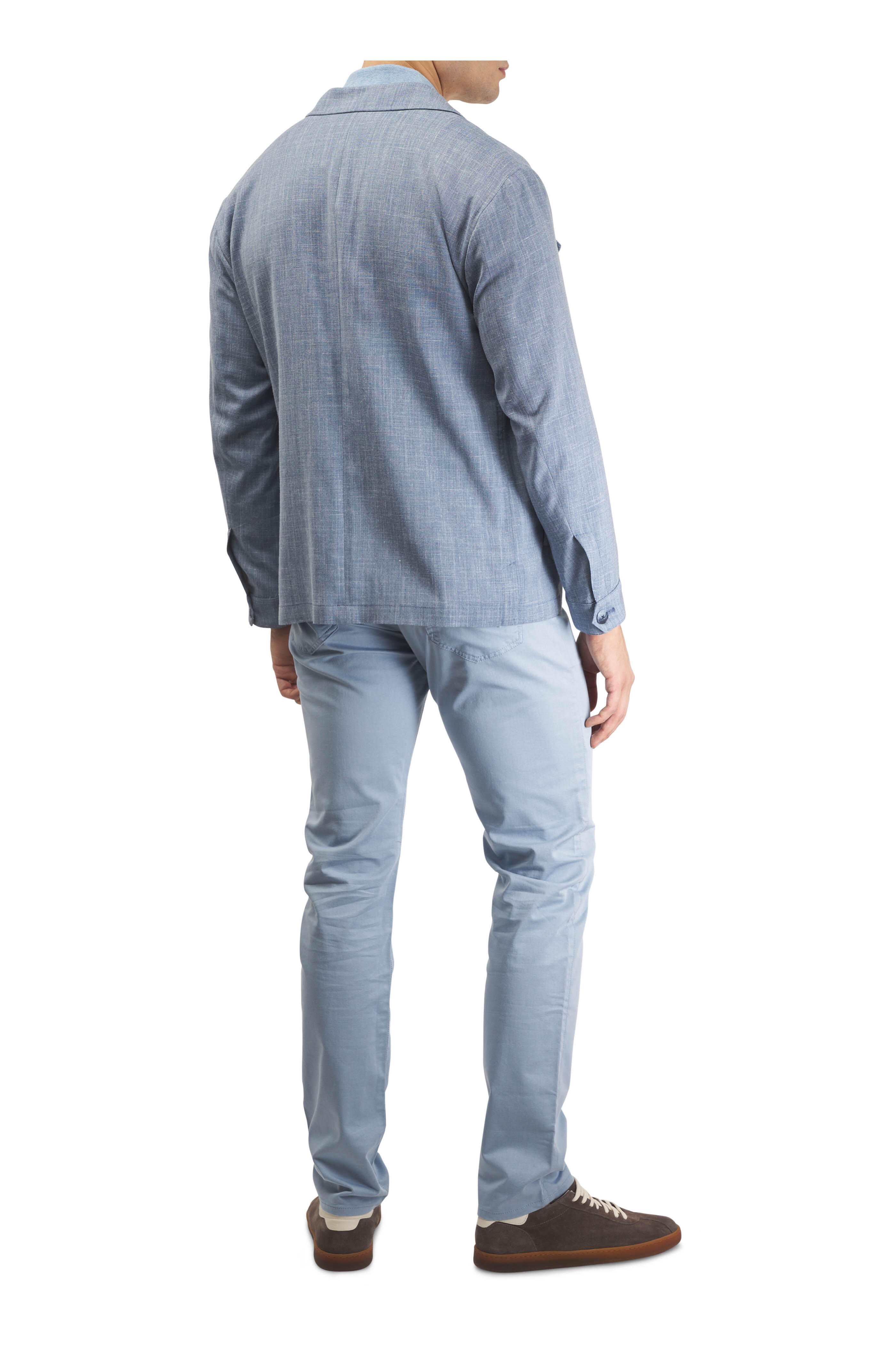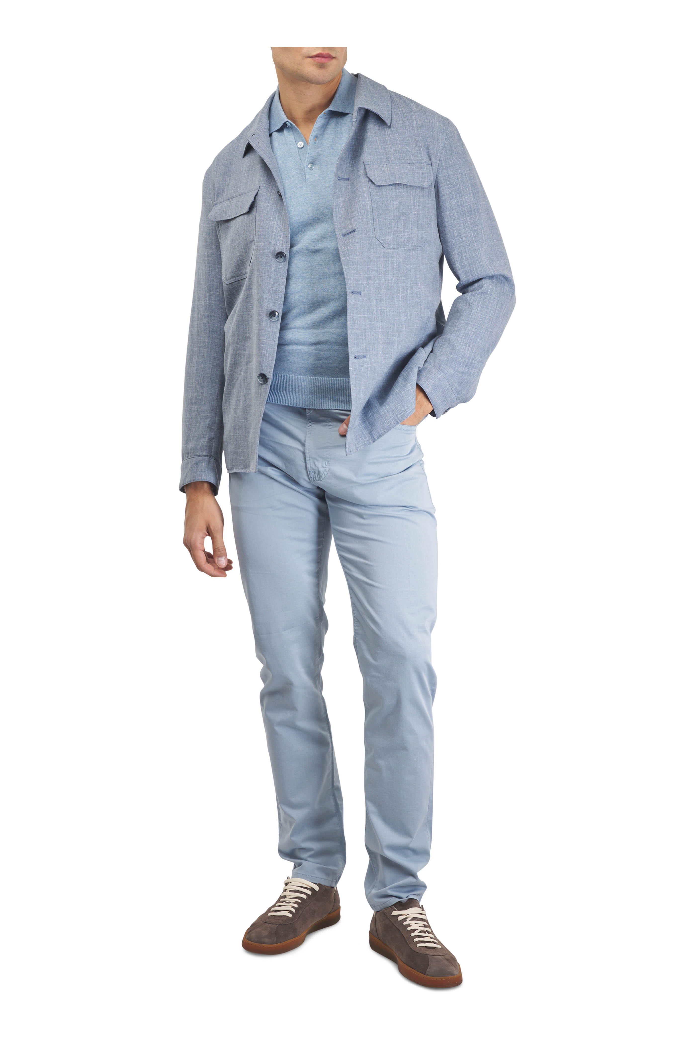 Banded waist; belt loops. Zip fly; button closure. Five pocket styling. Fabric from Italy. Inseam: 33". 53% cotton, 44% polyester, 3% elastane. Machine wash.