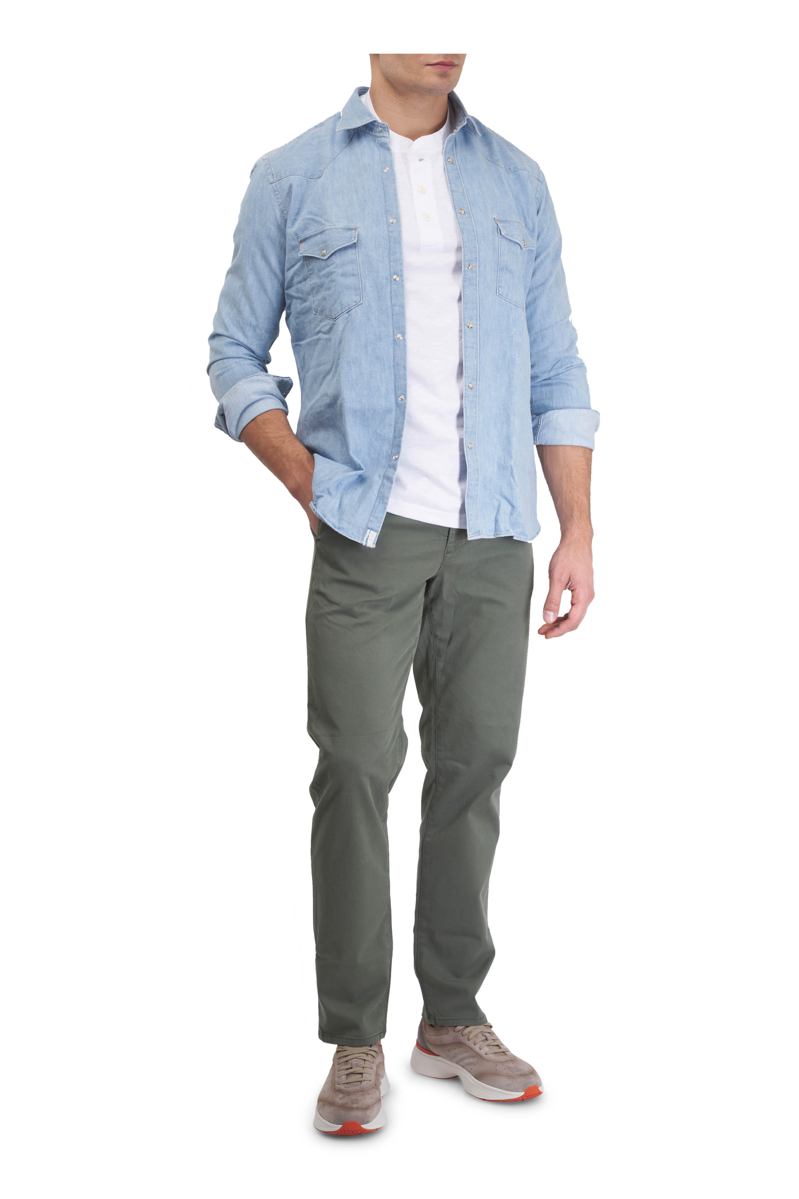 Zip fly; button closure. Front slit pockets; back button welt pockets. Straight hem. Imported. Inseam 31". 68% cotton, 27% lyocell, 5% elastane. Machine wash.