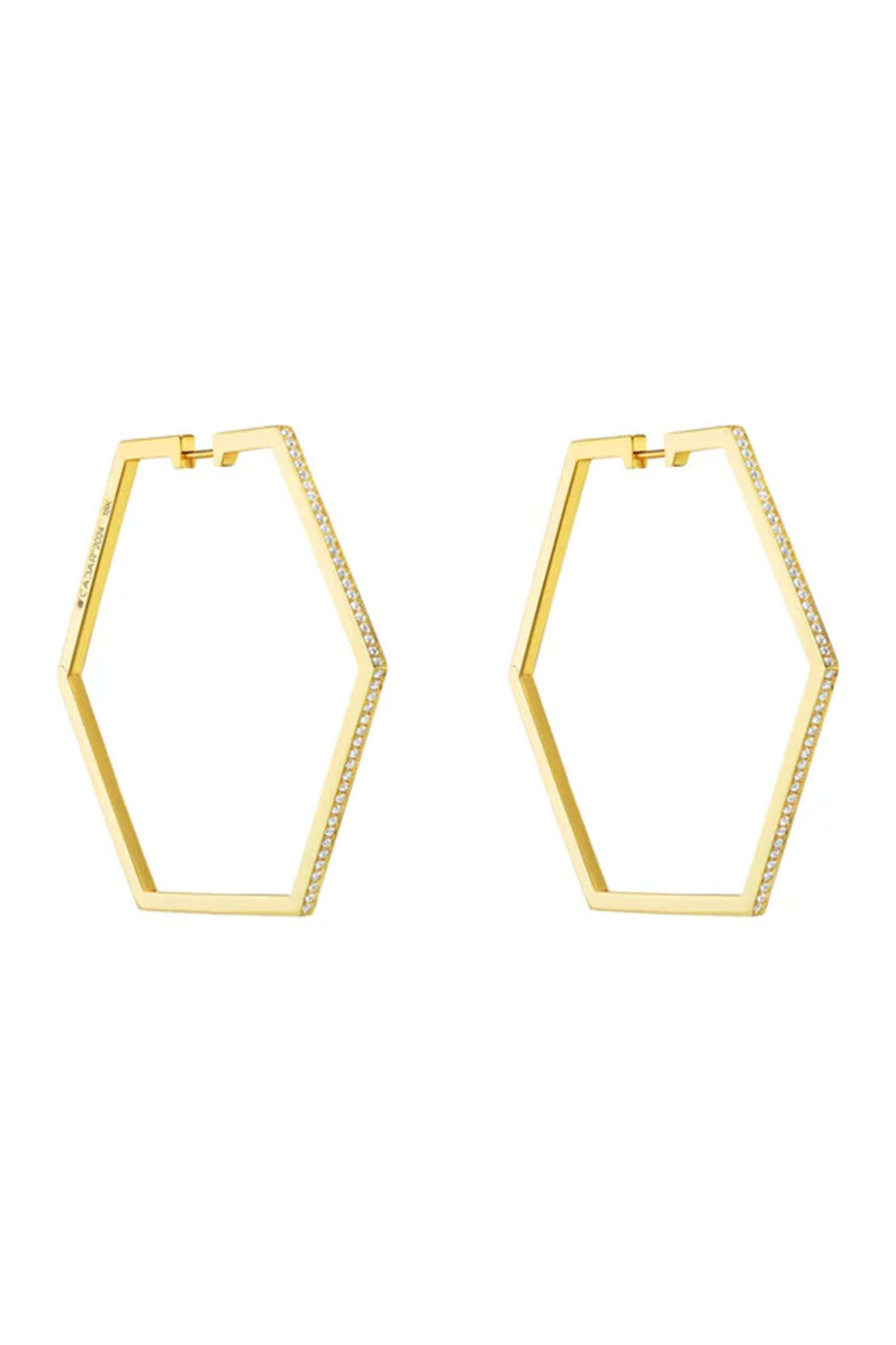 18k gold. Diamond 0.50 total carat weight. White diamond. Hexagon design. Post backs with push latch closure. Made in Italy. 1.96" D.