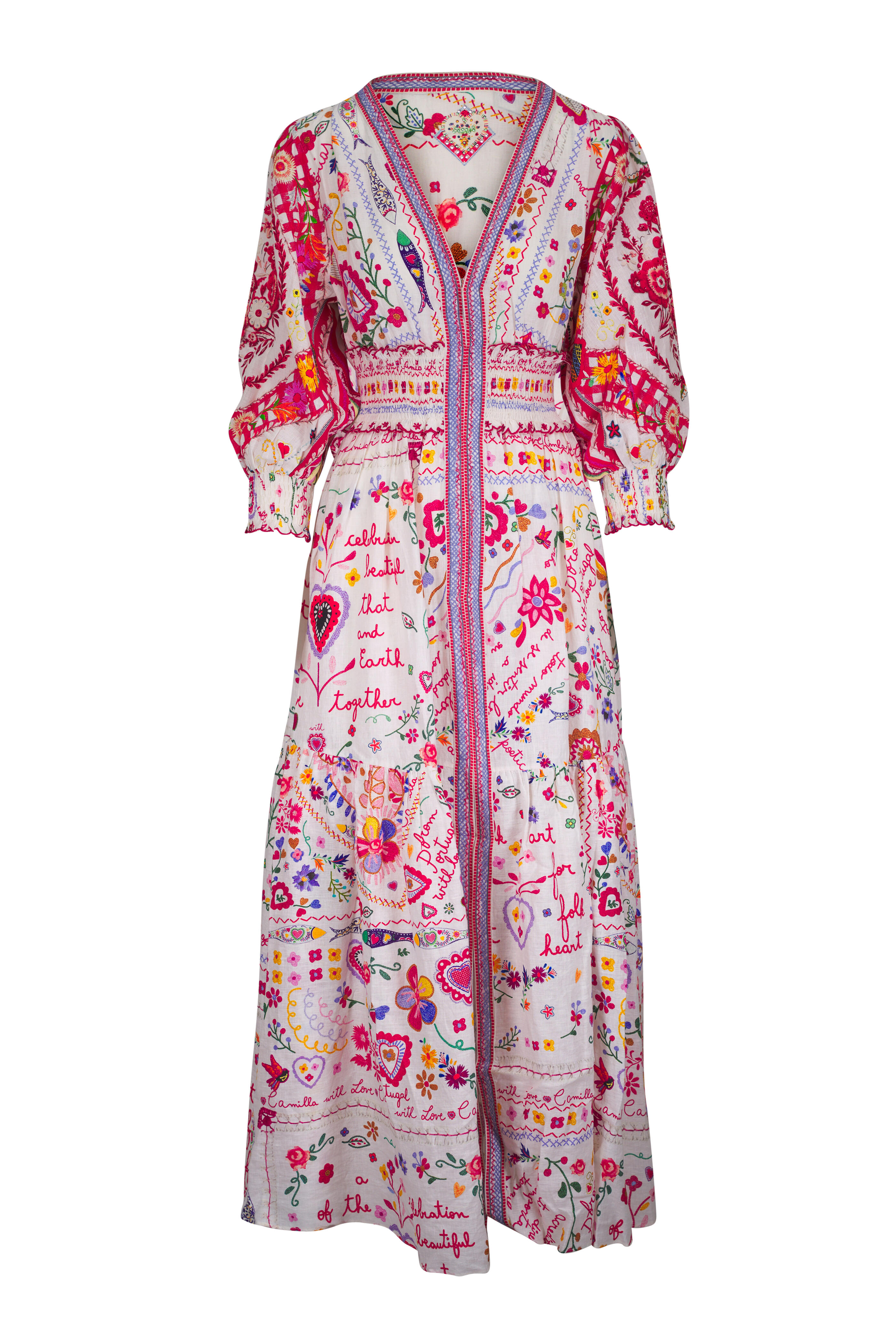 V-neckline. Front hook & eye closure. Shirred waist & cuffs. Front slit. Imported. 100% linen. Dry clean.