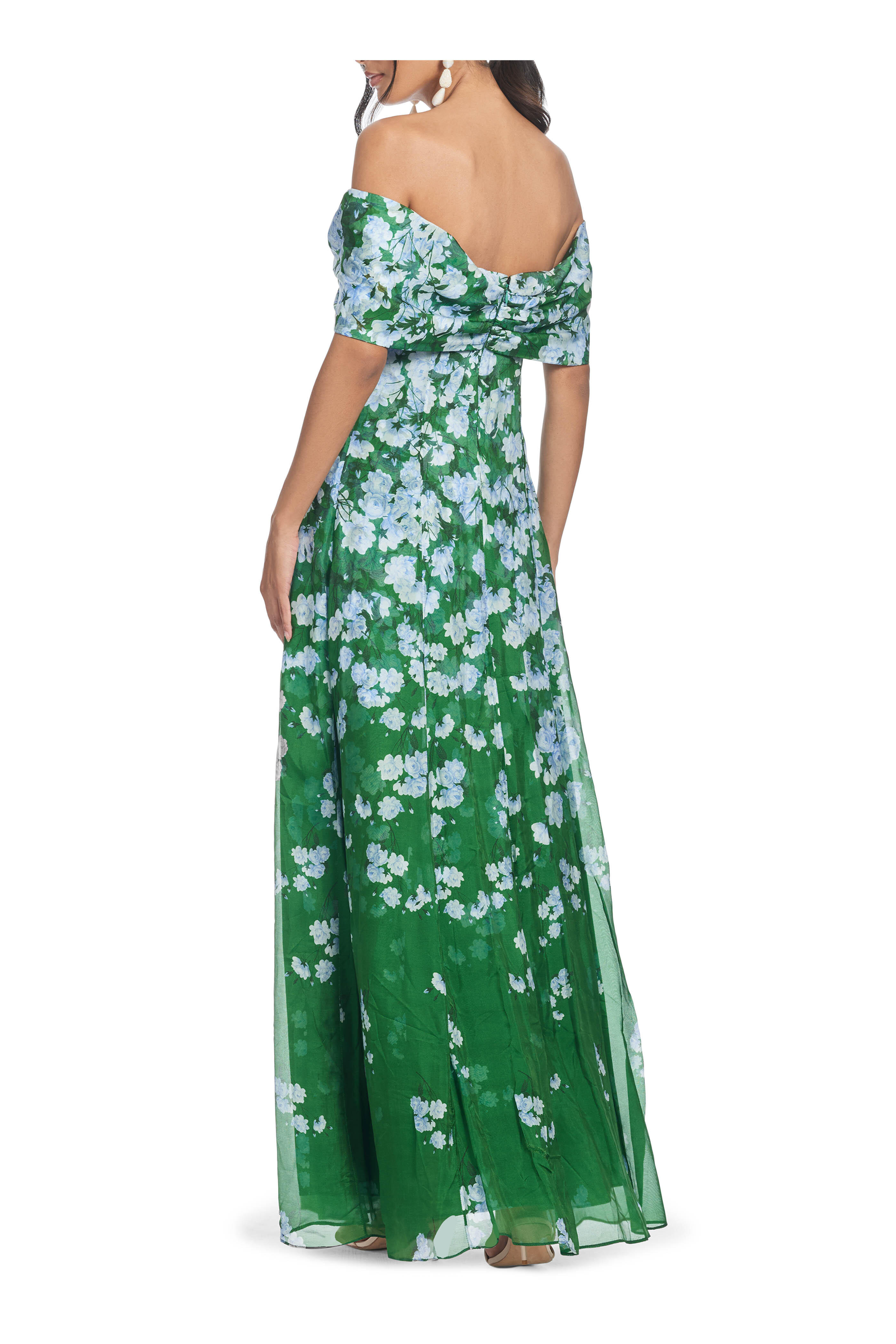 Off the shoulder neckline. Back zip closure. Imported. Approximately 61 ½" shoulder to hem. 74% viscose, 26% silk; lined. Dry clean.