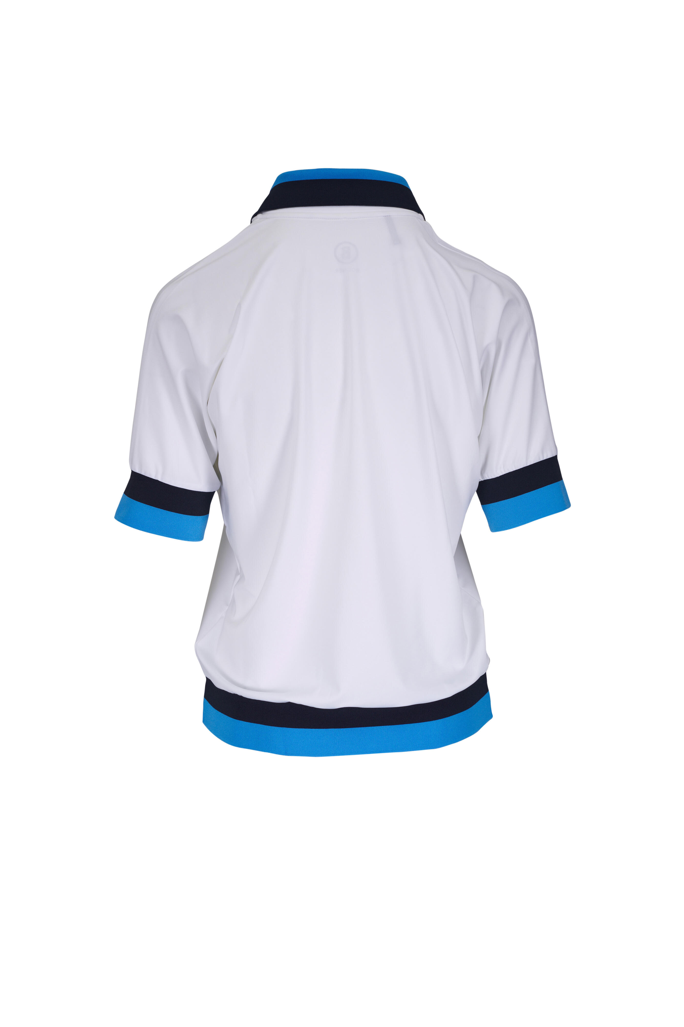 Spread collar. Partial front zip placket. Overcut shoulders. Stretch, ribbed trim. Imported. 85% polyester, 15% elastane. Machine wash.