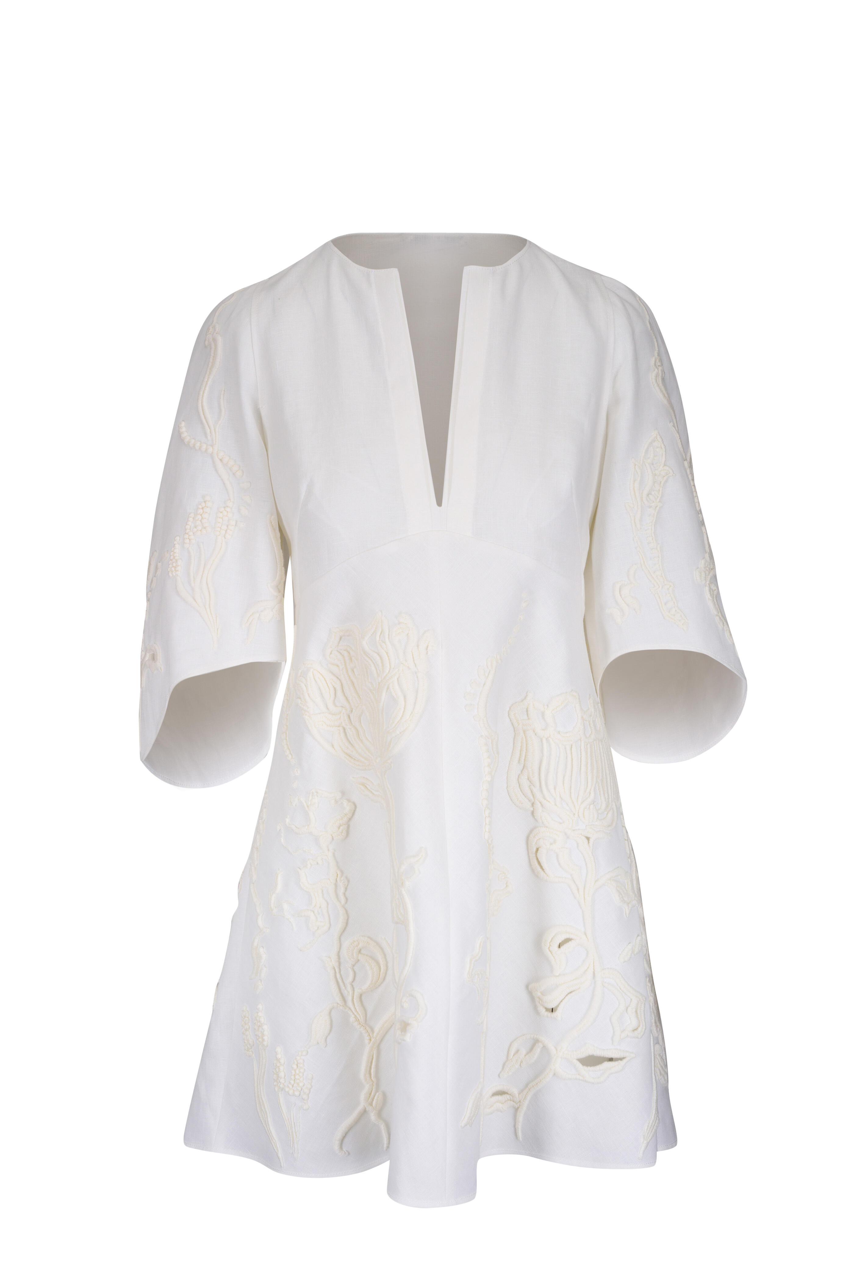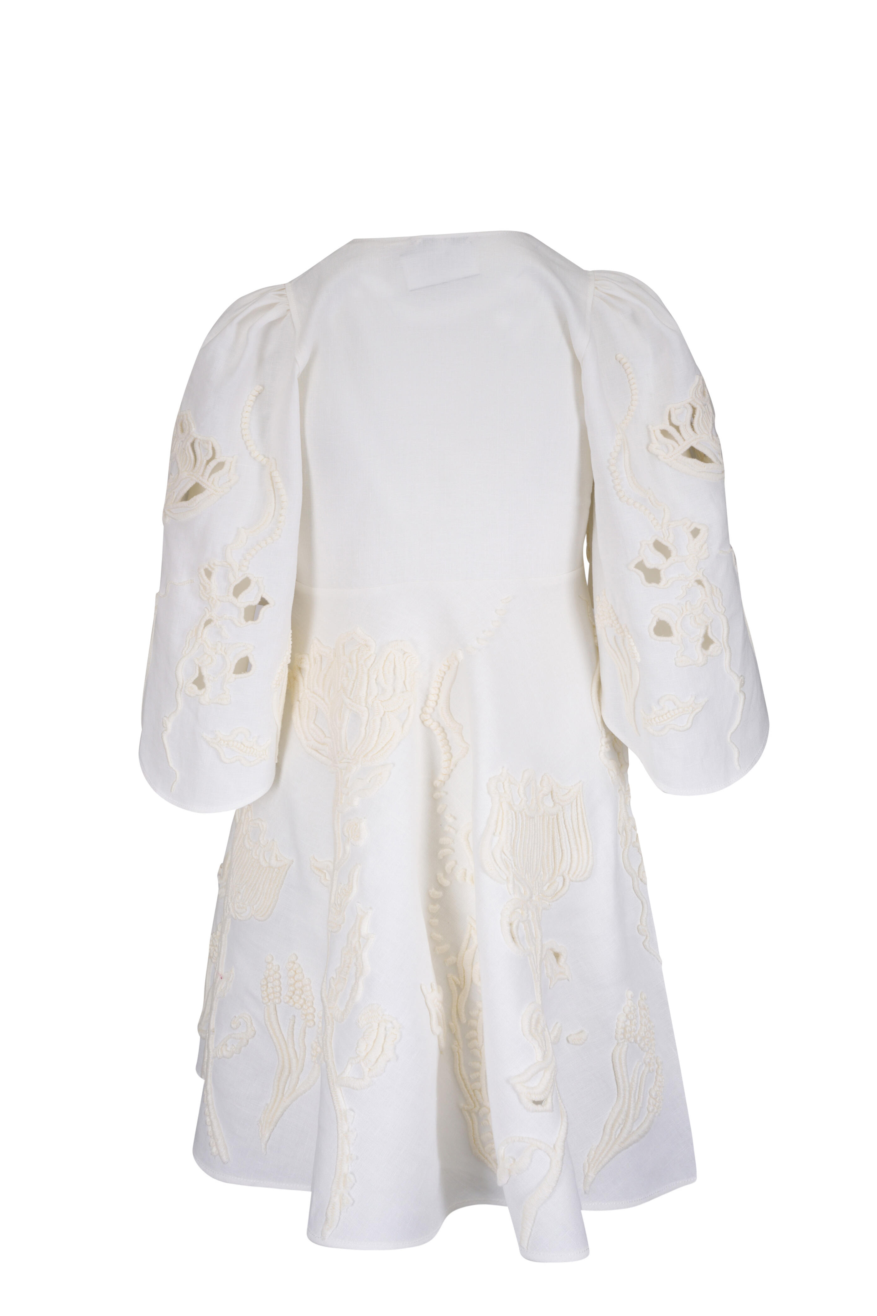 Split v-neckline. Crepe puff sleeves. Circle skirt. Raw finish hemline and cuffs. Imported. Flared hem. Loose fit. Mini length. 100% linen. Hand wash.