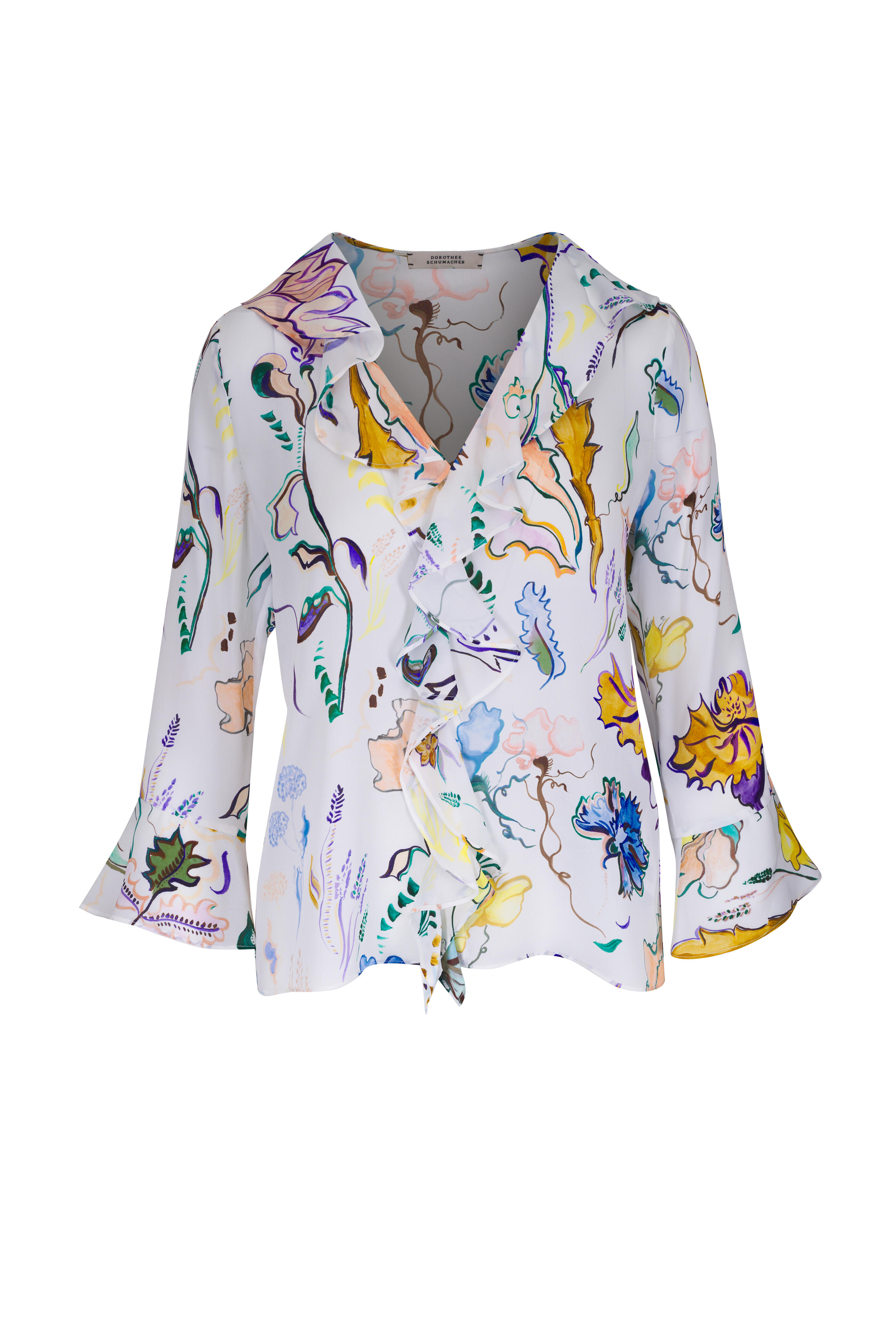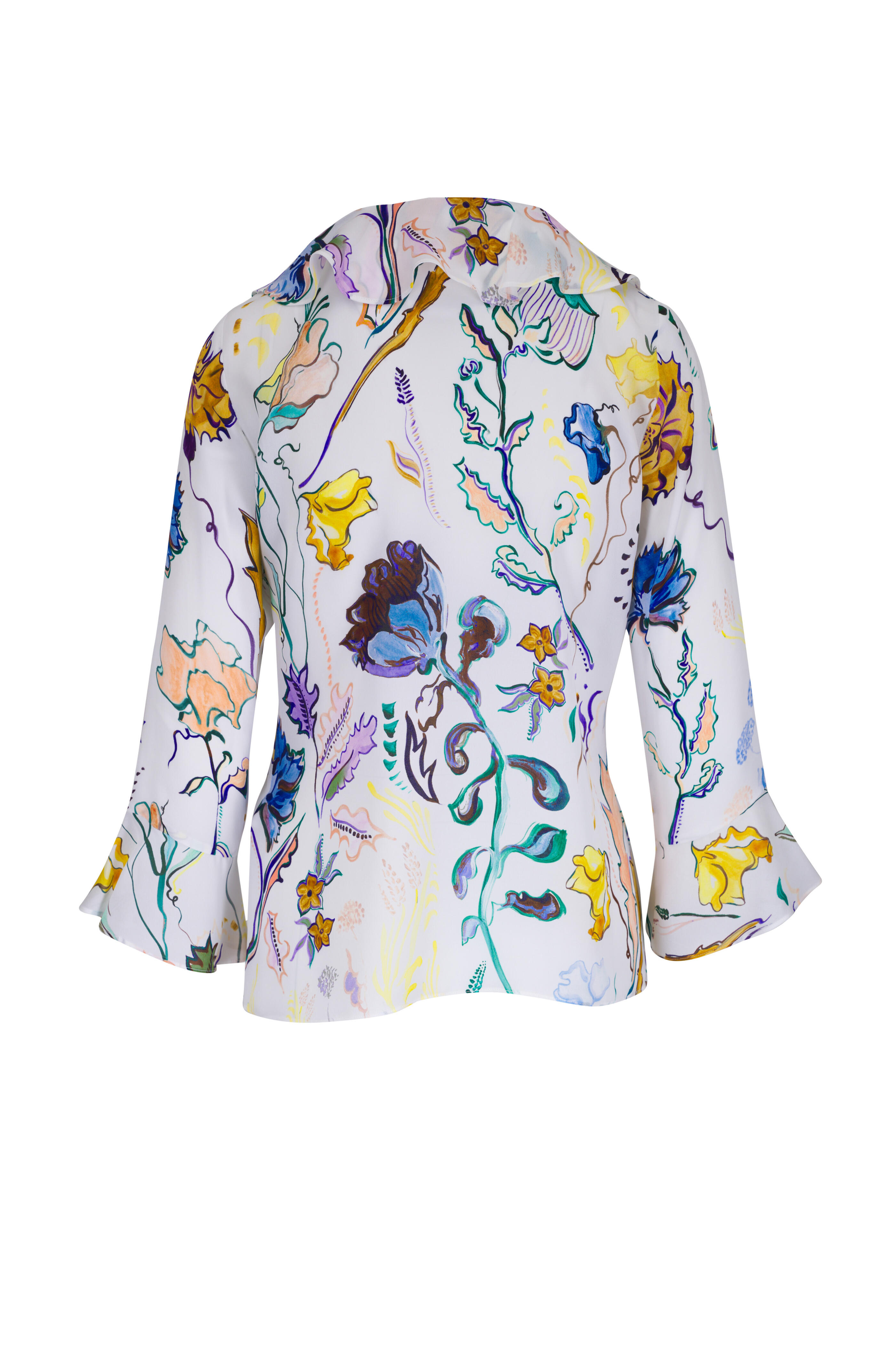 V-neckline. Concealed button placket. Ruffle cuffs. Front ruffle detail. Imported. 100% silk. Hand wash.