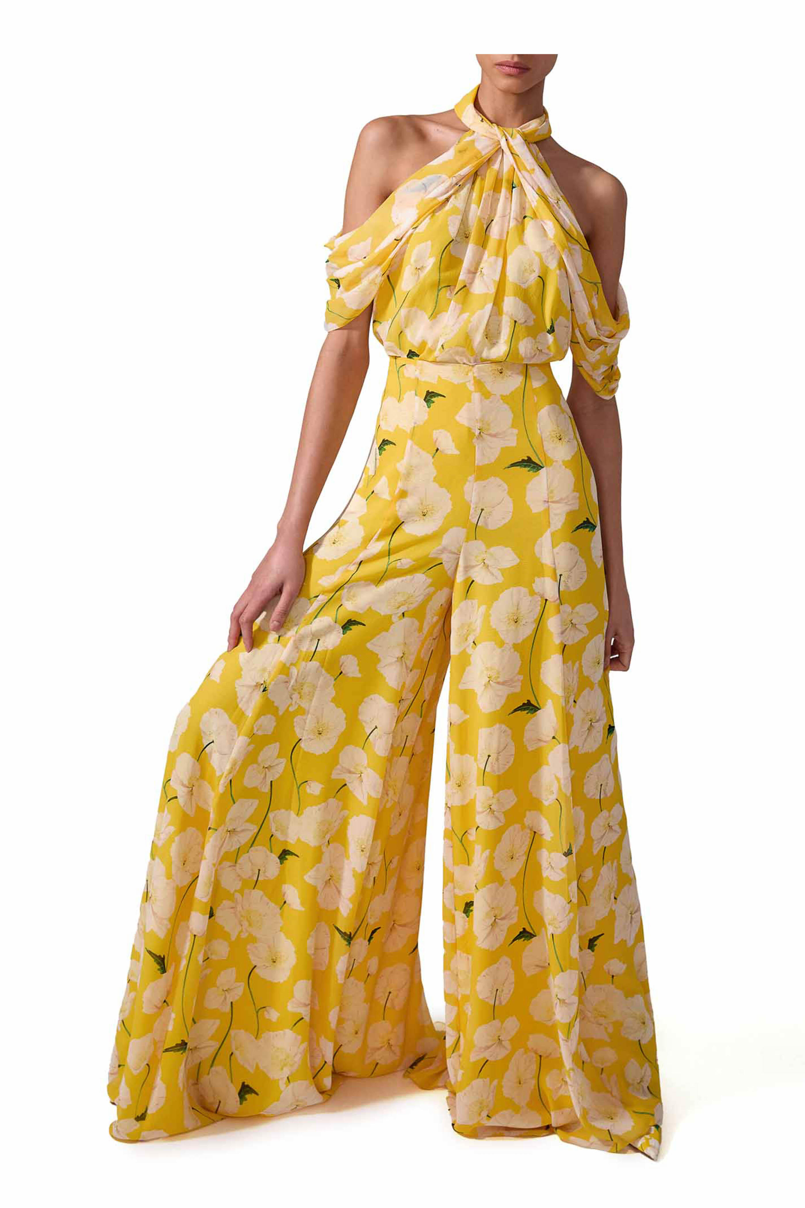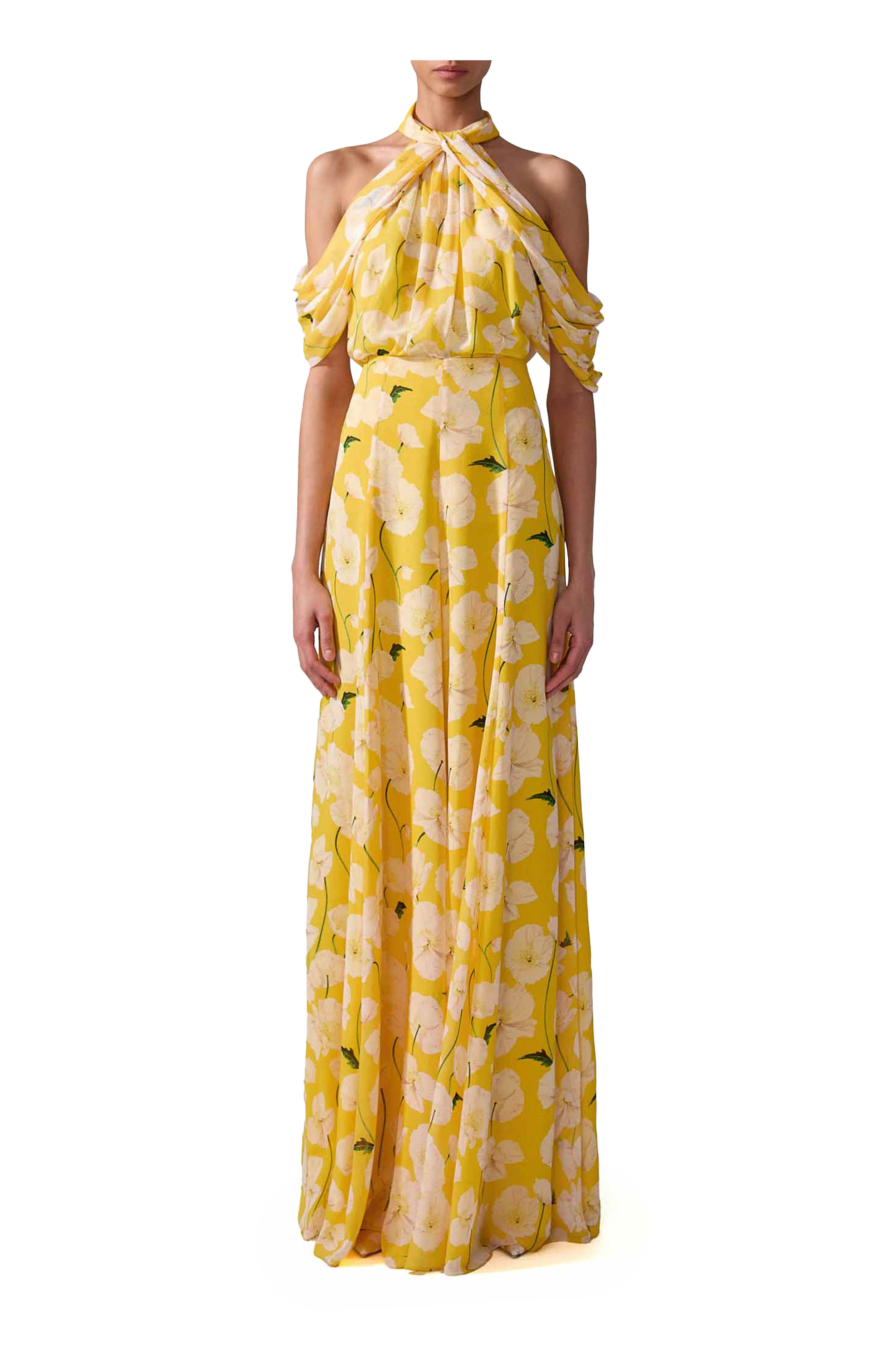 Halter neckline. Concealed back zip; hook-and-eye closure. Draped off-the-shoulder sleeves. Made in the USA. Approximately 25" shoulder to hem (measurements taken from size 4). 100% silk; lined. Dry clean.