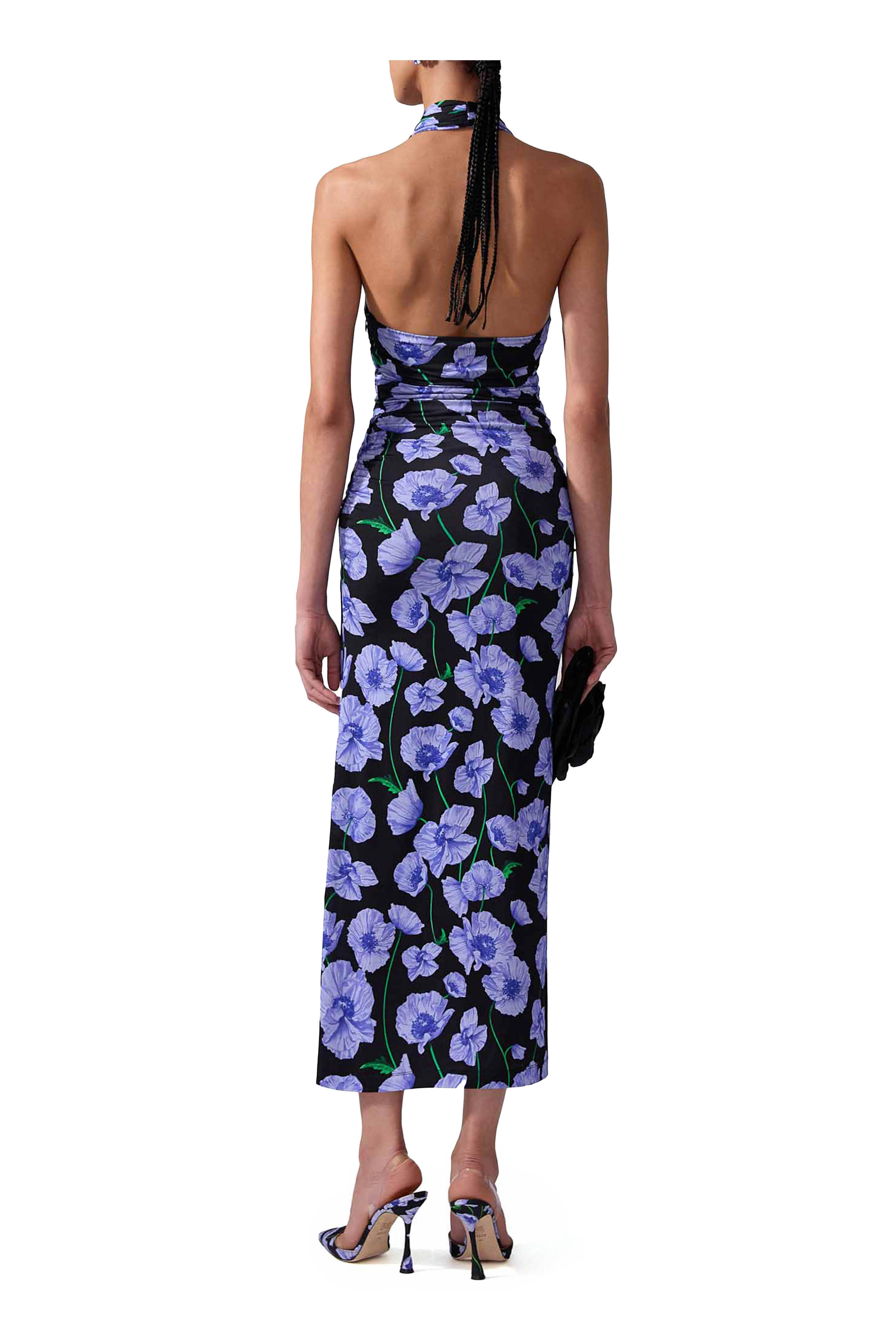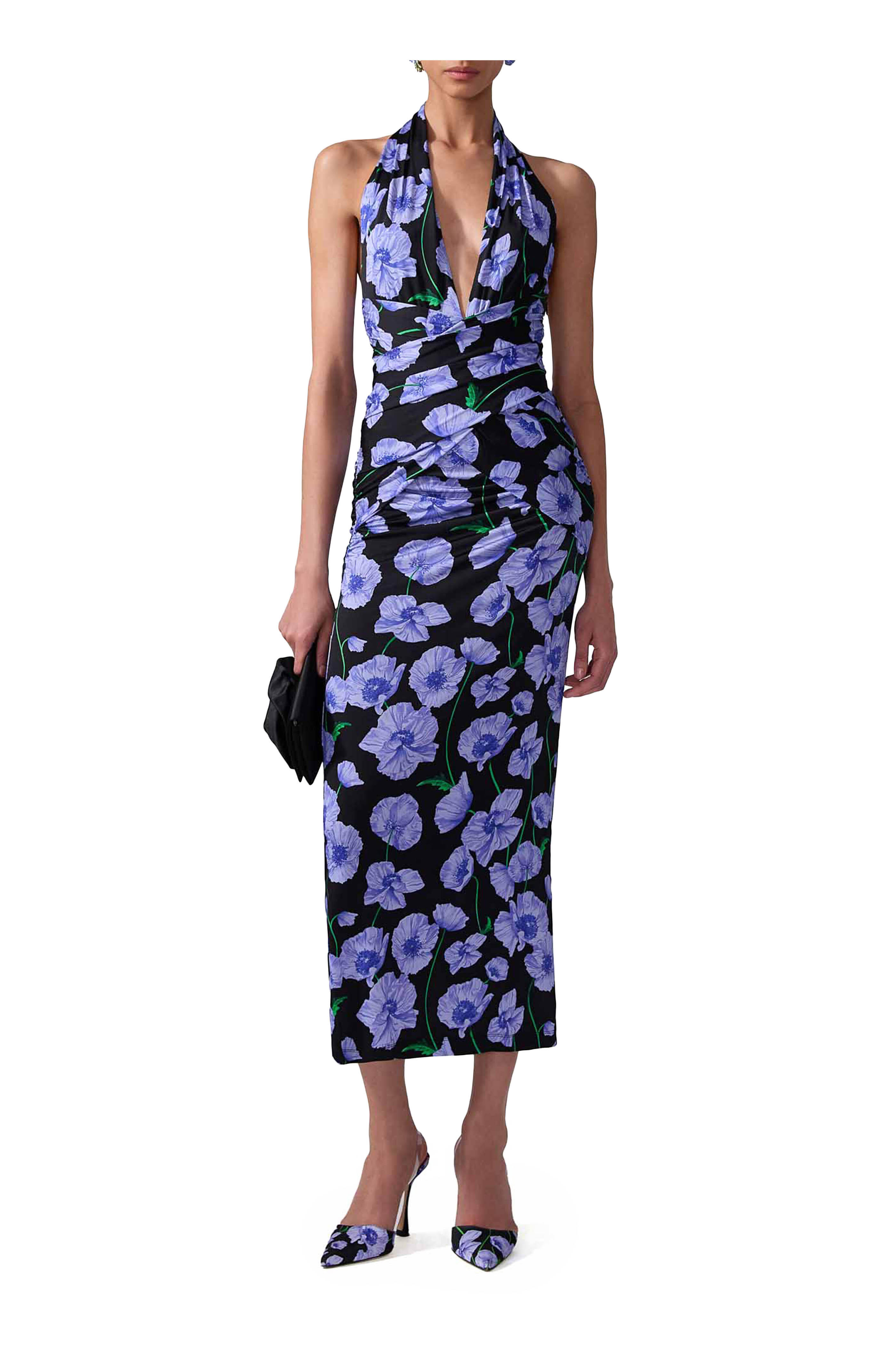 Halter; v-neckline. Concealed side zip closure. Gathered waist. Lightweight stretch-jersey. Imported. Midi length. 90% viscose, 10% elastane. Dry clean.