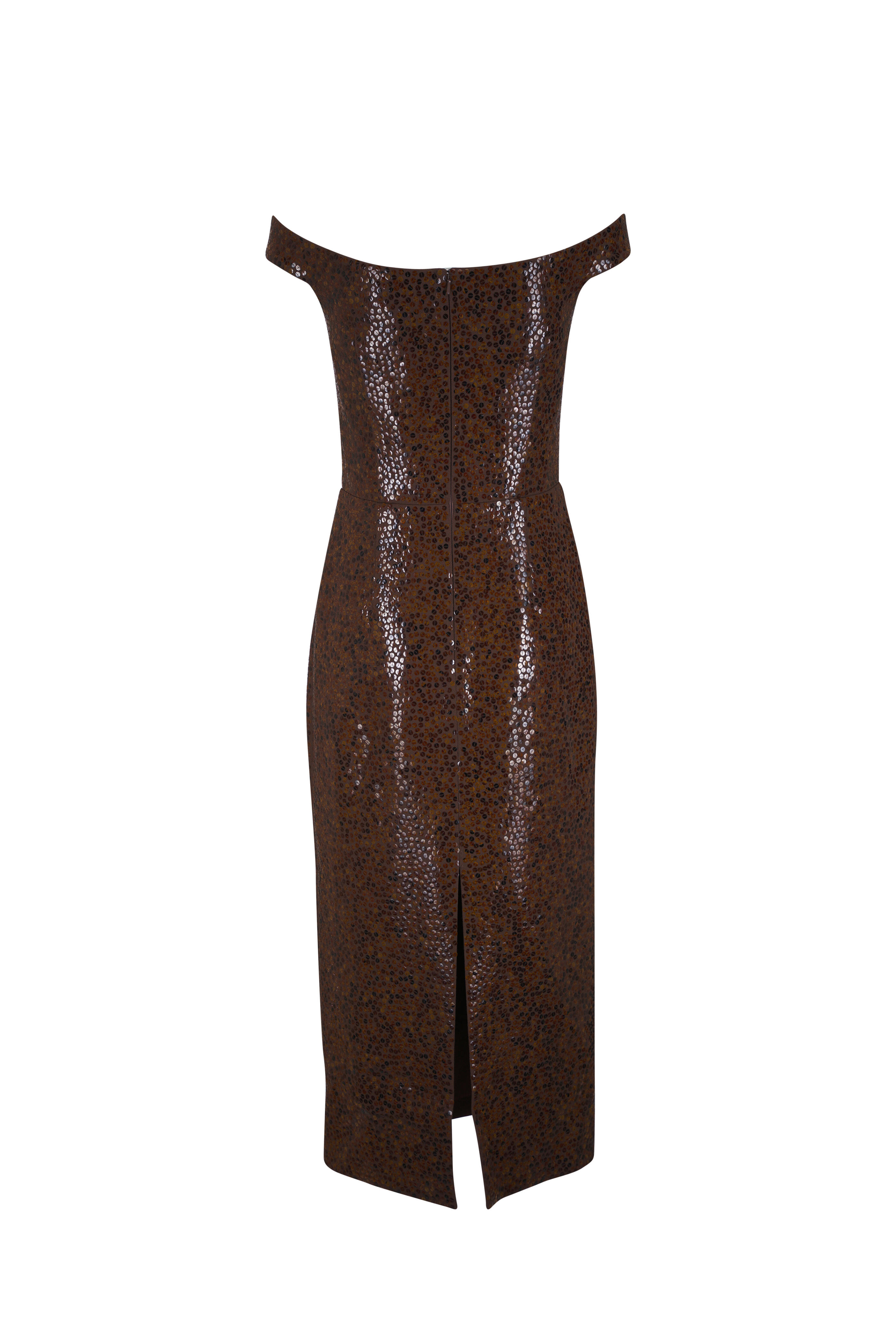 Off-the-shoulder neckline. Concealed back zip closure. Sheath Silhouette. Back slit. Made in Italy. Shoulder to hem 49" (size 6). 96% pure virgin wool, 3% nylon, 1% elastane; fully lined. Dry clean.