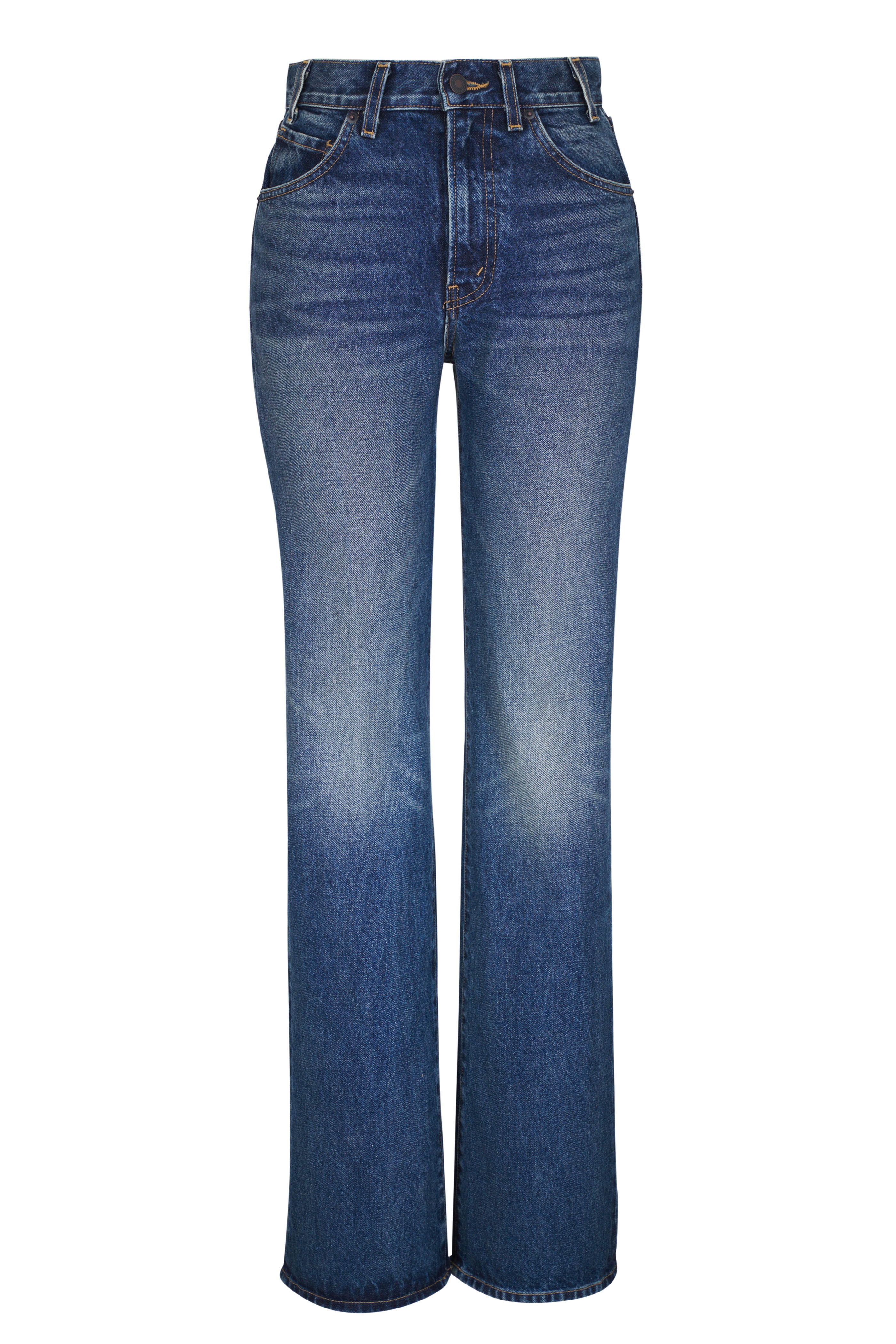 Zip fly; button closure. Banded waist; belt loops. Five-pocket style. Straight hem. Made in the USA. Inseam 35" (size 25). 100% cotton. Machine wash.