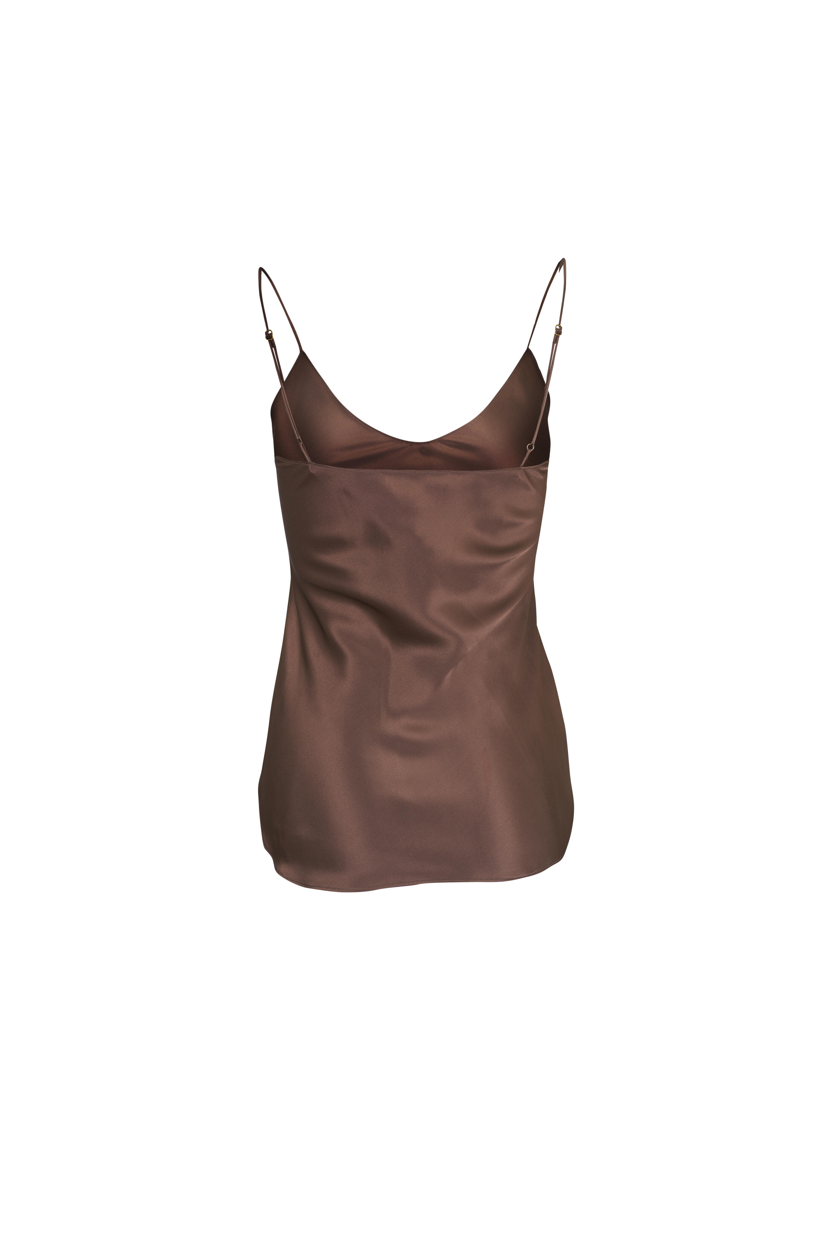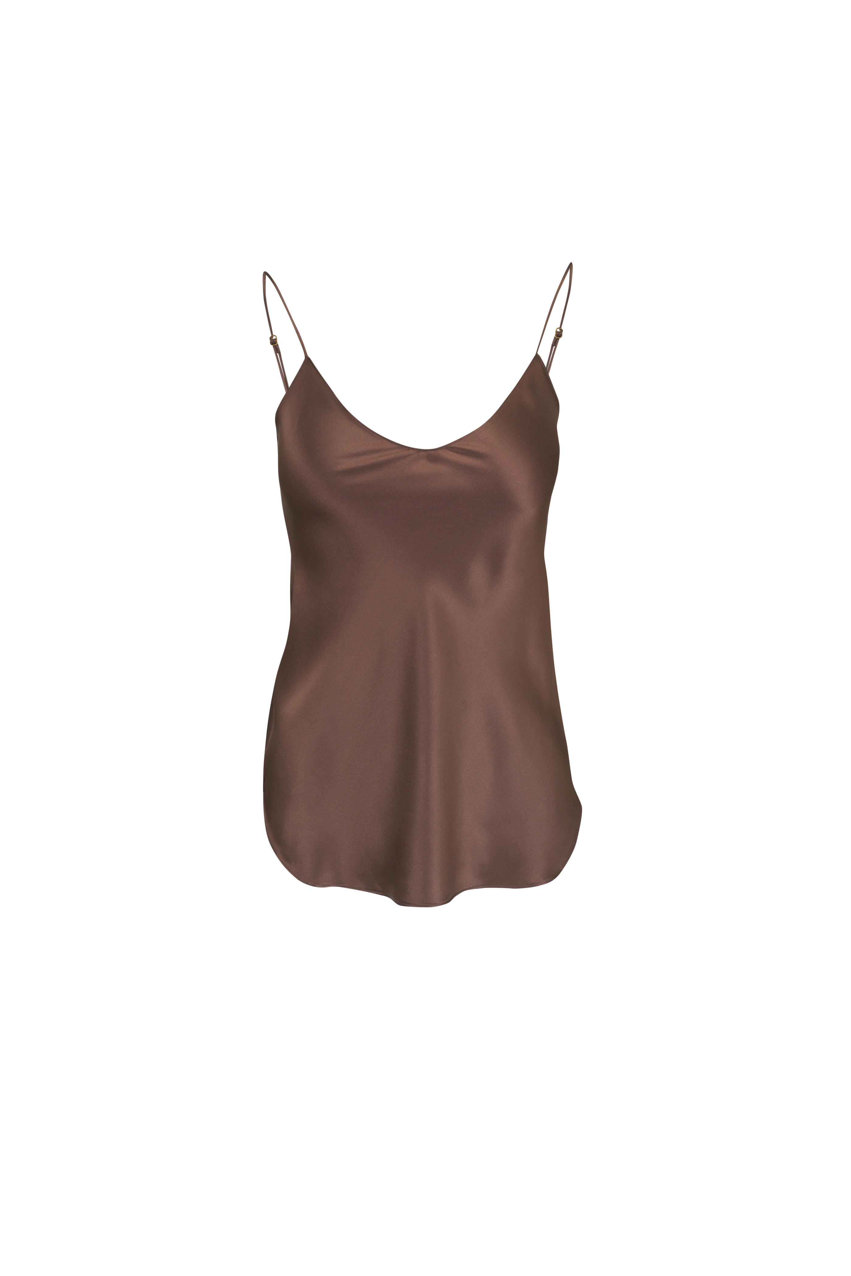 V-neckline. Adjustable spaghetti straps. Curved hem. Made in the USA. 100% silk. Dry clean.